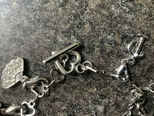 Silver tone heart link multi charm bracelet 10 detachable interchangeable charms