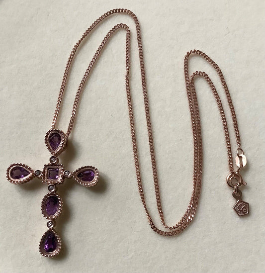 Clogau 9ct Amethyst and Diamond rose gold cross pendant necklace 18"
