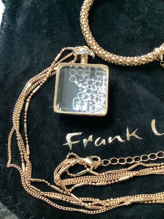 FRANK USHER perfume bottle crystal filled necklace bracelet & earrings set gold