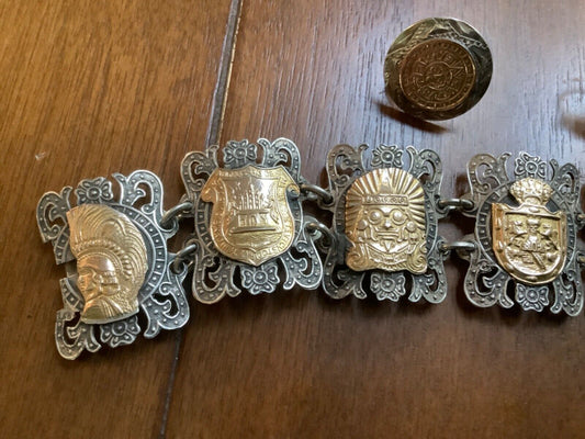 Vintage Mexico 925 silver and gold Mayan Calendar Aztec shield design bracelet & screw back earrings set vintage