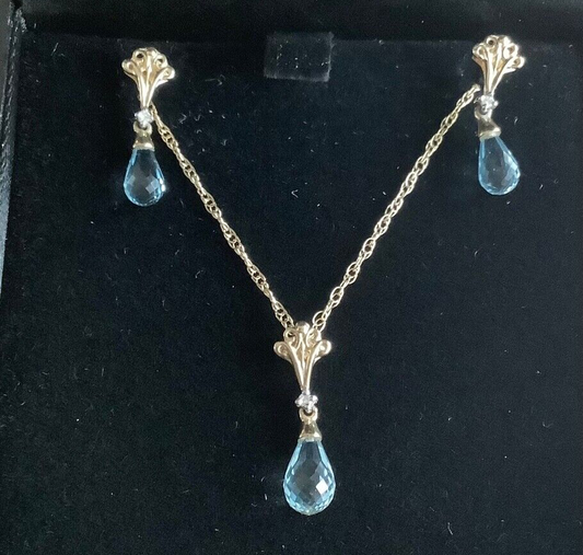 9ct aquamarine and diamond briolette cut earrings & 18” necklace set yellow gold