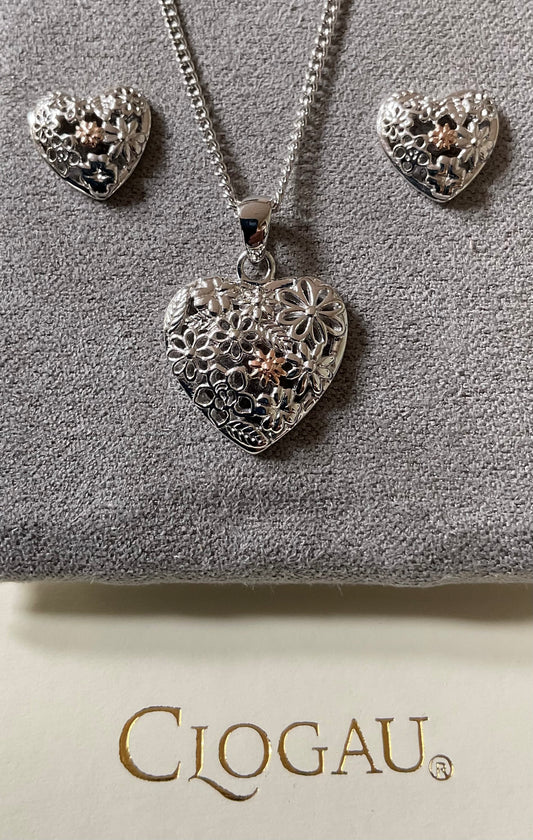 Clogau Floral Heart earrings and necklace set 16-18” Rare silver and rose gold