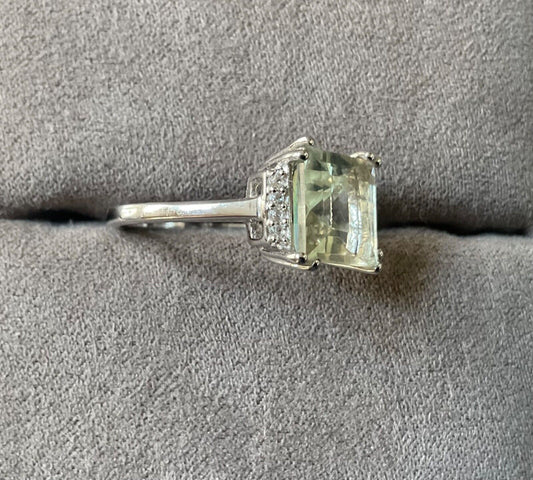 925 Green Amethyst & Zircon square cut ring size P sterling silver