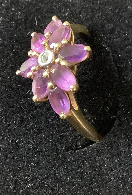 Amethyst and clear stone gold overlay 925 sterling silver floral ring T