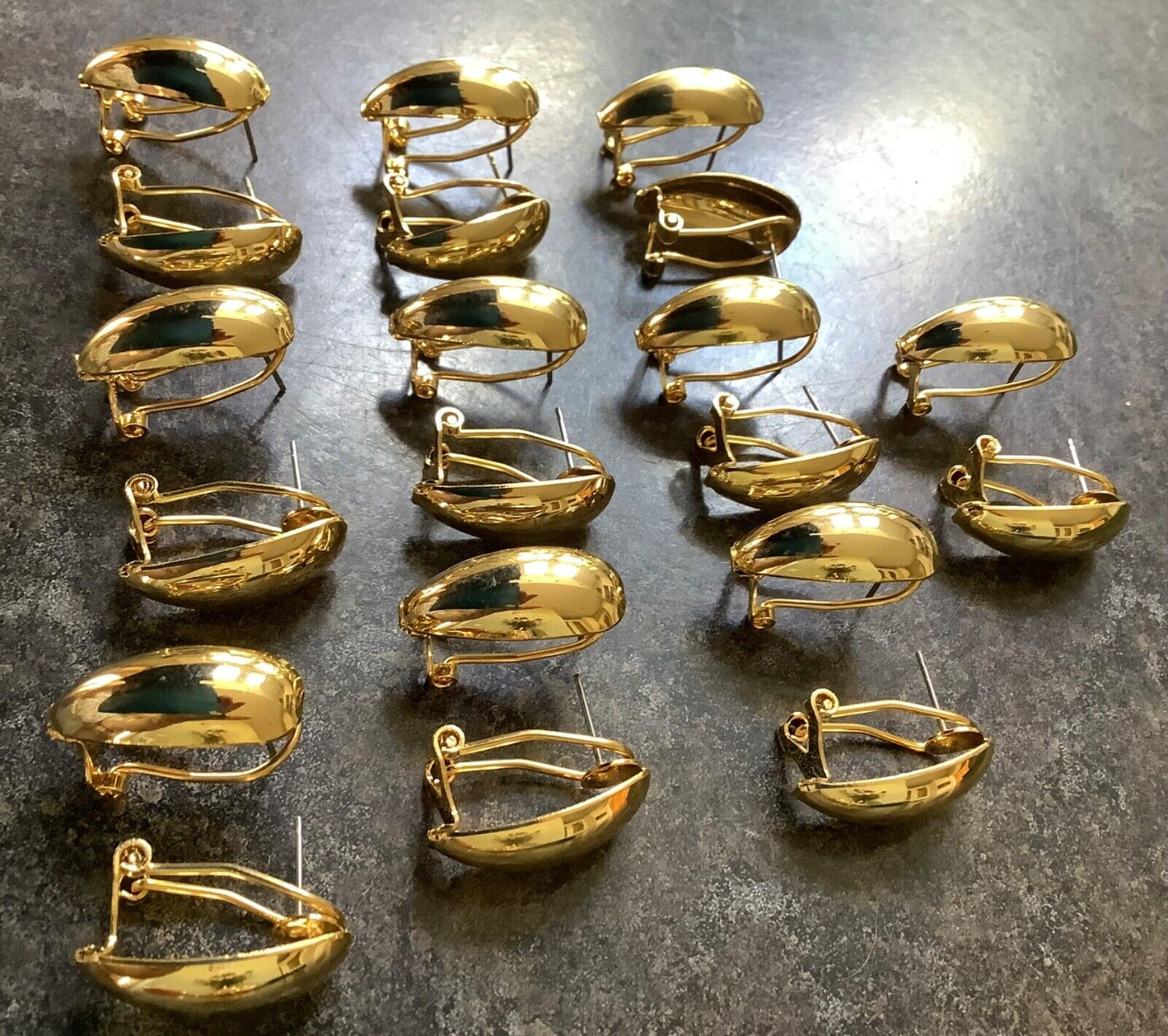 These are lovely, elegant earrings measuring 2.2cm in length and 1cm across at the widest. They are brand new, so in new condition. I have quite a lot of these for sale and am selling them in bundles of 10. If you’d like more, I’m happy to combine the postage. I have no idea what metal they are made from but they are definitely costume jewellery. They would be no good for someone with allergies to non silver/gold jewellery. The surface is a highly polished gold tone which is very difficult to photograph due to the reflections. They have a clip back with a post, so are for pierced ears only but the clasp makes them very secure and avoids loosing butterfly backs. They are very lightweight, so comfortable enough to wear all day!
