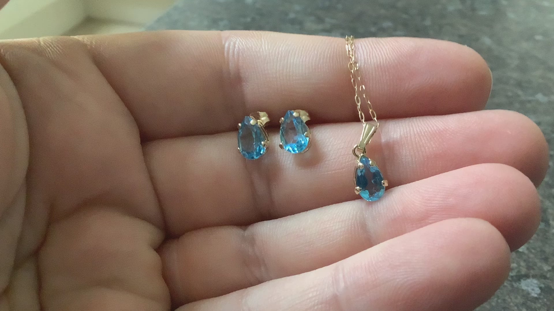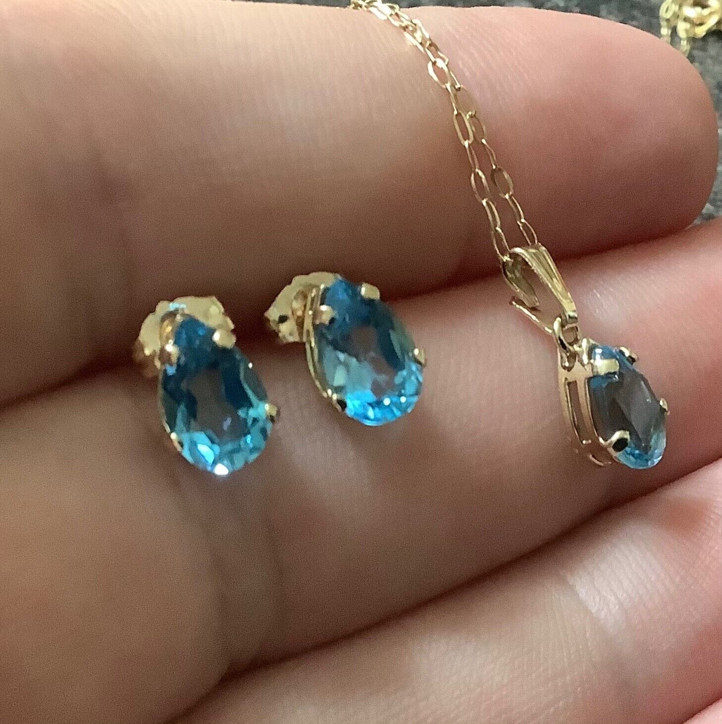 10K Blue topaz pendant 16” necklace and stud earring set yellow gold