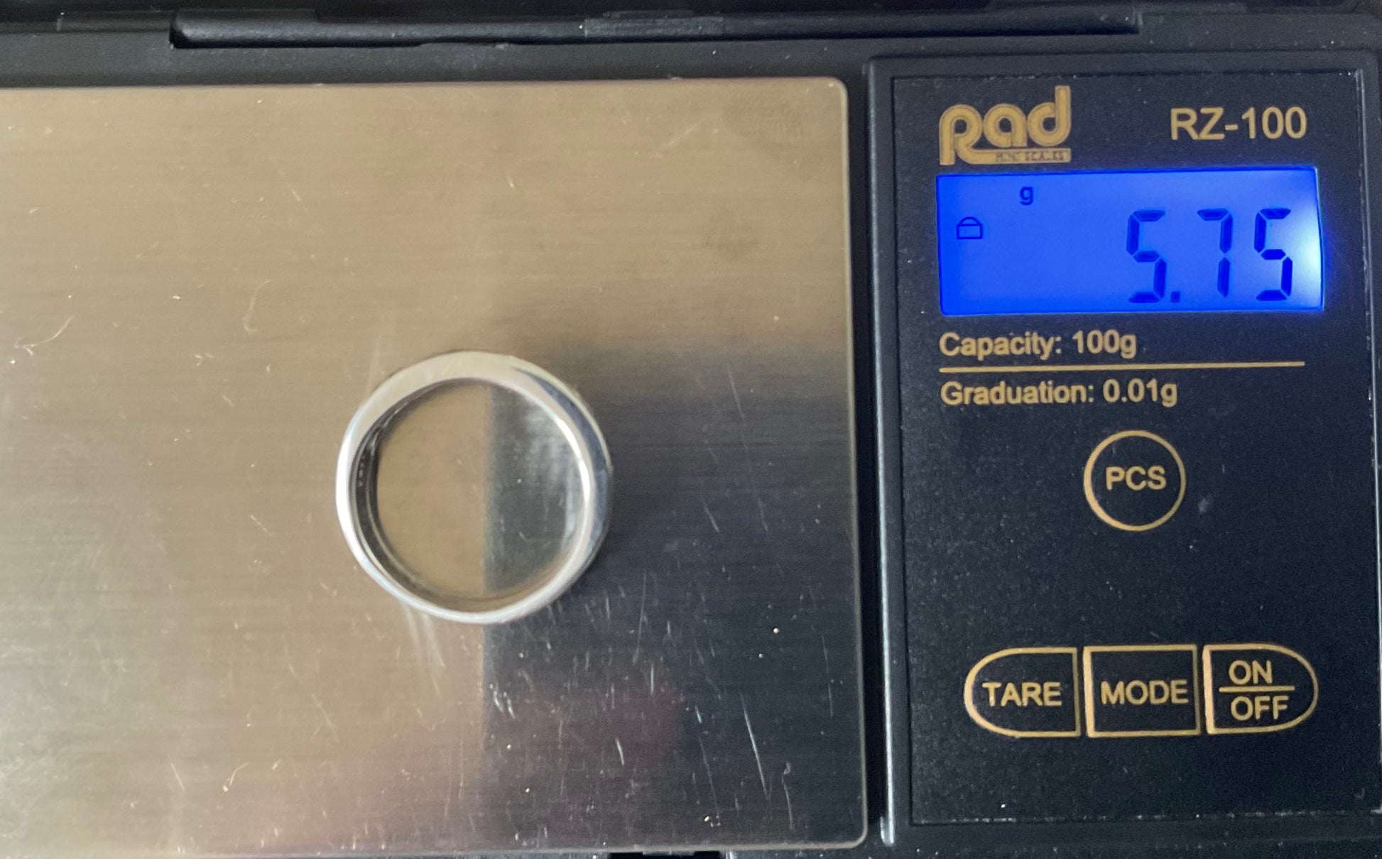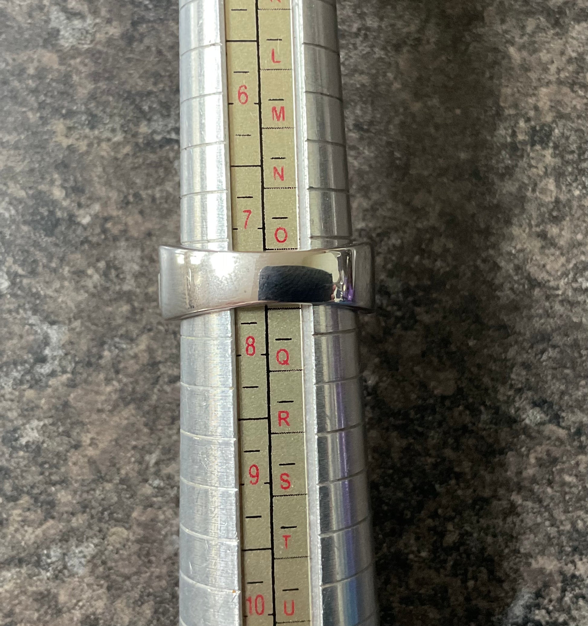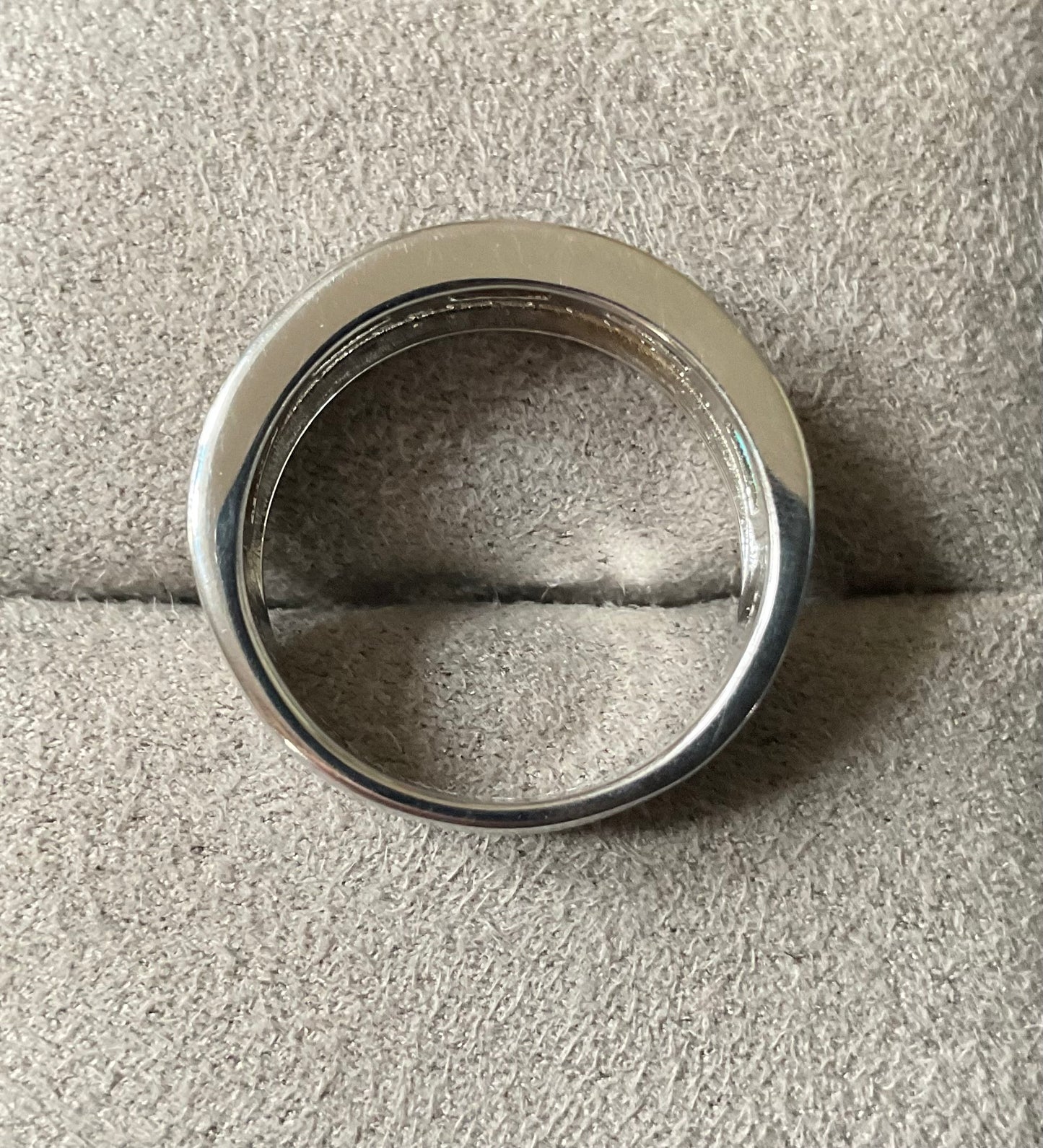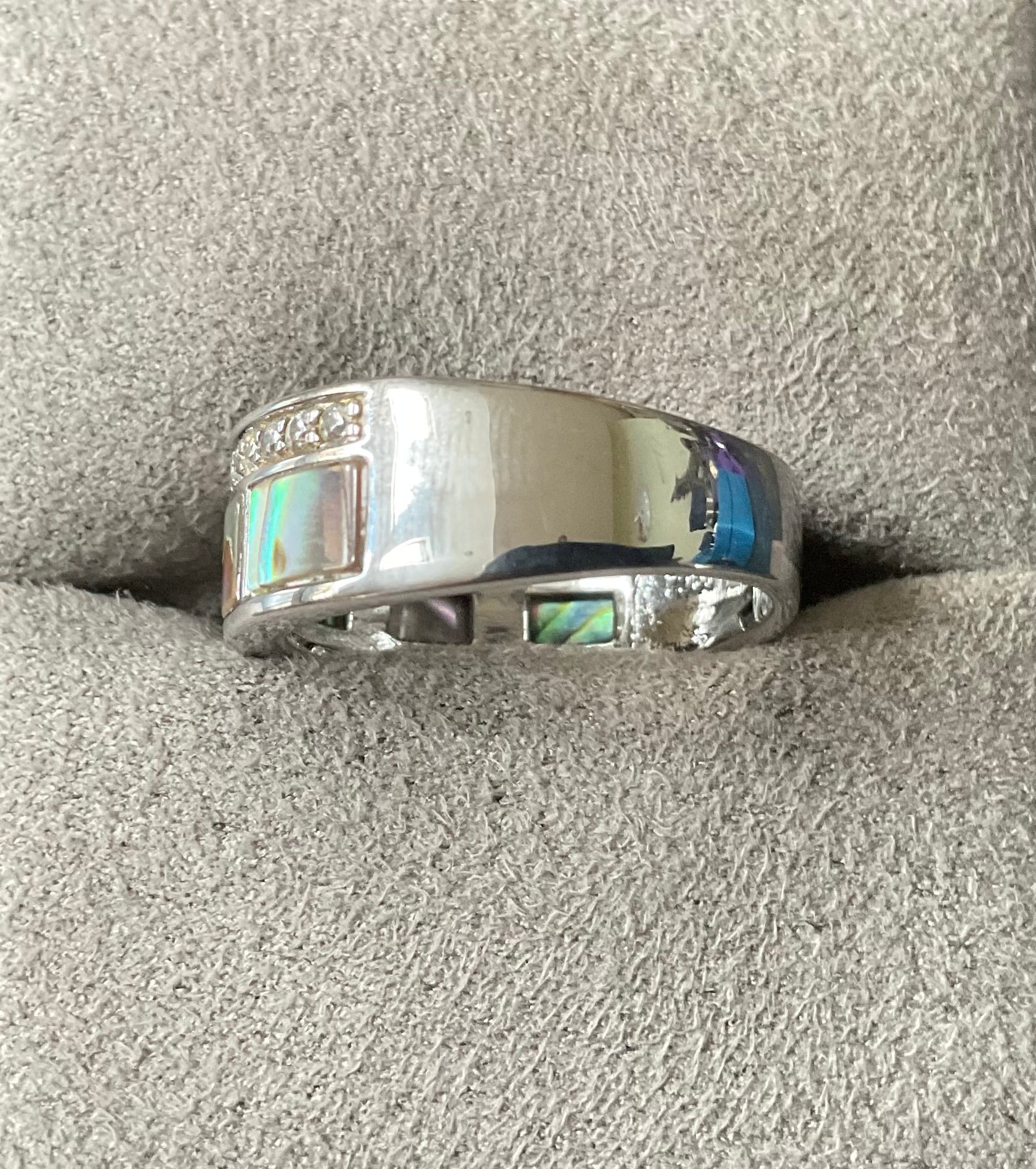 This is a beautiful unisex ring that I think would look great on any finger that it fits, it would make a stunning thumb ring! It is stamped 925 DQCZ inside the band. DQ stands for Diamonique which is QVC’s own version of cubic zirconia (CZ). There are five rectangular panels of abalone shell in a row with a band of clear Diamonique stones running along one of the edges. It is in good preowned condition with only small signs of wear on close inspection. The front of the band is 8mm across at the widest and it measures between an O1/2 and P on the ring sizer. It will come in a box.