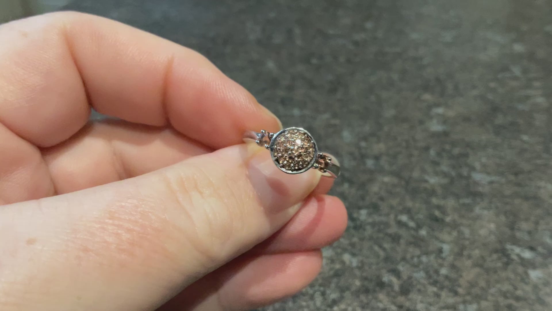 This is a very pretty ring featuring a central 8mm circle filled with round cut, pave set andalusite stones with a larger round cut andalusite to each side. The whole design measuring 1.4cm across the finger. The ring is stamped 925 and has the G for Gemporia. It’s in great preloved condition with small signs of wear on close inspection. It will come in a gift box,