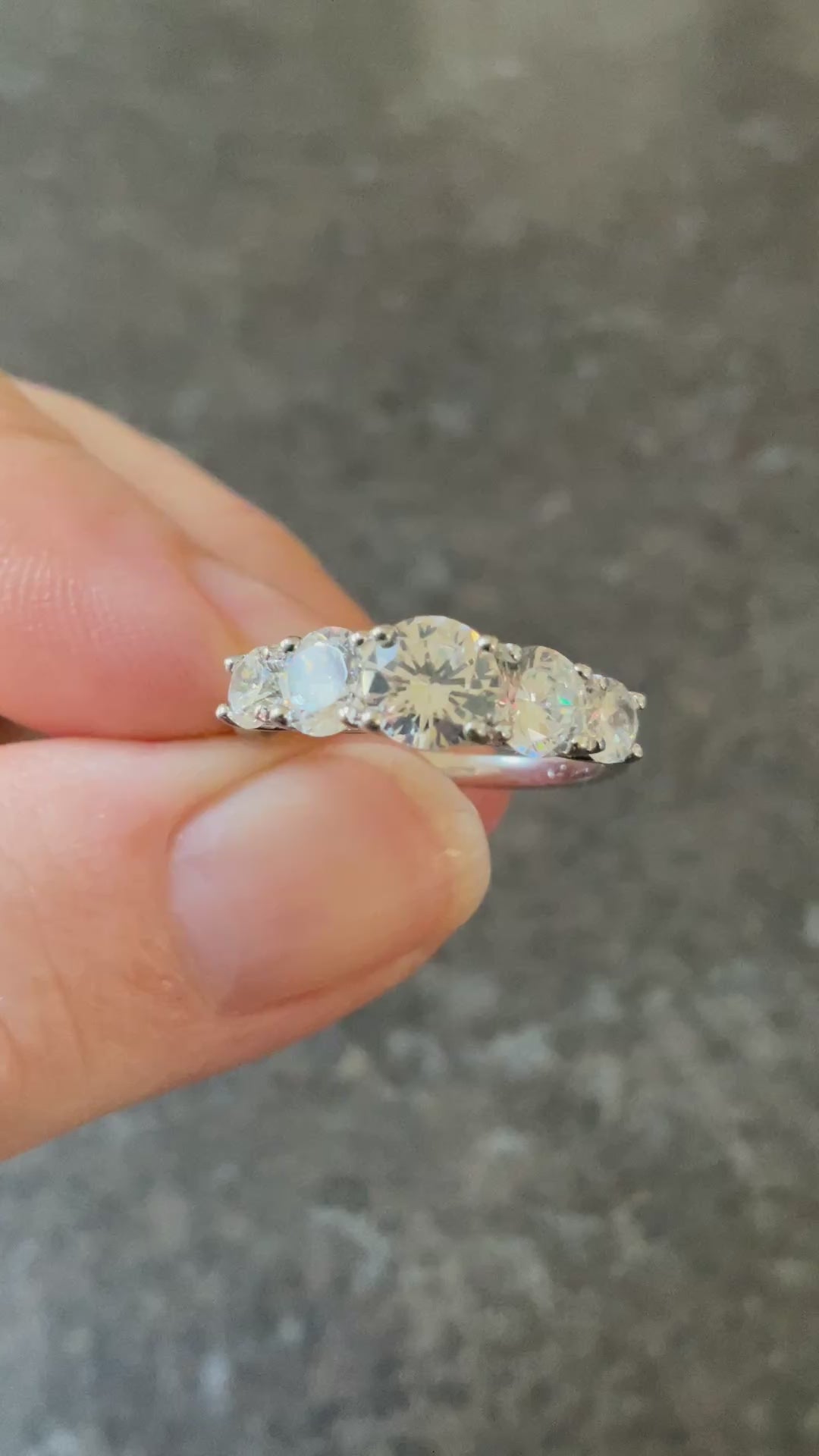 This is such a beautiful, sparkling ring! If you are looking for an eye catching engagement ring that won’t cost the earth, then this could be it! You have a central 5mm cubic zirconia round cut stone, then two 4mm stones, then two 3mm outer stones. It’s so much prettier than the photos as it sparkles so beautifully in the light. The inner band is stamped 925 CZ and MMx which is the designer (Michelle Mone). This ring is preloved but is in great condition with very small signs of wear on close inspection. It will come in a box.