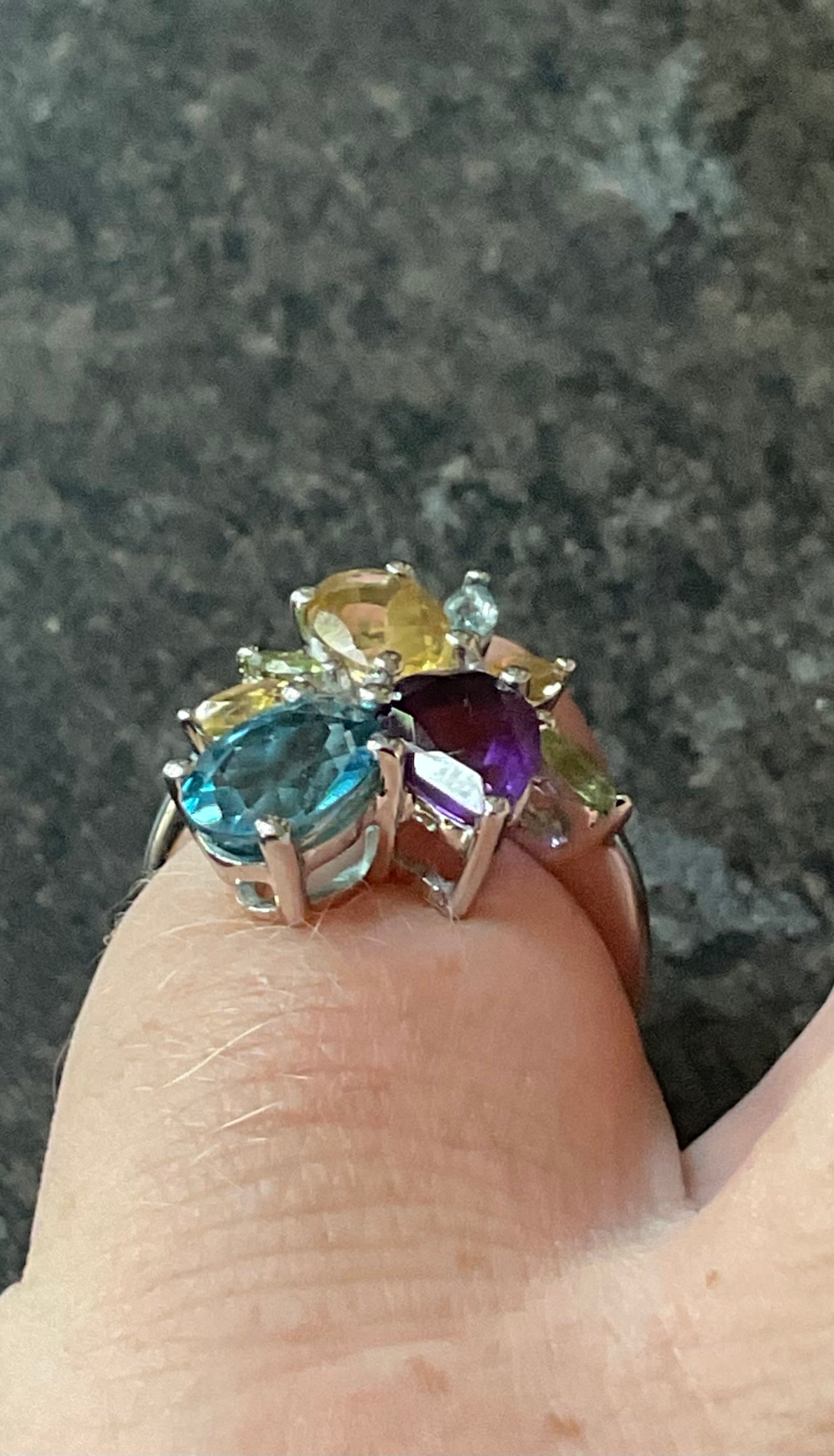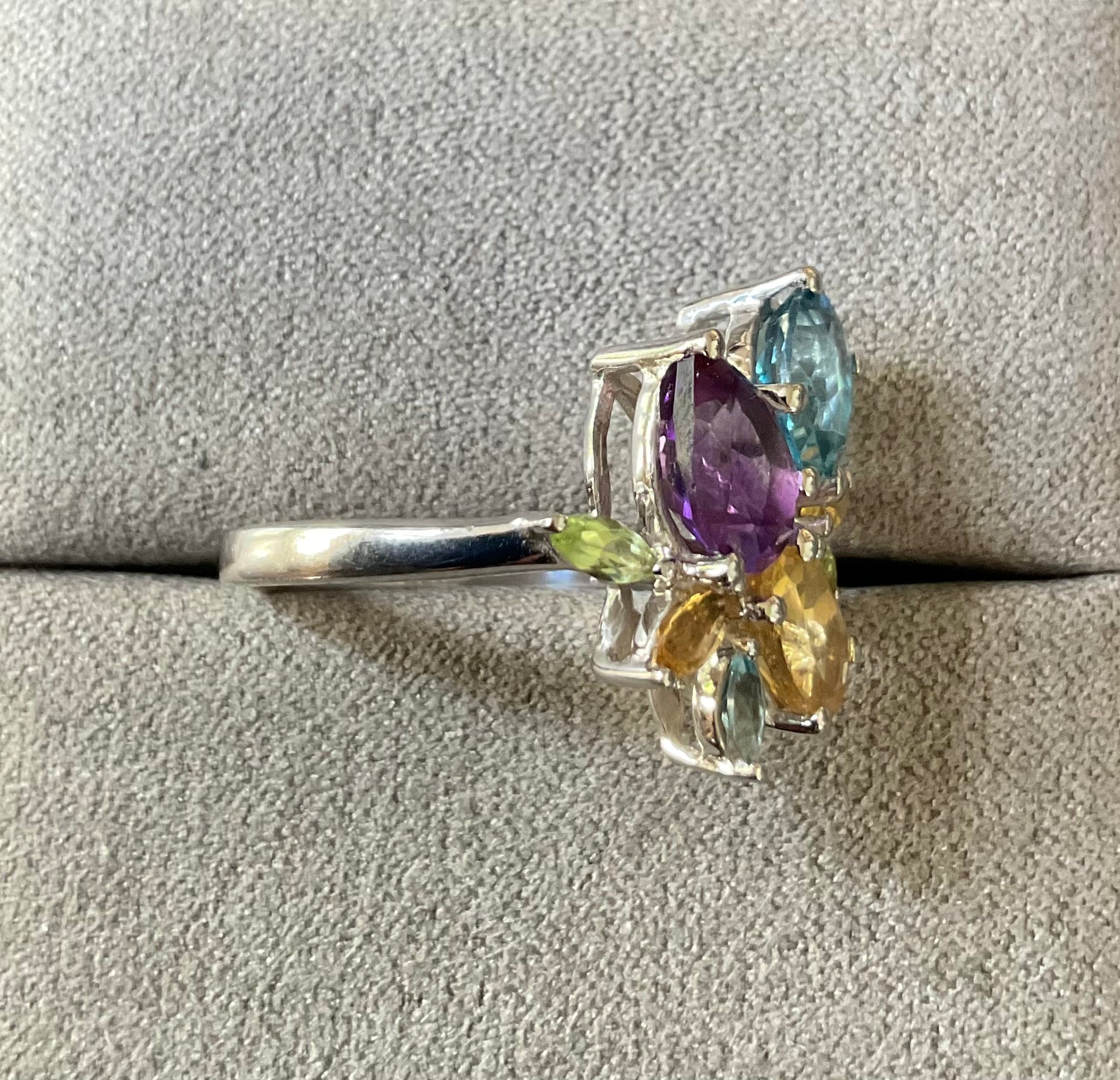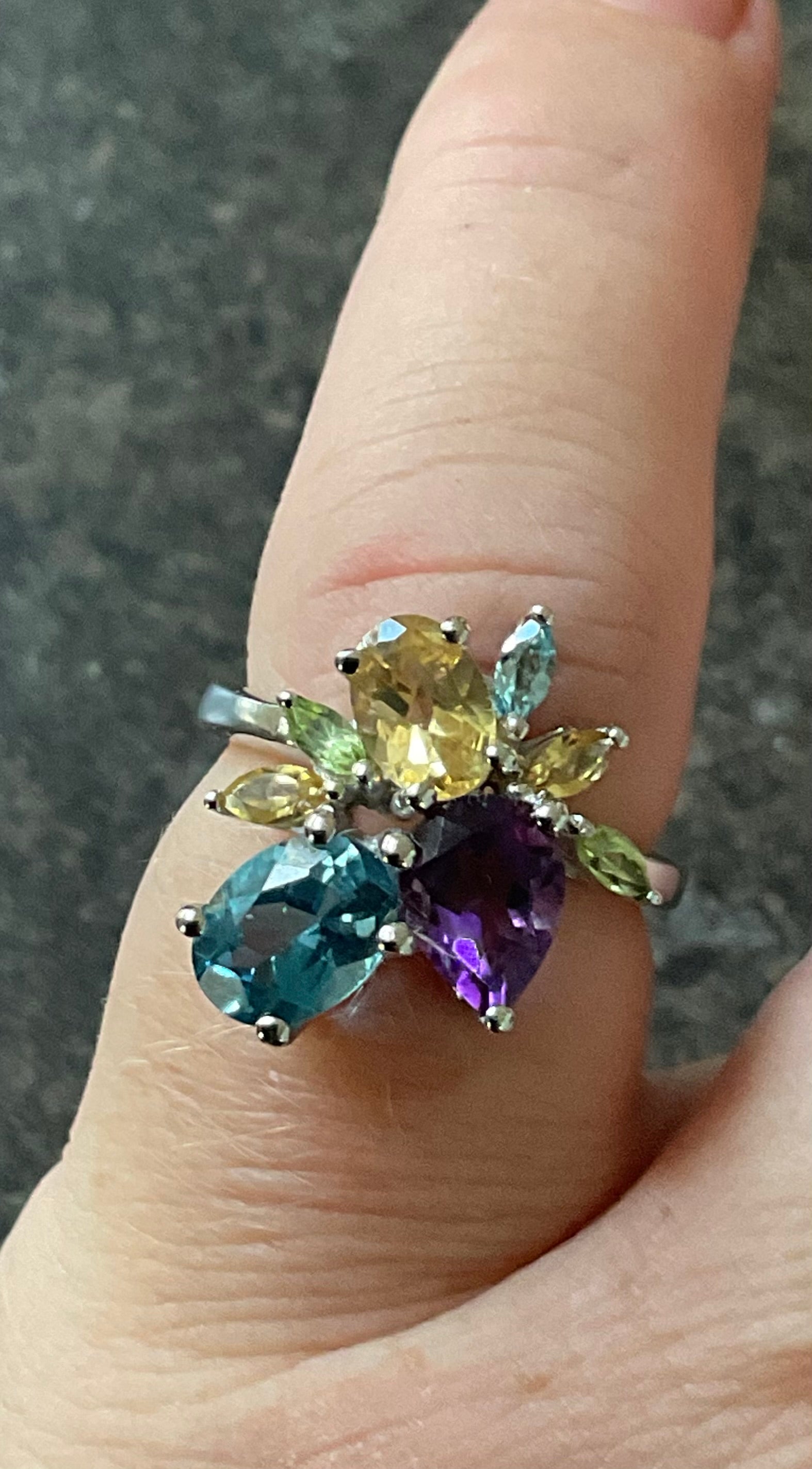 925 Multi gemstone Topaz Amethyst Citrine & Peridot oval pear & marquise cut sterling silver ring size L1/2 TGGC