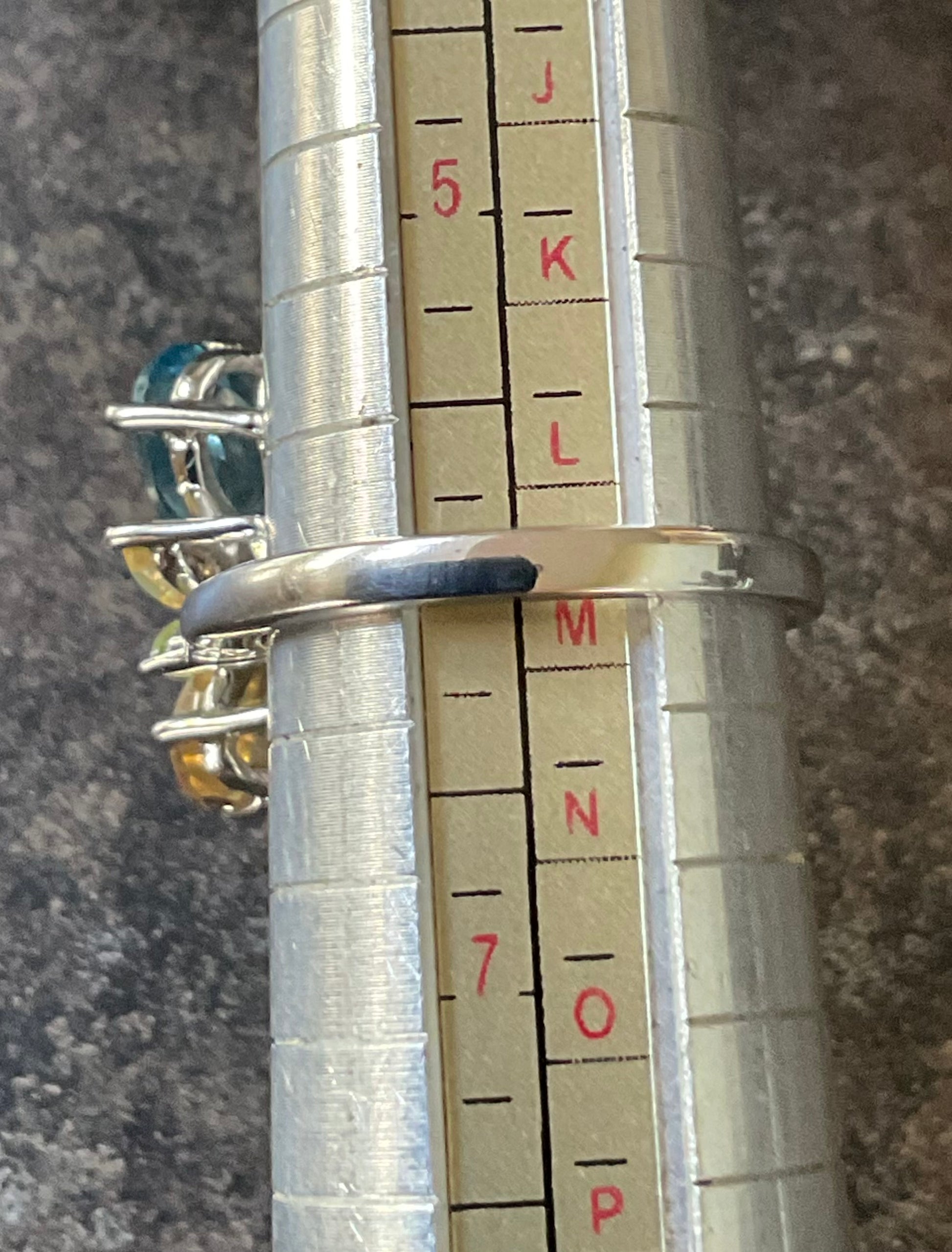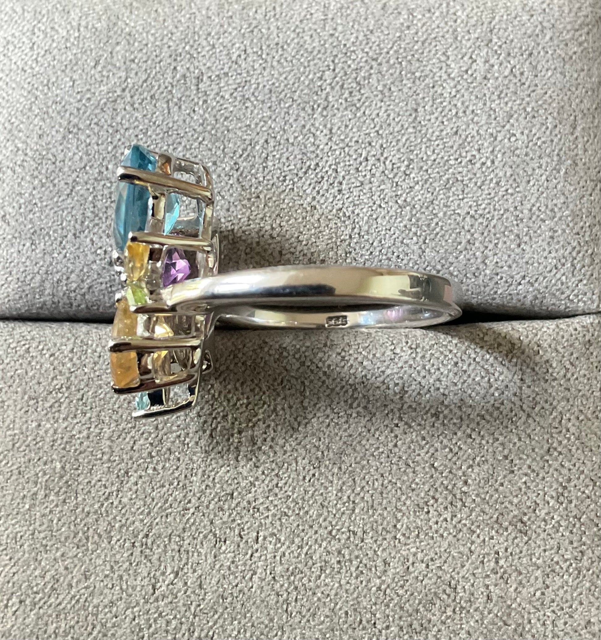 This beautiful ring features a stunning display of various gemstones and gem cuts. There is an oval and marquise cut Blue topaz, an oval and 2 marquise cut Citrines, a pear cut Amethyst and 2 marquise cut Peridots. It is a real statement piece of a ring with the design measuring 2cm across and along the finger. The inner band is stamped 925 and TGGC (The Genuine Gemstone Company). This is a stunning, eye catching ring, in great preowned condition. I can’t make out any notable wear by eye but there is small age/wear when you look more closely and through a loupe. It will come in a gift box.