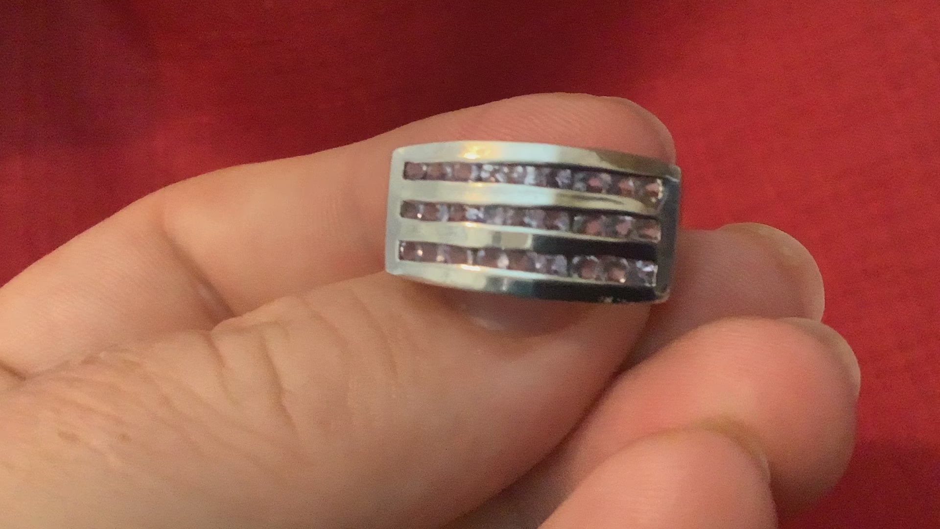 This is a lovely chunky ring measuring 1cm across and is stamped 925 TGGC. There are 3 rows of channel set pale tanzanite stones. It’s been worn so there are small signs of wear/lines as you can see on the video but it’s in good condition. It will come in a gift box.