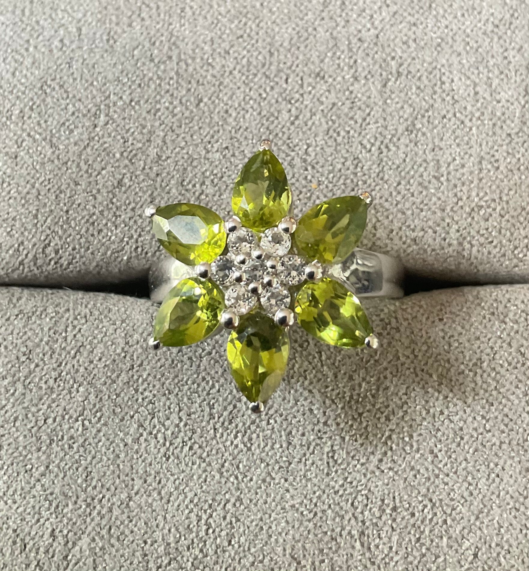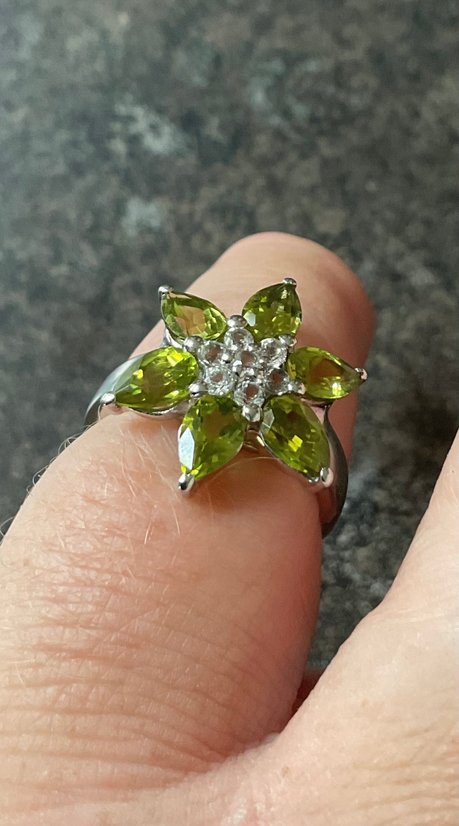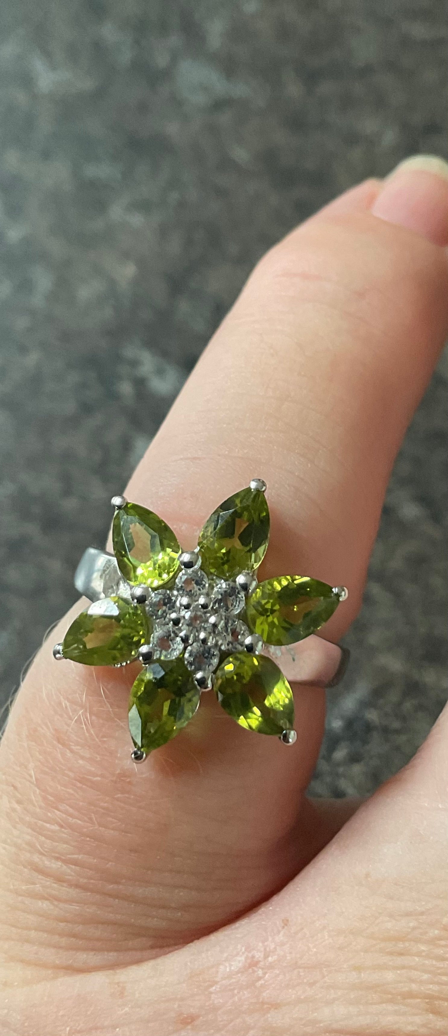 This stunning ring features 6 beautiful pear cut 6x4mm bright fresh green peridot stones, arranged around a cluster of 7 sparkling clear round cut zircons to give a flower design. The whole design measures 1.8cm along the finger and 1.5cm across the finger. The inner band is stamped 925 and TGGC (The Genuine Gemstone Company). This is a stunning, eye catching statement ring, in good preowned condition with small signs of age/wear to the silver band when you look for them. It will come in a gift box.