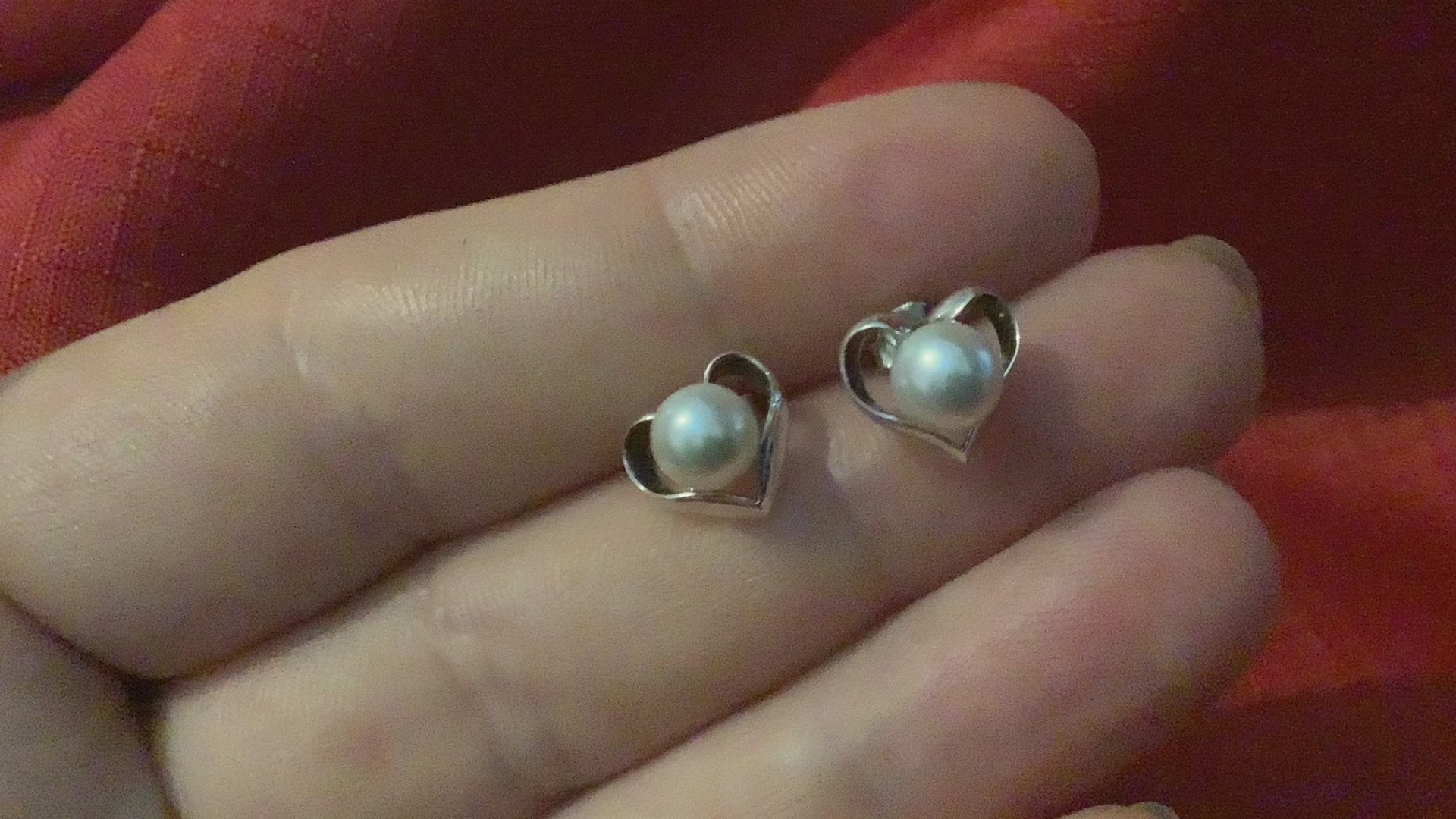 This is a pretty pair of earrings measuring 1x1cm, the 6mm pearl is snuggled into a stamped 925 heart stud and the butterfly backs are also stamped 925. I don’t know if these pearls are real or not but I would think they are probably faux pearls. These earrings are preloved so show some signs of wear such as the posts not being 100% straight and there are small marks that aren’t really visible with the naked eye but you can see them with a loop. They come in the red leatherette box shown.