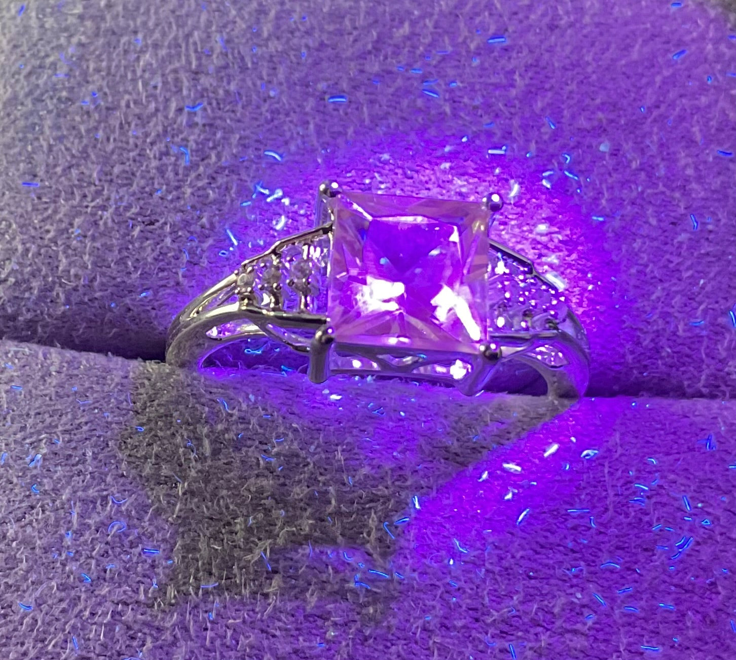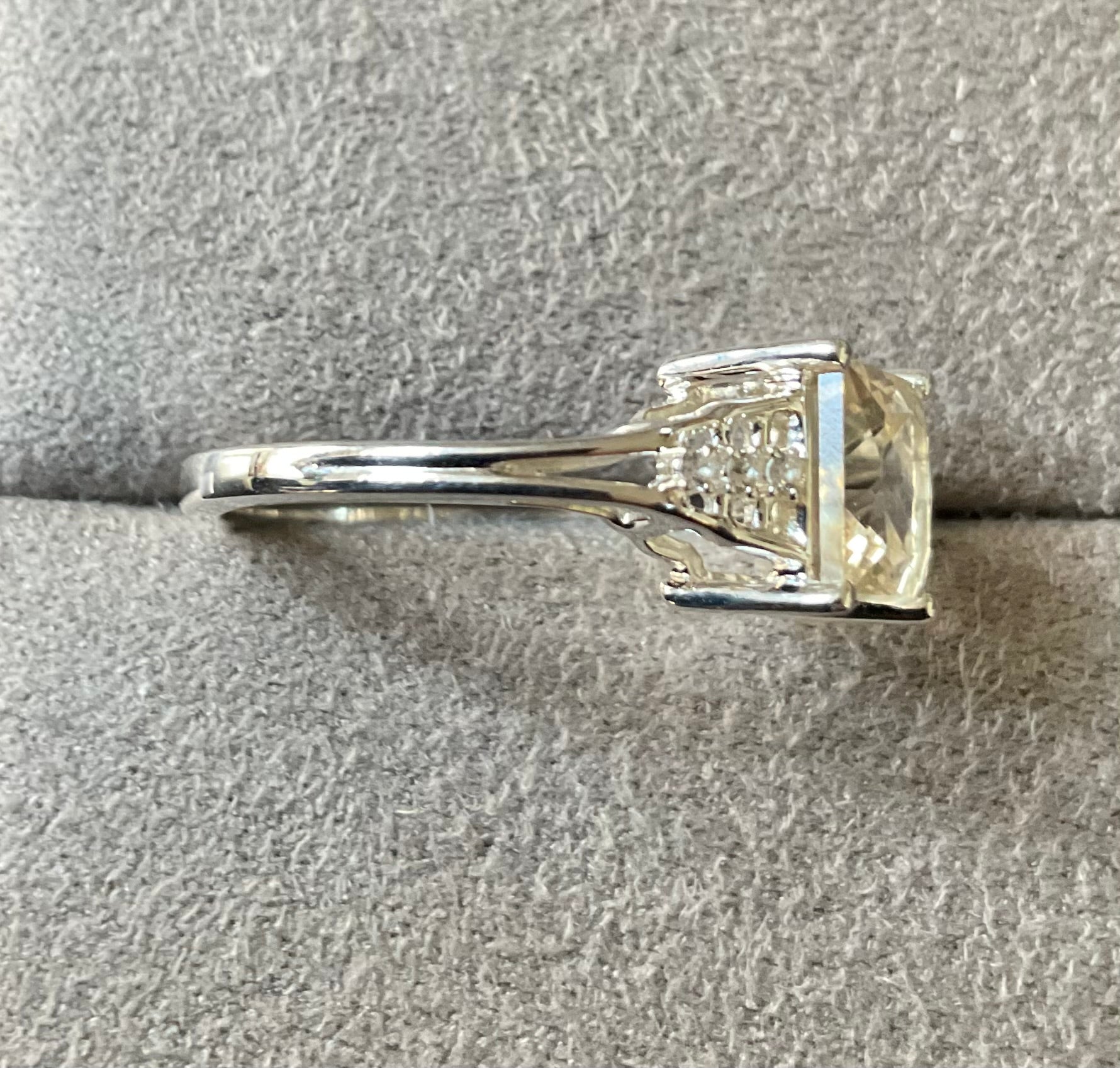 This is a beautiful ring with the main feature being a lovely 7x7mm square cut Serenite stone, Serenite being the Welsh word for star. It has an unusual colour, sometimes it’s almost colourless and looks a bit like a glacier mint and other times it has a green tint or a yellow tint. It looks pink under UV light as shown in the photos. Either side are three open work silver bars, each featuring a small round cut white zircon stone. The inner band is stamped 925 for sterling silver and has the G for Gemporia. This ring is in good preloved condition with small signs of wear only visible on close inspection. It will come in a gift box.
