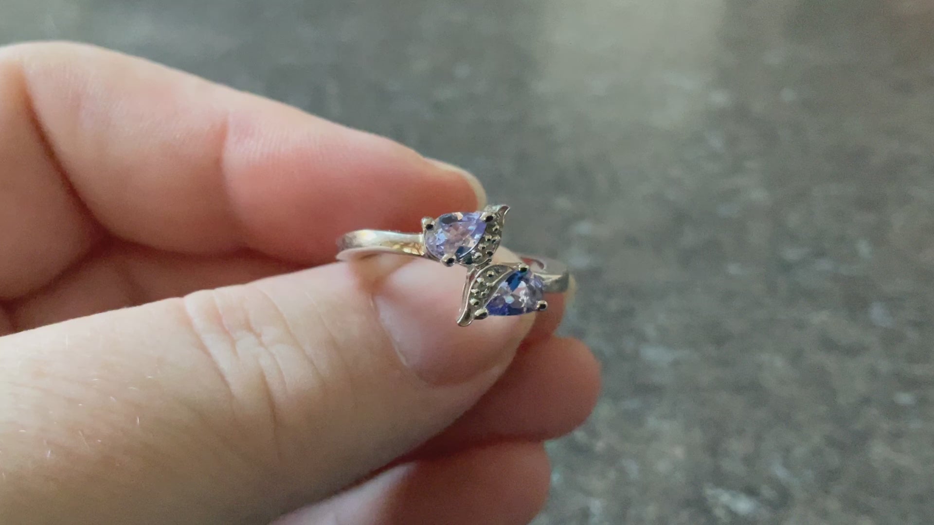 This is a stunning ring featuring 2 pear cut lavender purple 5x3mm tanzanite stones, set in a bypass design. Connecting the 2 tanzanites are 2 waves of silver, each containing a single, small diamond. The ring measures 1.2cm along the finger, from point to point and the band is stamped 925 and has the G for Gemporia. This ring is in great preloved condition, you’d have to look very closely for any signs of wear. It will come in a gift box.