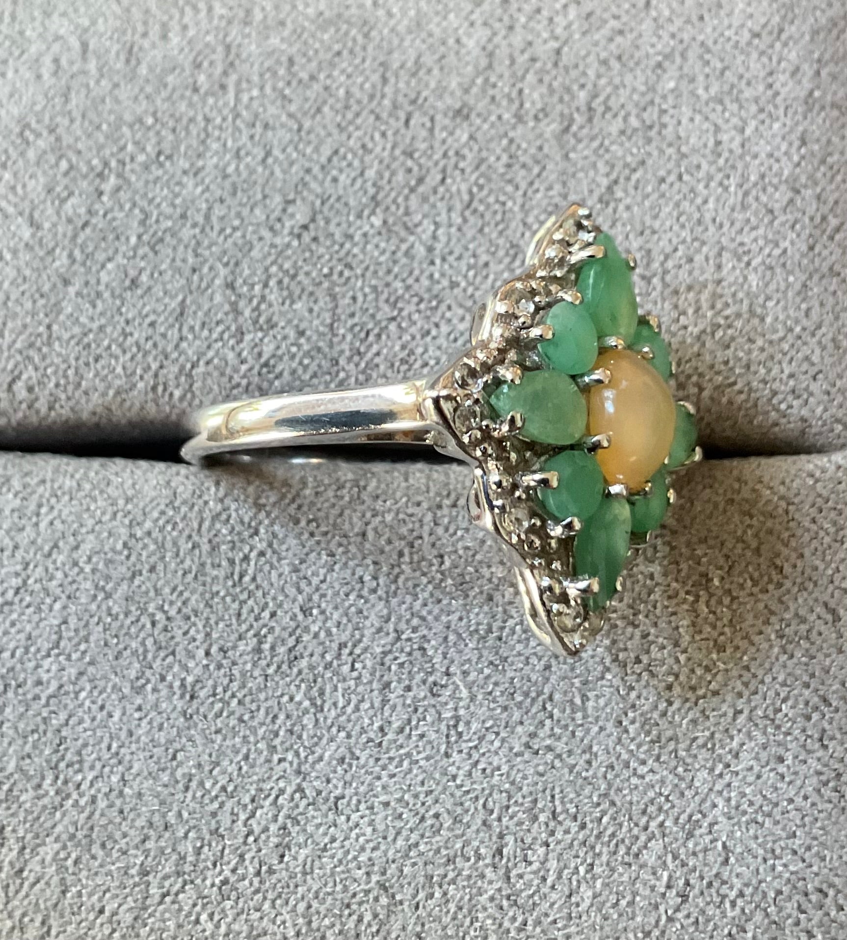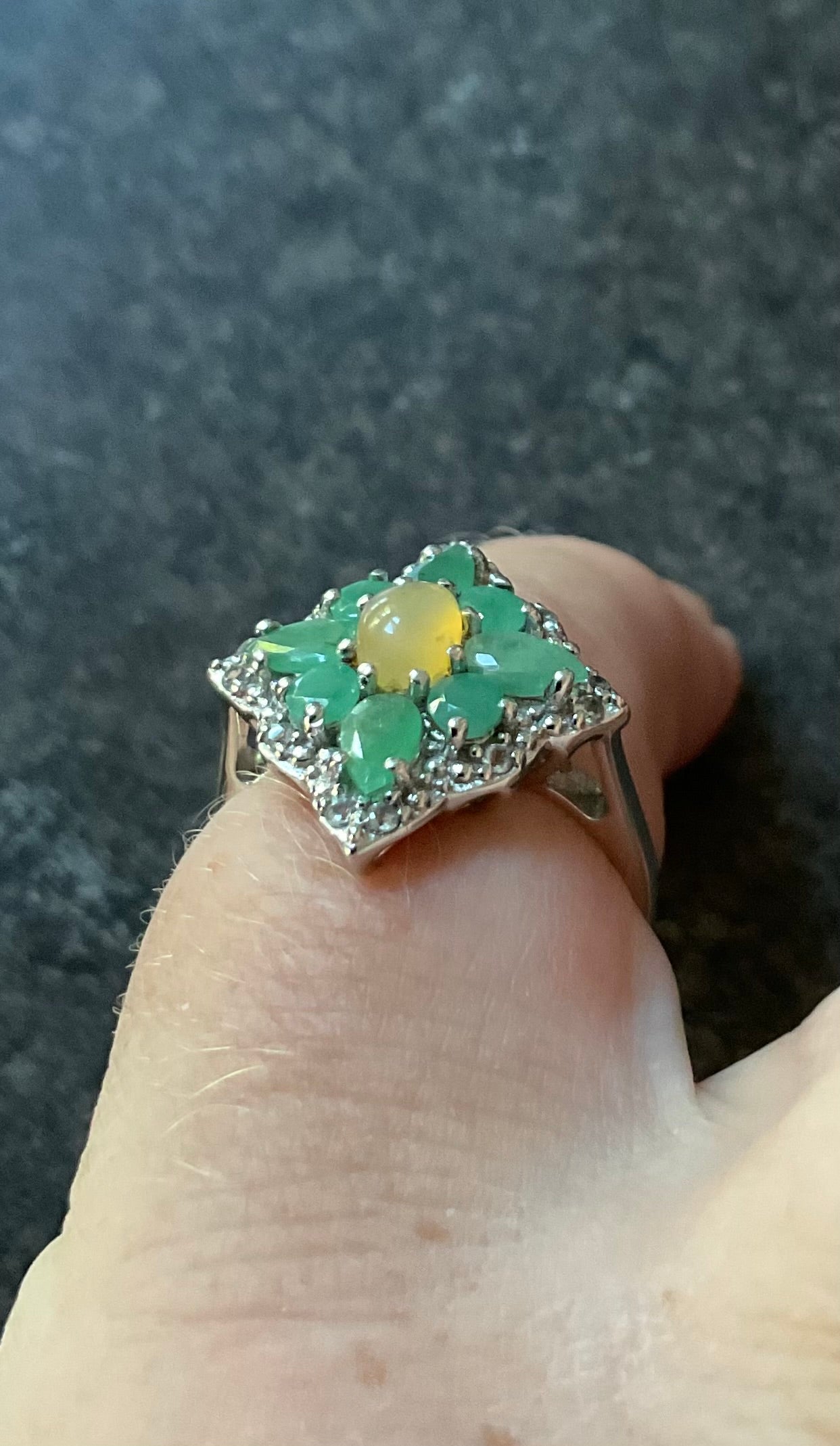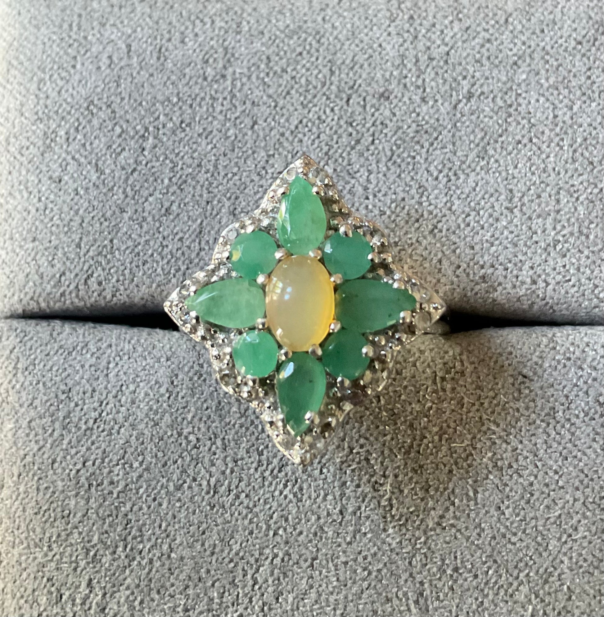 925 Welo Opal Emerald & Zircon cluster halo sterling silver ring size L TGGC