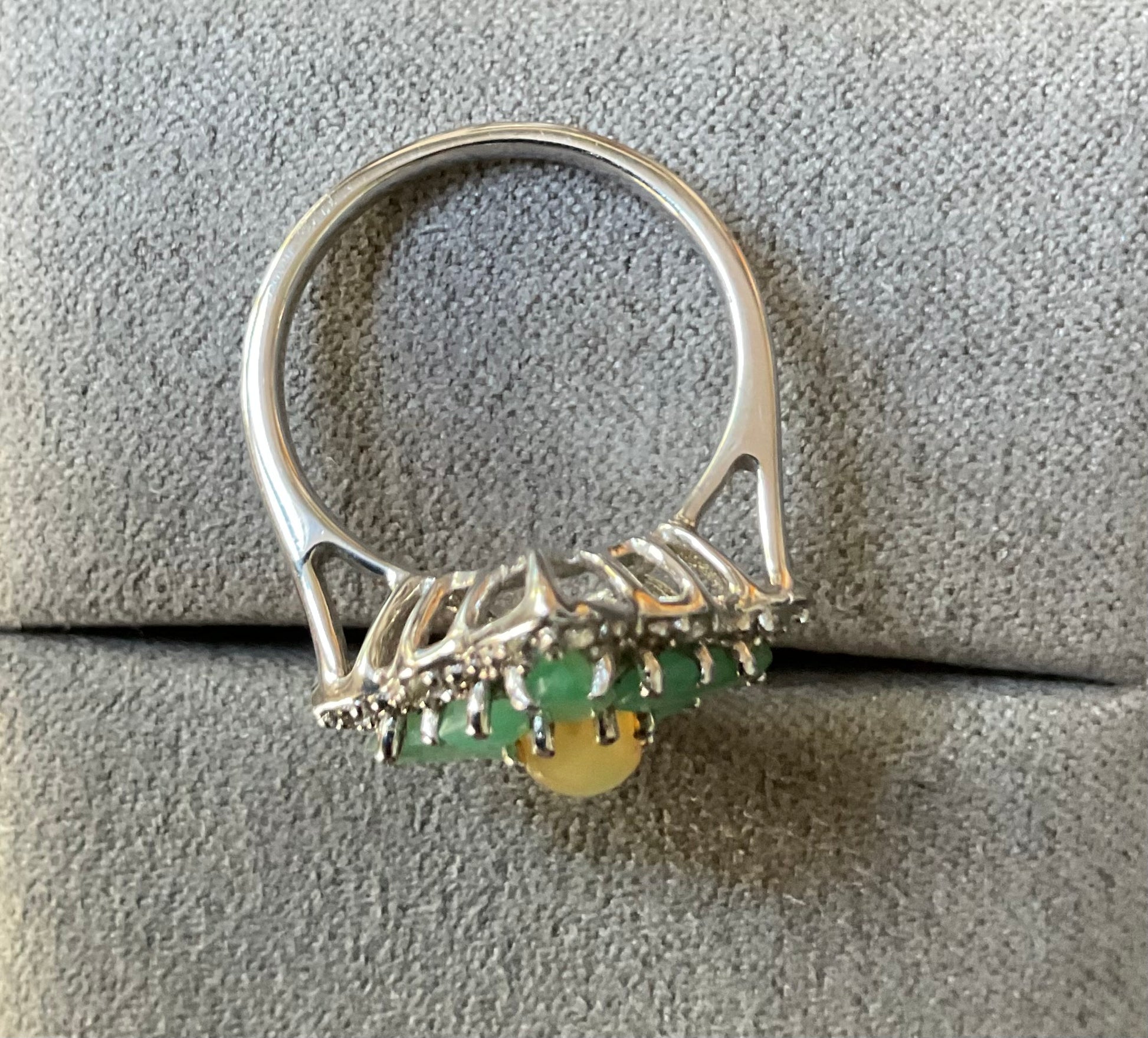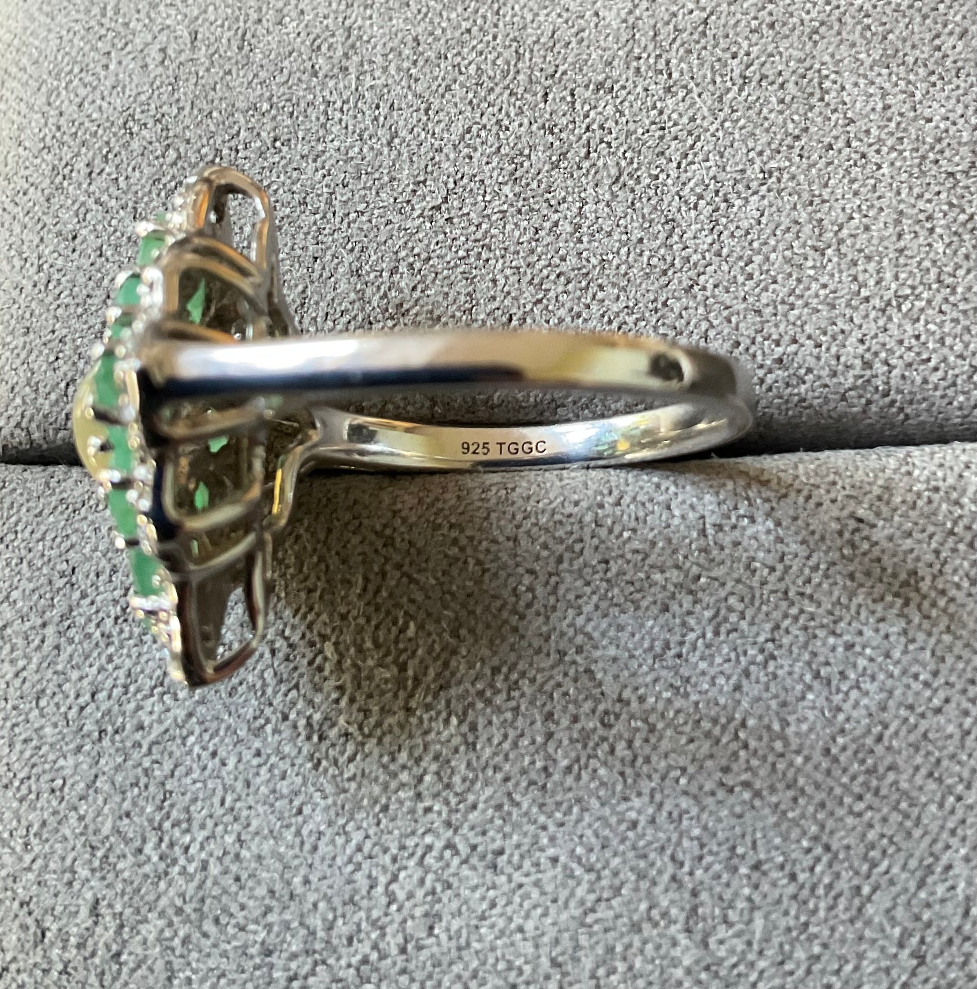 This beautiful ring features a stunning display of various gemstones and gem cuts. The central 5x4mm oval cut Welo Opal is surrounded by a halo of round and marquise cut emerald stones. These are enveloped within another halo of tiny clear zircons set into a wavy 925 sterling silver background, producing a gorgeous statement, halo cluster ring. The whole design measures 2cm along the finger and 1.7cm across the finger. The inner band is stamped 925 and TGGC (The Genuine Gemstone Company). This is a stunning, eye catching ring, in good preowned condition with small visible signs of age/wear to the silver band when you look for them. It will come in a gift box.