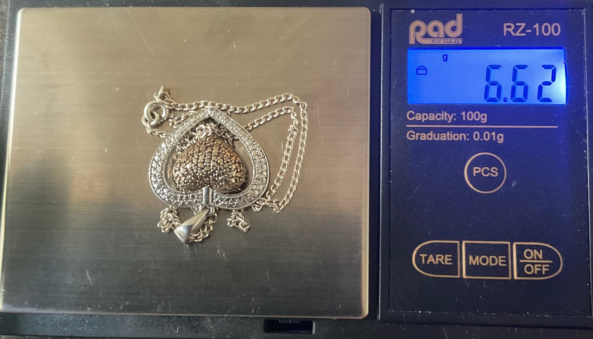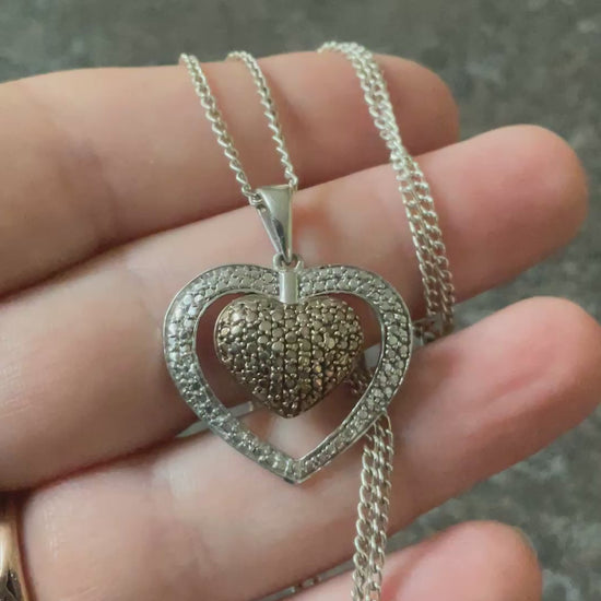 This is a beautiful necklace features a gorgeous pendant stamped 925 TGGC and measuring 3cm in length from the top of the bale and 2.3cm across. The heart with brown/champagne diamonds, is fixed inside the white diamond heart, it doesn’t dangle freely. Please note that the diamonds are dotted across the pendant in a pave setting, it is not completely covered in them. The 20” fine sterling silver chain is stamped 925 on the clasp. This necklace is preowned but is in good condition with small signs of wear. It will come in a gift box.