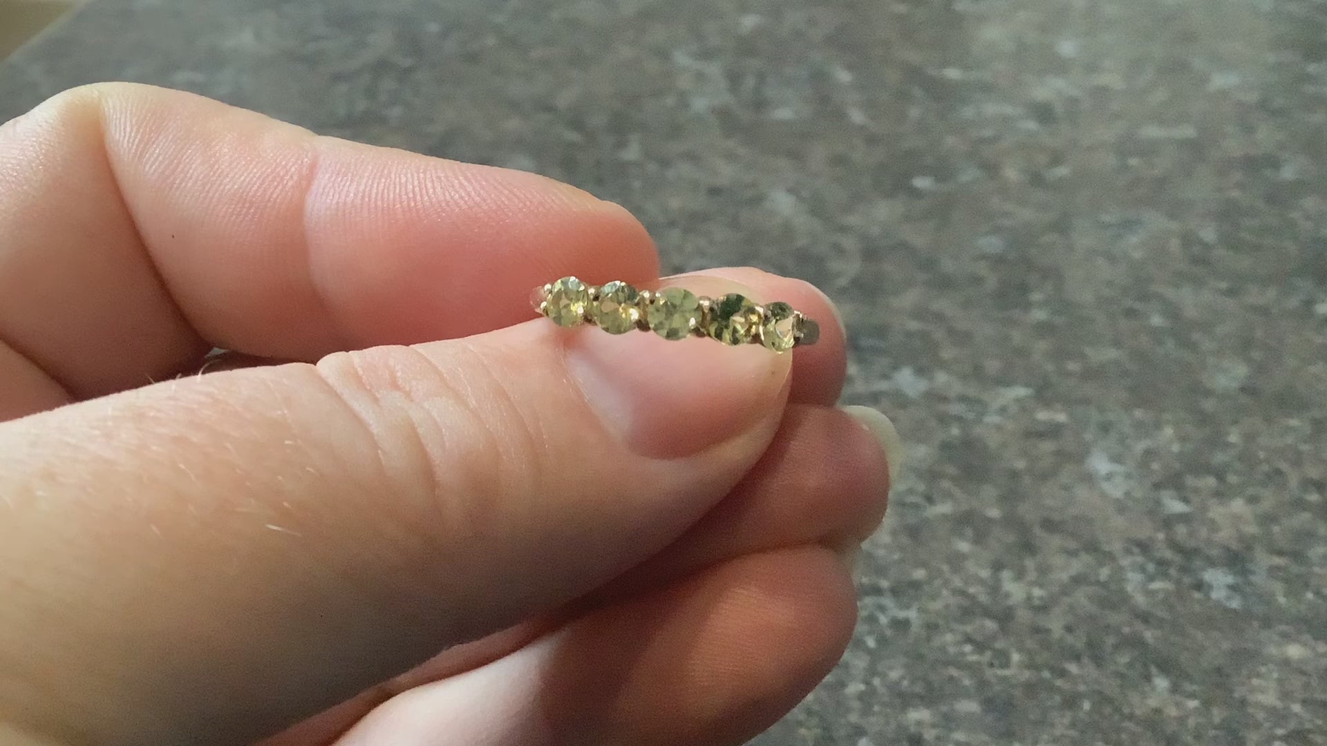 This is a stunning, unusual ring with 5 sparkling 4mm stones that change colour from a pale to almost canary yellow in some lights, to different shades of green depending on the light and angle of light it’s being viewed under. I hope I’ve managed to portray this in the photos and the video. I have no idea what the gemstone is sorry, it doesn’t really have much of a reaction under UV light, it would say it goes colourless if anything. The ring is hallmarked for 9ct gold, Birmingham assay and is in good preloved condition with small signs of wear on close inspection. It will come in a black leatherette box.