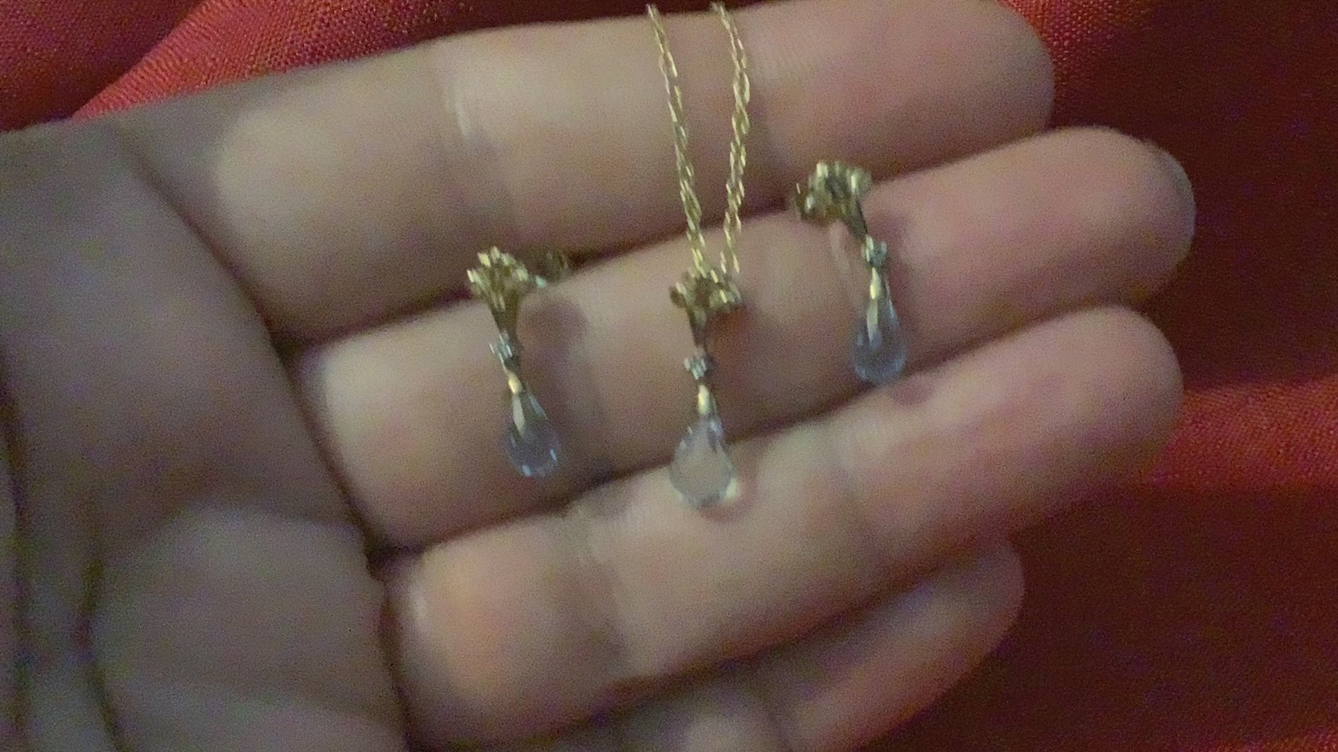 9ct aquamarine and diamond briolette cut earrings & 18” necklace set yellow gold