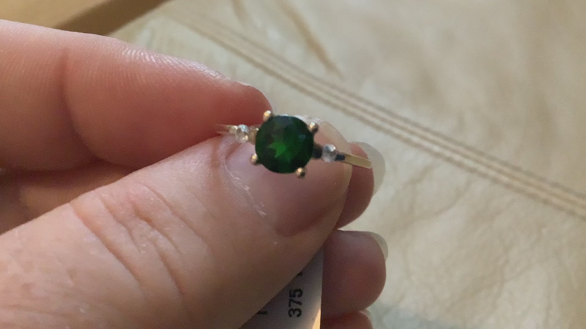 This is a stunning ring, the photos don’t do it justice. From one angle the round cut chrome diopside looks a rich deep green and then you move your hand and it transforms in to a bright, fresh green. It measures 6mm across and on either side are 2mm clear stones, I don't know what they are but they are not diamonds. It’s hallmarked for 9ct gold and stamped TGGC, so it’s an older ring but has never been worn. It still has the tag on. It will come in a new black leatherette box.