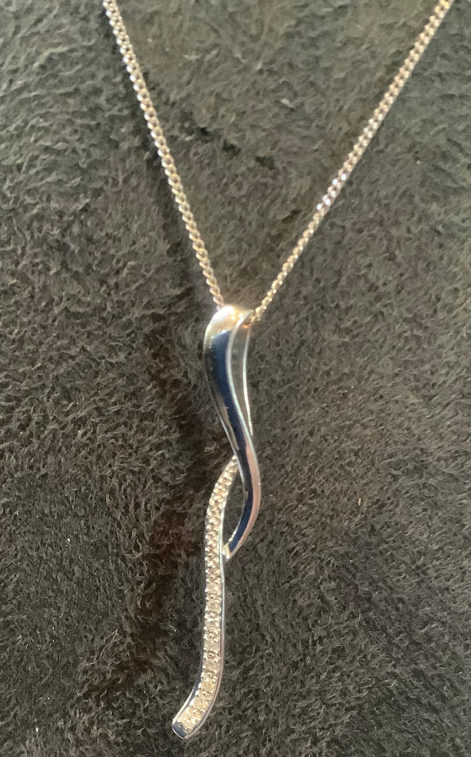 9ct Diamond wave bar white gold pendant necklace on 18" 9ct fine chain