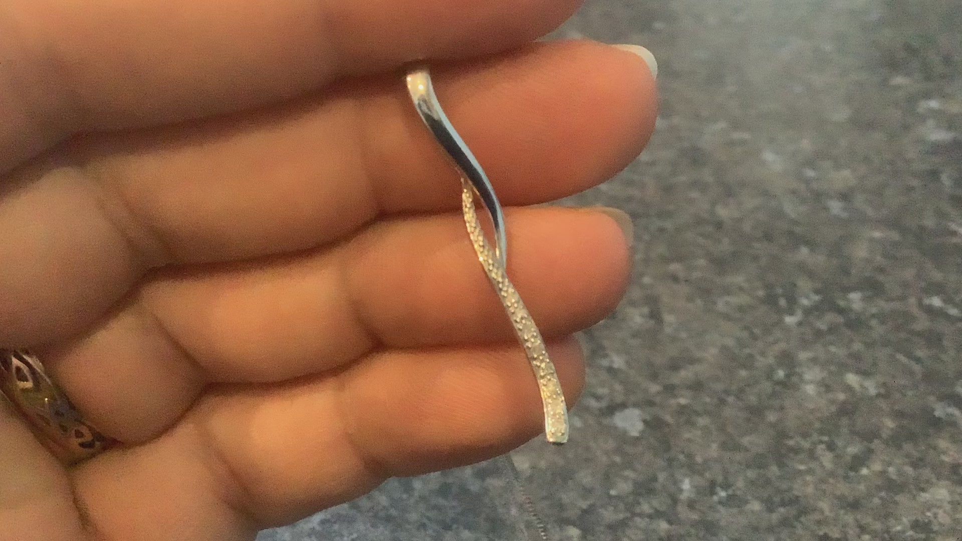 This is a stunning necklace that is prettier in real life as the 8 pave set diamonds sparkle much more than in the photos. The pendant measures 3.5cm in length and is about 4mm wide. It has a generous built in bale that would allow you to add a much more substantial chain if you wanted to. It is stamped 375 DIA and also fully hallmarked. There is a makers stamp and I’m wondering if it’s the QVC stamp but they normally stamp their items with QVC, so I’m not sure. There is a pretty, sparkly, flat, fine, 18” white gold chain, stamped 375 on the clasp. The necklace is in great preloved condition with very small signs of age/wear to the chain. It will come in a box.