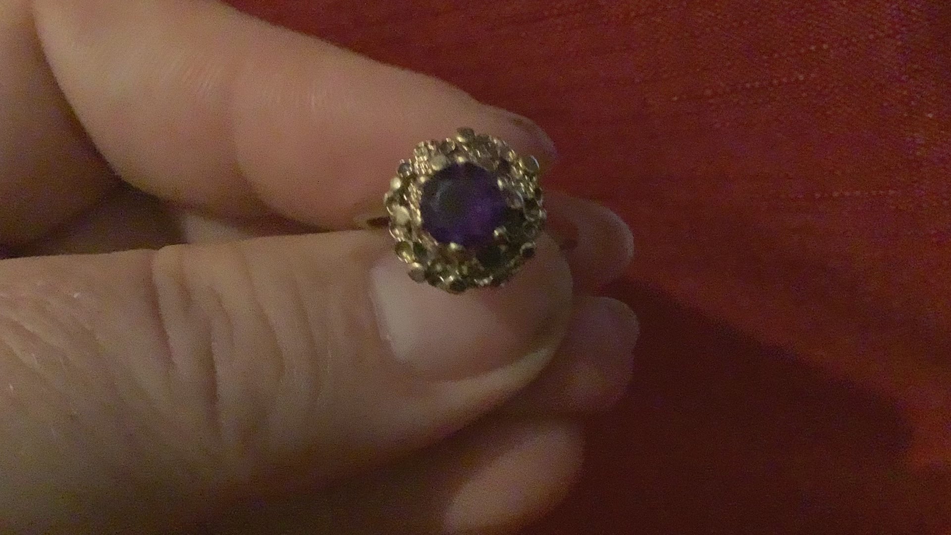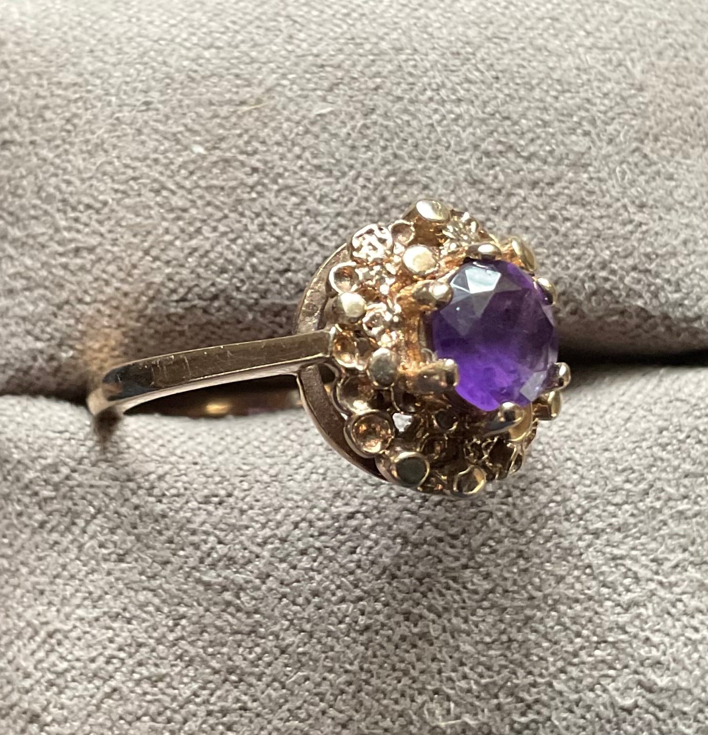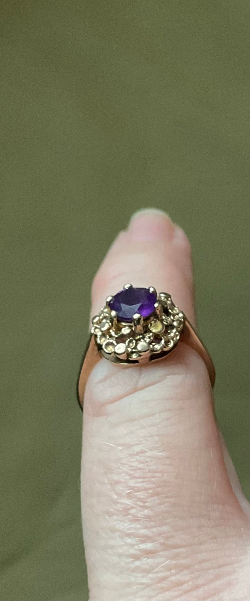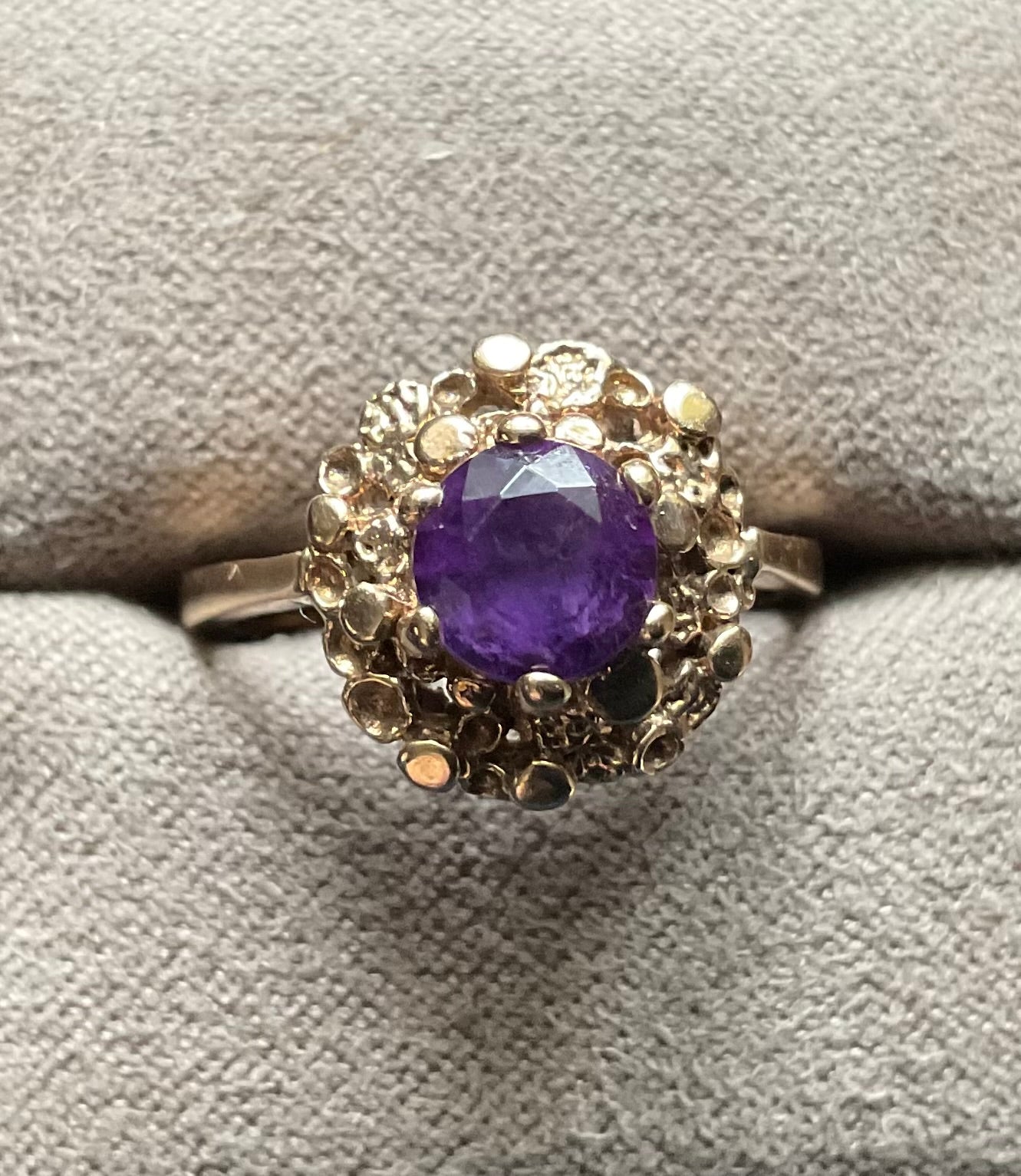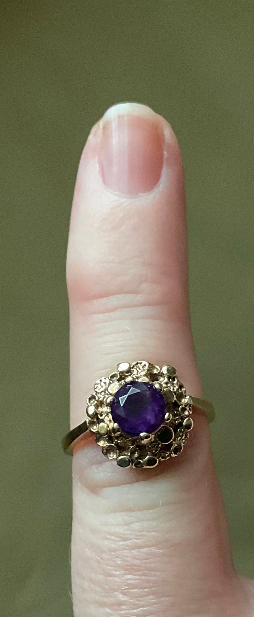 This is an unusual, attractive ring that looks very vintage in style. It has a full London hallmark with the 1969 date letter and has other stamps that I can't make out at all. It features a lovely rich purple 5mm amethyst stone surrounded by raised bobbles and pits of gold. The whole round design measures 12mm across. It weighs 3.21g and is preloved so has been worn and has small signs of wear/marks to the surface of the band. It will come in a new black leatherette box.