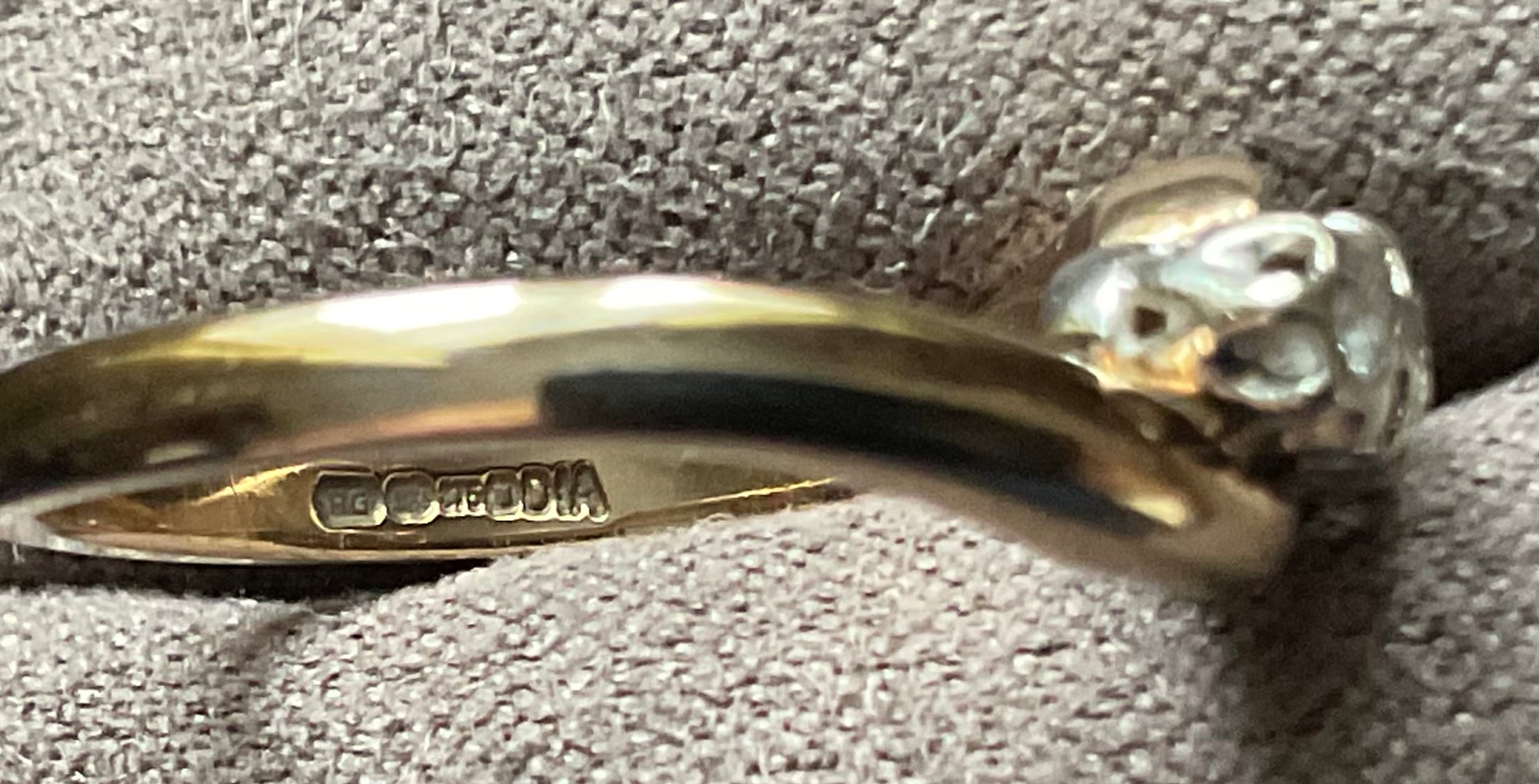 This is a very pretty ring, in good preloved condition with small signs of wear to the band on close inspection. It’s fully hallmarked for London 375 9ct yellow gold and 0.10 for the diamond weighting. The makers mark is RG, there is no date letter on this hallmark. There are 3 lovely sparkly diamonds of around 2mm for the centre one with a white metal band round to make them look slightly bigger, hence the illusion effect. It will come in a new black leatherette box.