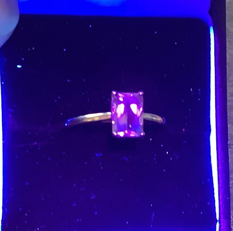 This is a lovely ring with a beautiful solitaire 8x5mm rectangle cut pale yellow gemstone. I don’t know what the stone is but it’s generally a pale yellow becoming almost colourless at certain angles. It turns pink under UV light. I think it might be serenite. It is stamped 417 10K TGGC and has a 375 hallmark. It is in good preloved condition with small signs of wear under close inspection. It will come in a black leatherette box.