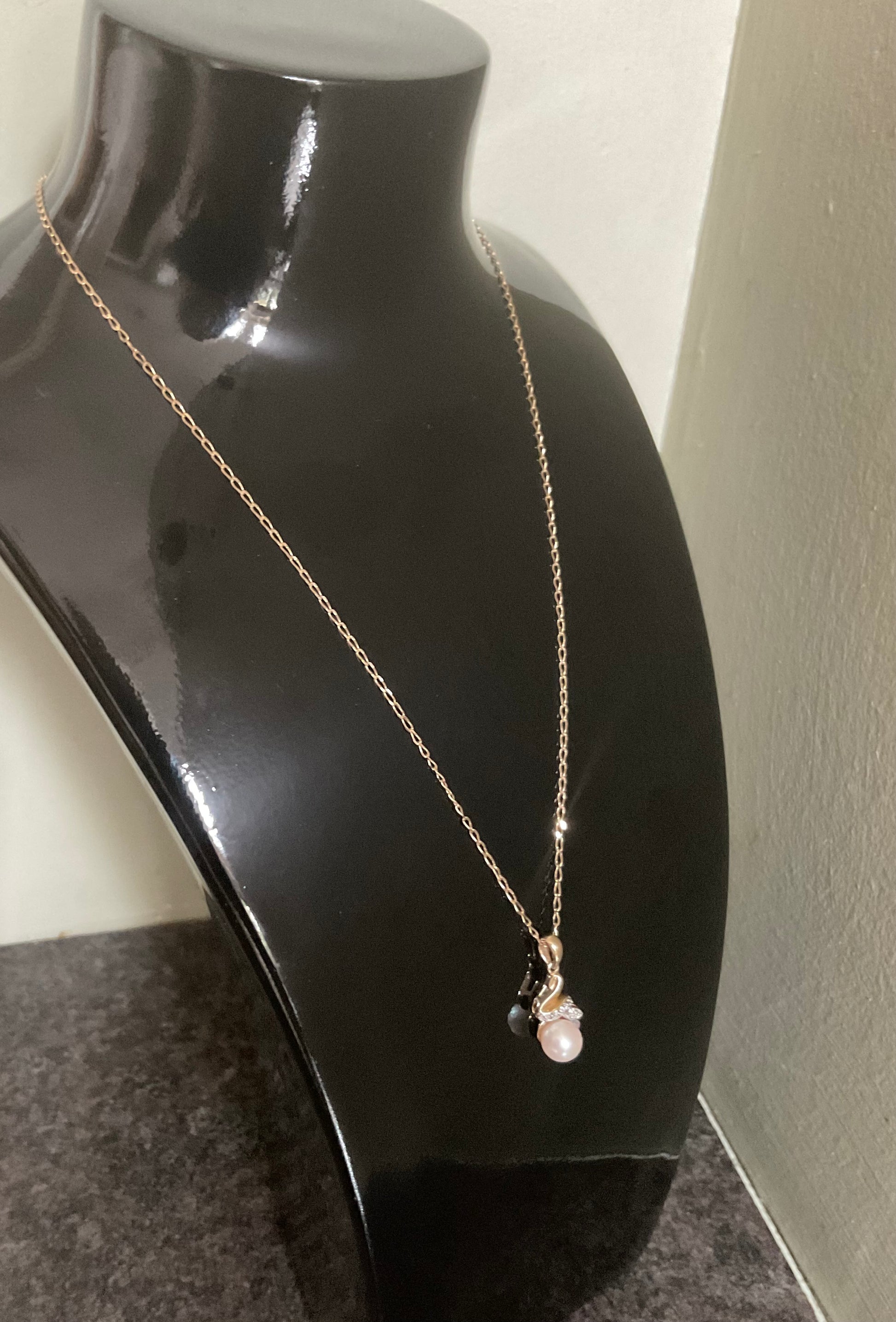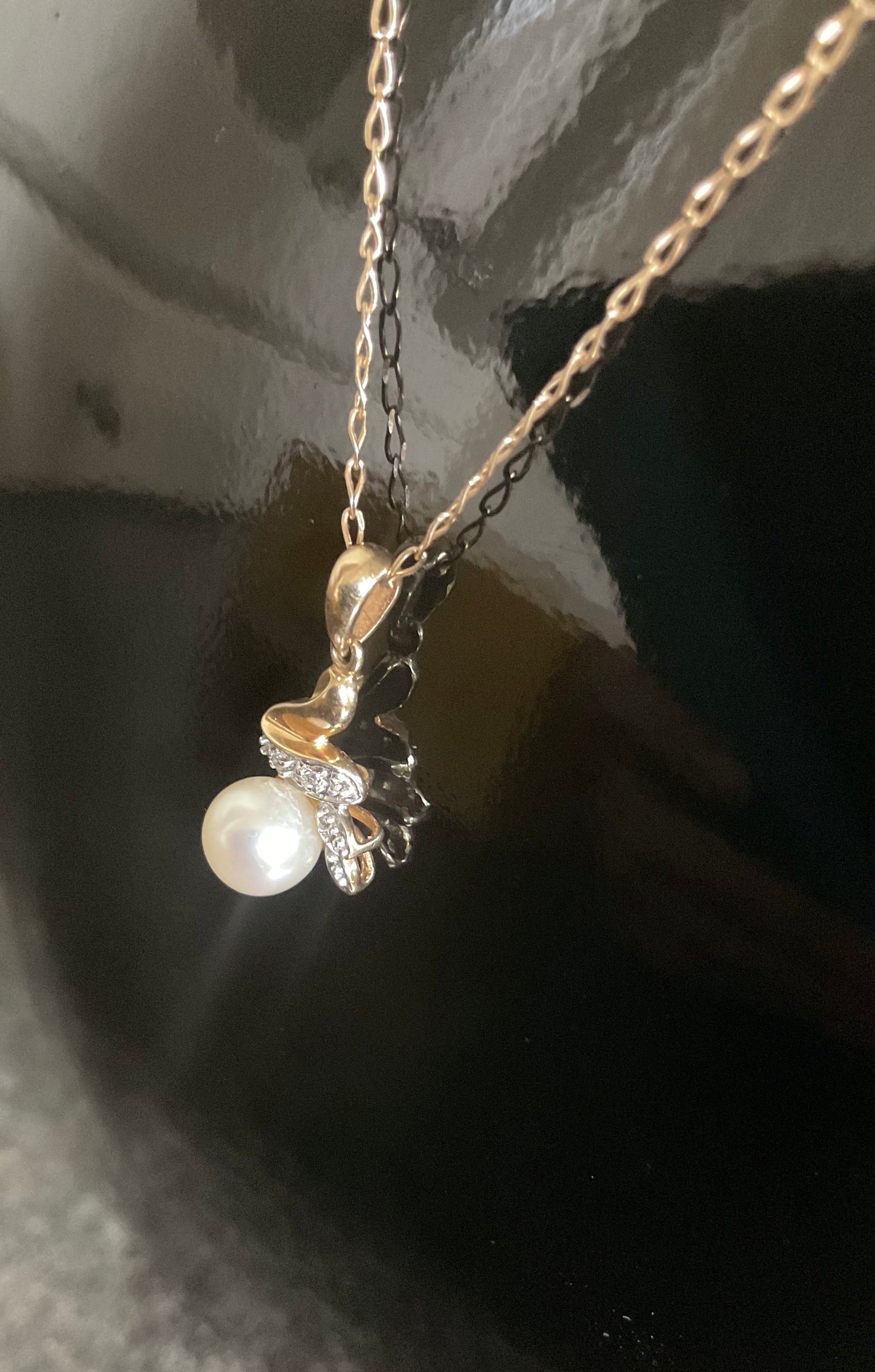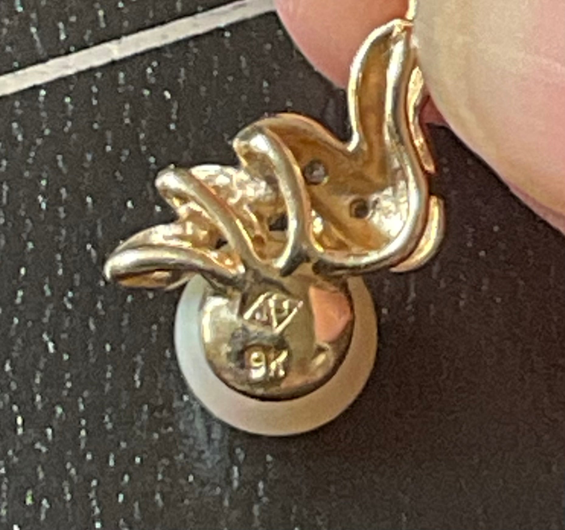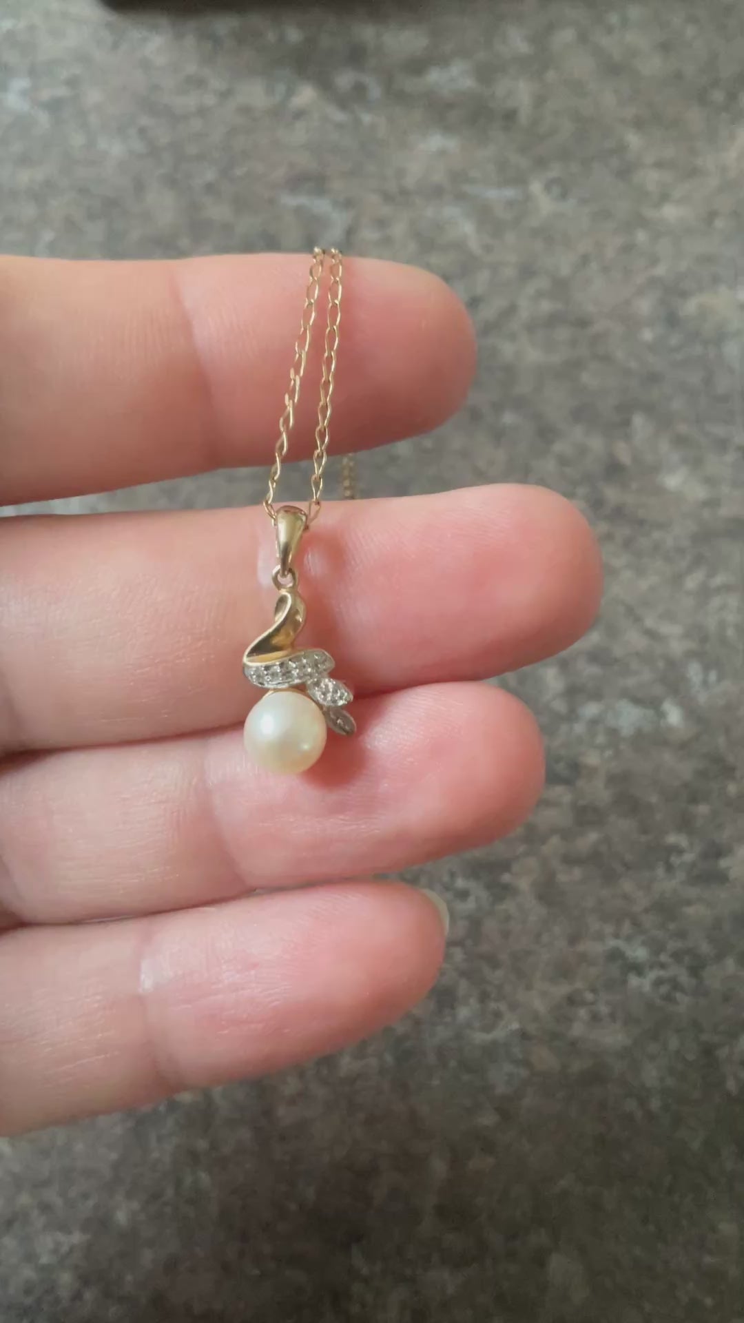 This is such a pretty necklace, featuring a 6mm round white pearl with a 9ct yellow gold, diamond set design above, a bit like an undulating ribbon. I don’t know if the pearl is synthetic or not but it does phosphoresce under uv light as shown in the photos, so I think it’s natural. The pendant measures 2cm in length (including bale) and 1cm wide and is stamped 9K on the back with what I think are the letters NTJ in a chevron. The bale is stamped 375 with the Sheffield assay and with initials in an oval that I can’t make out. The 18” fine chain is stamped 9KT on the little gold tag and 9K on the clasp. It’s a preloved necklace but it’s in really nice condition, needing a loupe to see any signs of wear. It will come in a gift box.