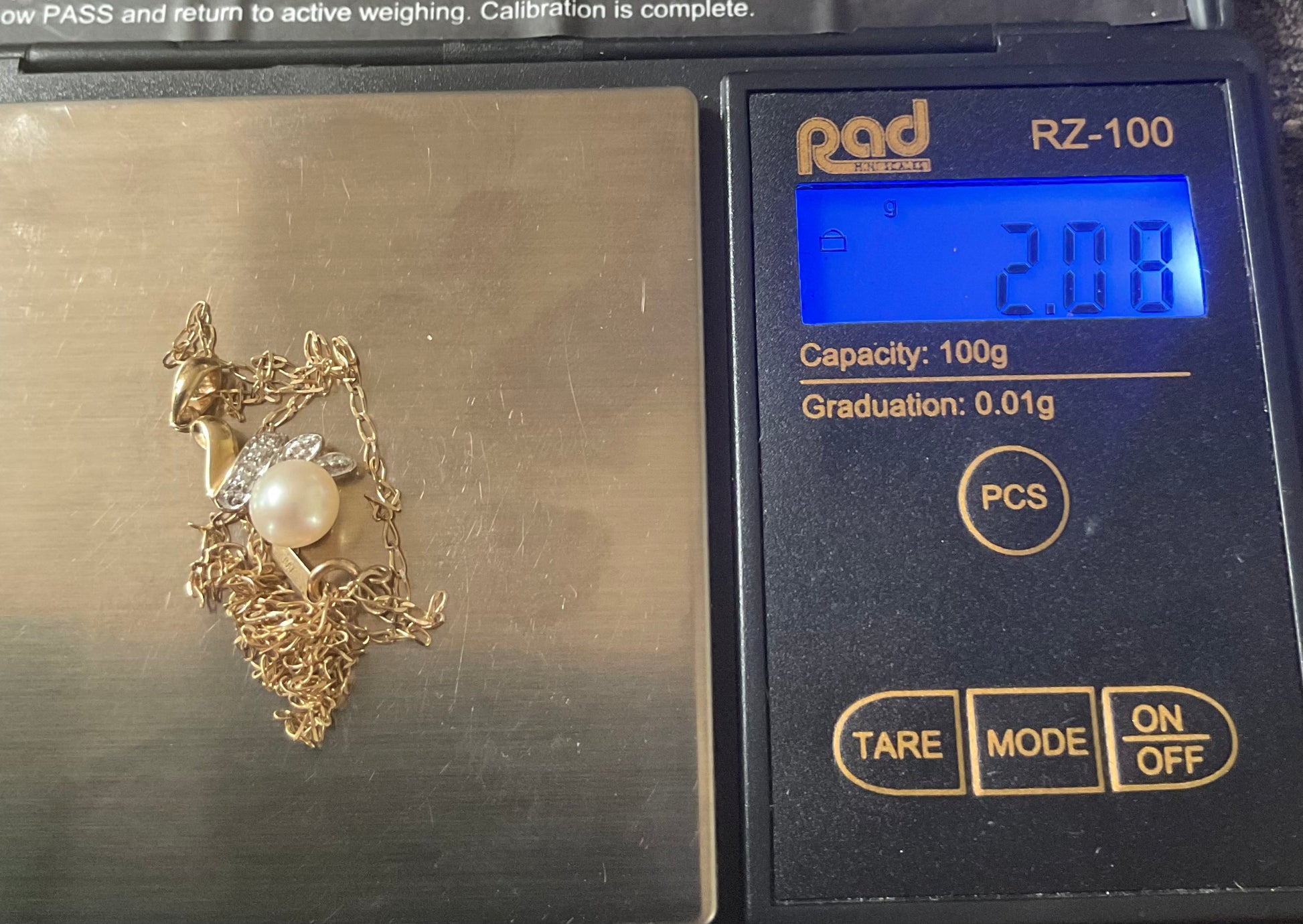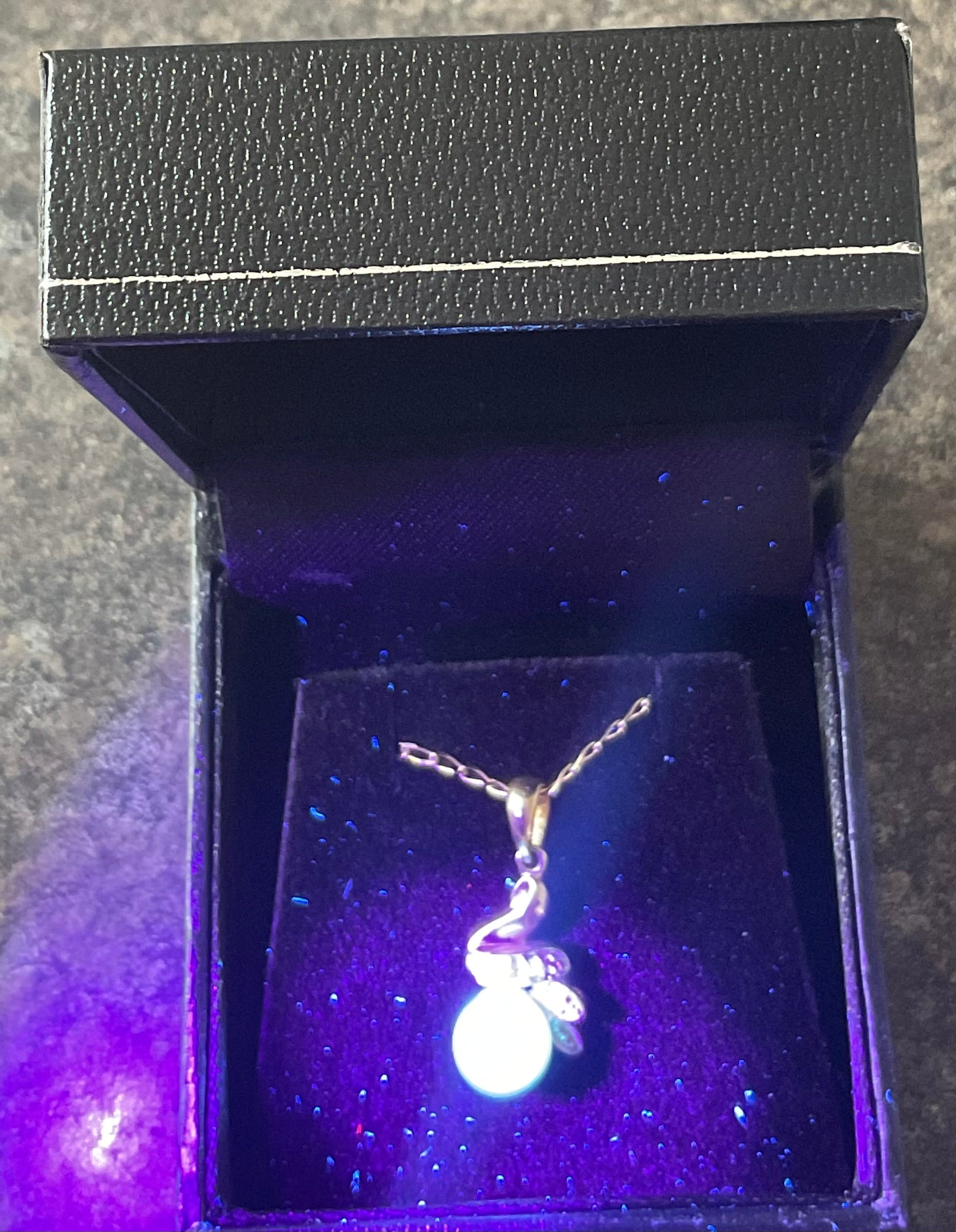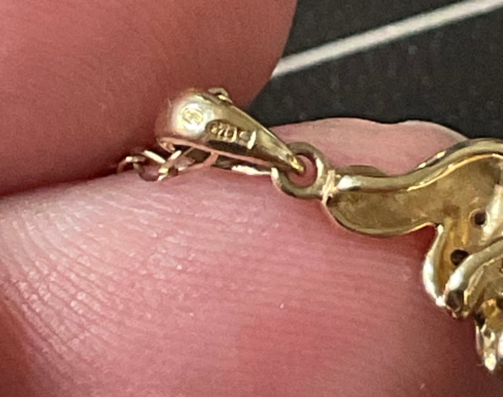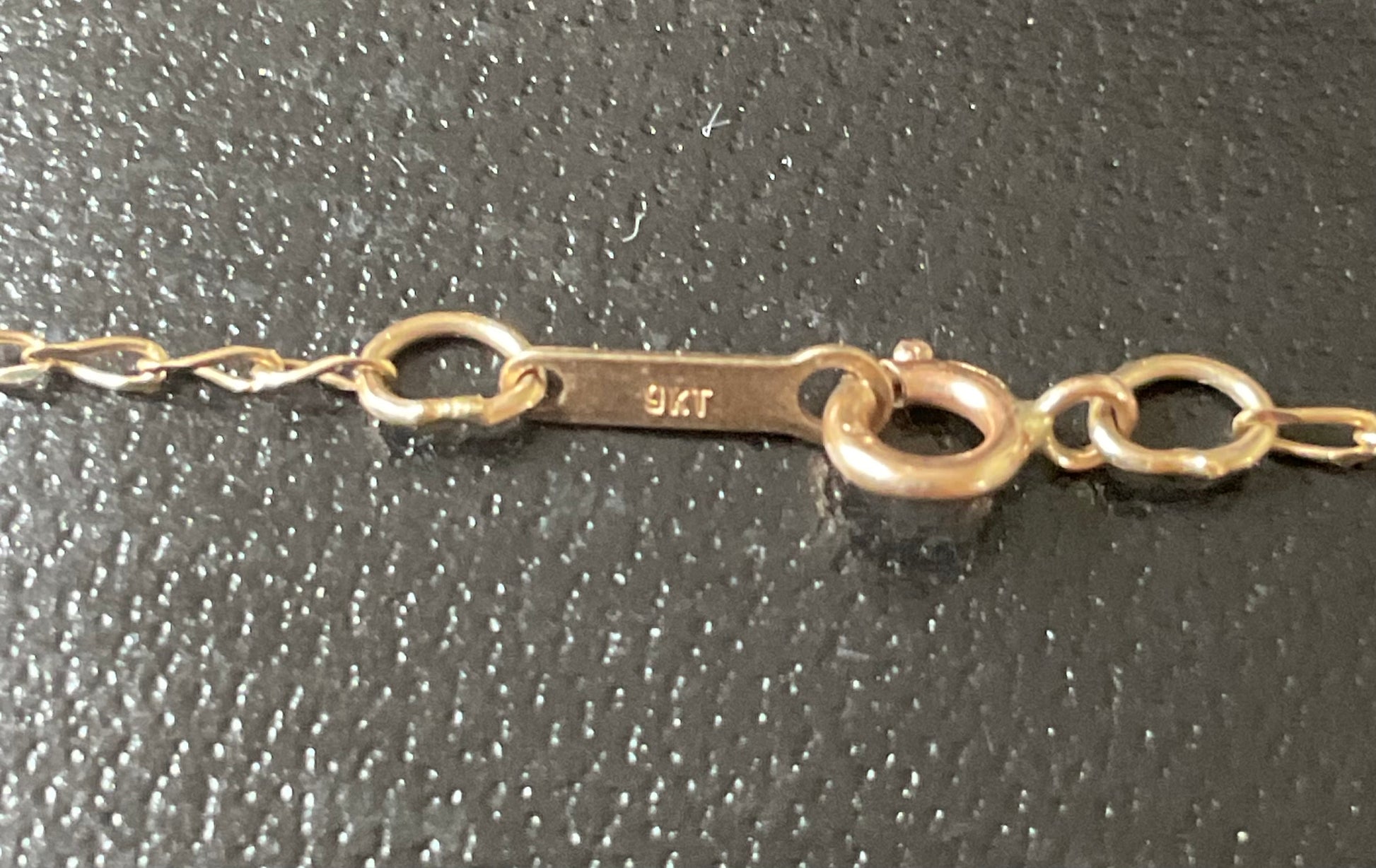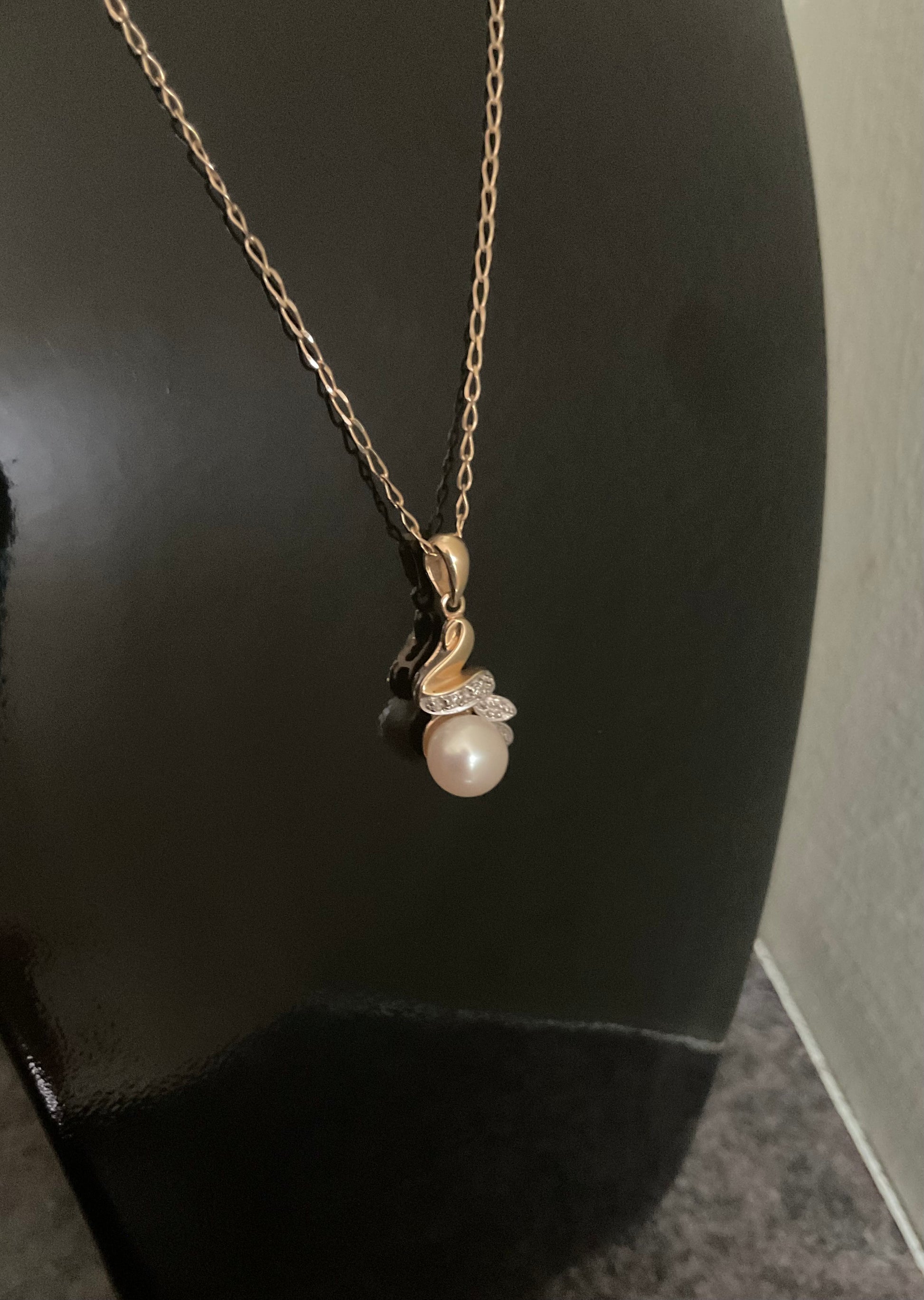 This is such a pretty necklace, featuring a 6mm round white pearl with a 9ct yellow gold, diamond set design above, a bit like an undulating ribbon. I don’t know if the pearl is synthetic or not but it does phosphoresce under uv light as shown in the photos, so I think it’s natural. The pendant measures 2cm in length (including bale) and 1cm wide and is stamped 9K on the back with what I think are the letters NTJ in a chevron. The bale is stamped 375 with the Sheffield assay and with initials in an oval that I can’t make out. The 18” fine chain is stamped 9KT on the little gold tag and 9K on the clasp. It’s a preloved necklace but it’s in really nice condition, needing a loupe to see any signs of wear. It will come in a gift box.