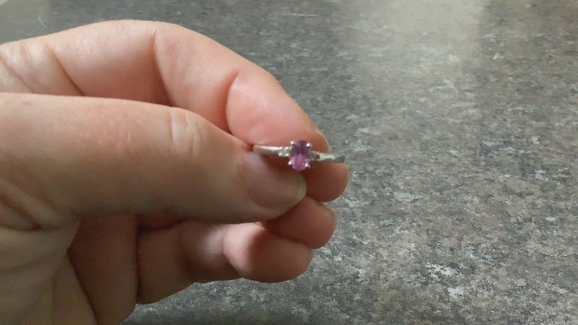 This is a very pretty ring in excellent condition, fully hallmarked for 9ct white gold. It features a 6x4mm oval cut Pink Cuprian Tourmaline stone nestled between a round cut diamond on either side. It will come in a new black leatherette box with a print out of the eCertificate of Authenticity that came with it, as shown in the last photo (a bit scruffy).