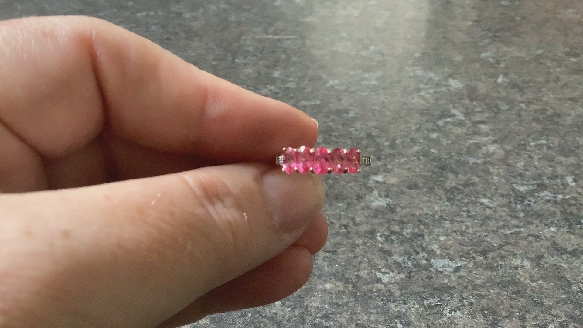 This is a stunning ring in excellent preloved condition, I’m not sure if it’s even been worn. There are 5 beautiful oval cut 5x3mm pink spinel stones and each shoulder is set with 3 small sparkling white zircons. The ring is hallmarked R&C 375 Birmingham and also stamped 375. It’s gorgeous! It’ll come in a new black leatherette box and I have a very scruffy print out of an eCertificate that goes with this ring as shown in the last photo.