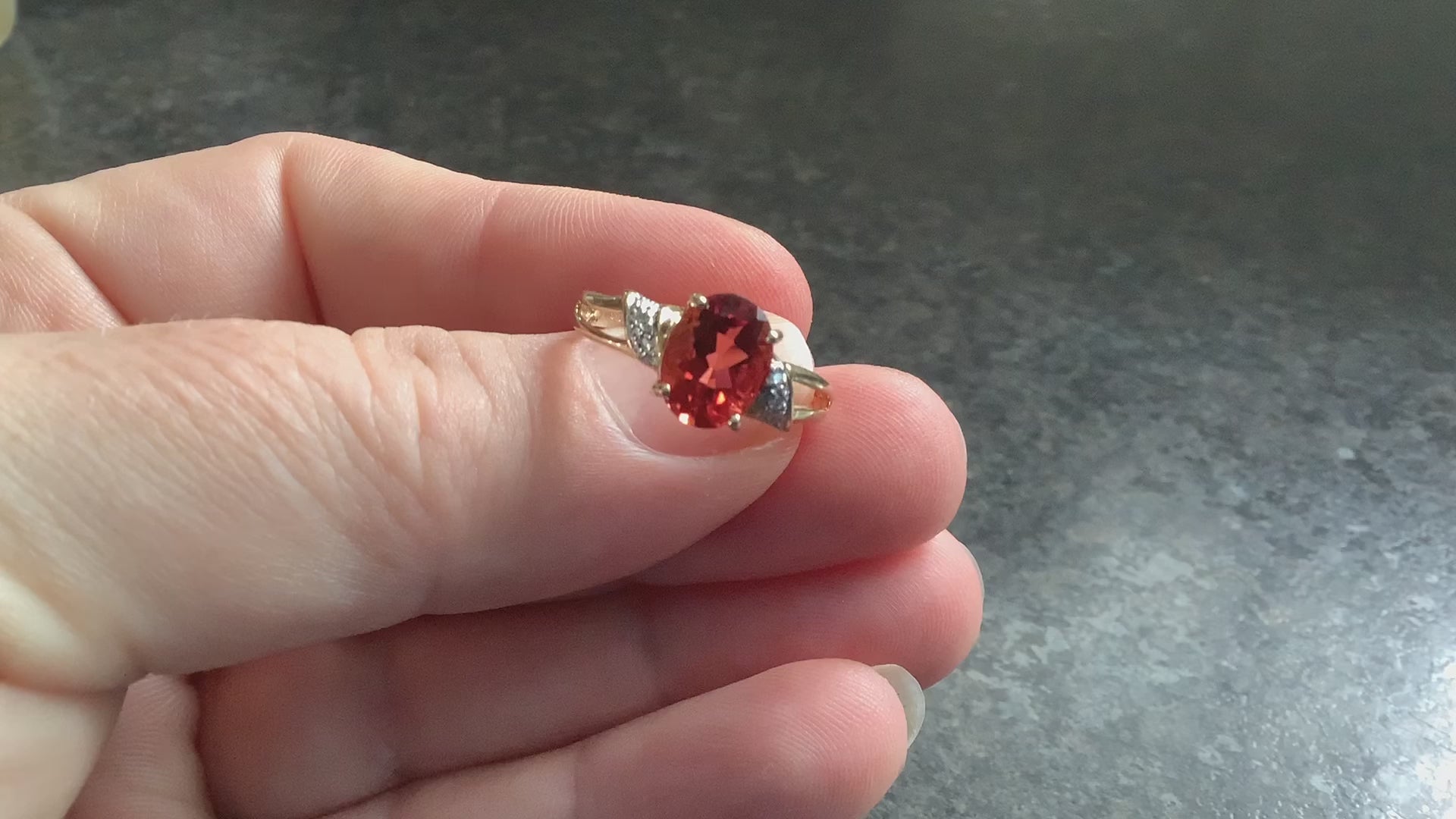 This is a gorgeous ring but I’m afraid I don’t know what the stunning 9x7mm oval cut gemstone is. It has a bright red sparkle in most lights but in others has a bit more of an orangey red colour. I have tried taking photos in different areas of the house for you. The video seemed to give the more orangey version, I’d say it’s generally more bright red than that. It doesn’t show any reaction to UV light. To either side are 3 accent diamonds in a bit of a swirl feature. It is in great preloved condition with only small signs of wear under close inspection. It is hallmarked for 9ct yellow gold. It will come in a black leatherette box.