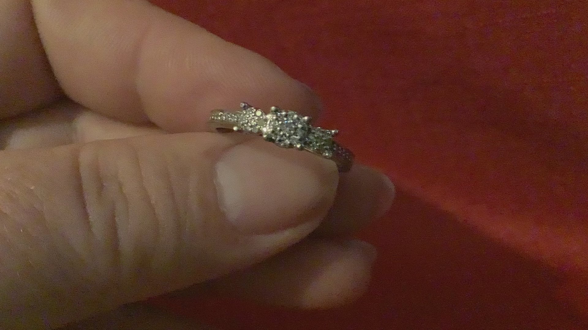This ring is absolutely stunning and the photos really don’t do it justice! It sparkles so beautifully in the light, you get a bit more of an idea from the video. Each of the three clusters is made up of a central diamond surrounded by a halo of diamonds. The diamonds then continue along the shoulders. The ring is stamped 9ct and ZA in an oval which means it was made in South Africa. There is no hallmark as they don’t do hallmarks. It’s preloved so there are small signs of wear and annoyingly you can see that someone has tried to test it for gold and have left bad scratches on the inside of the band. You obviously can’t see when wearing it or feel it. It really is a beautiful ring. It will come in a black leatherette box.