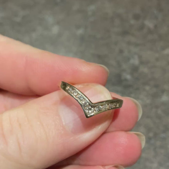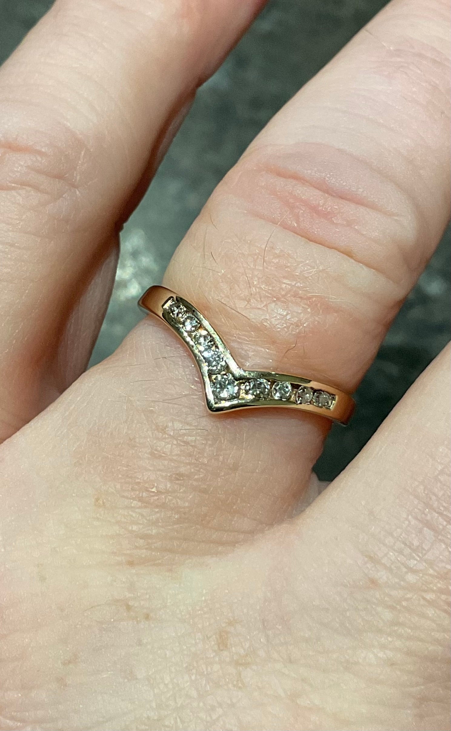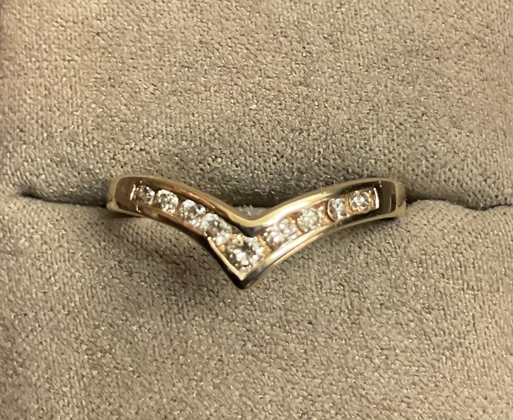 This is a beautiful 9ct gold wishbone ring set with 9 round cut sparkling diamonds, totalling 0.25ct in weight. It is stamped with 375 DIA 0.25 and a full hallmark. This ring is preowned but in nice condition with small signs of wear on close inspection. It will come in a gift box.