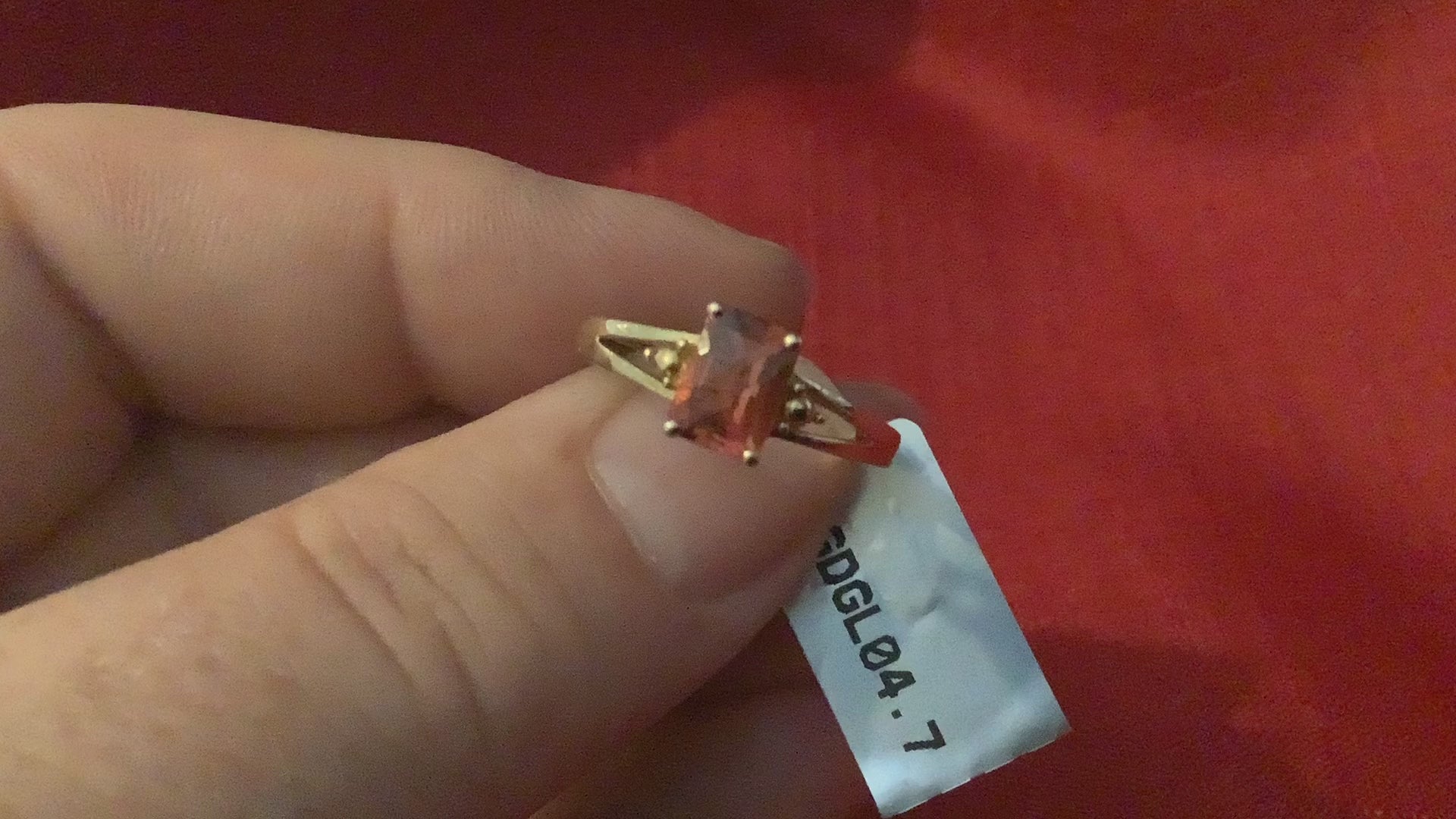 This is a lovely ring with a very pretty peach cushion cut stone measuring 7x5mm. Either side is a little gold bobble. The ring is stamped TGGC and has the 375 hallmark but is also stamped 10K and 417. It’s still got the tag on, so hasn’t been worn but has been stored in a jewellery box for quite a long time. The last photo shows the same ring on the Gemporia website (used to be TGGC). It will come in a new black leatherette box.