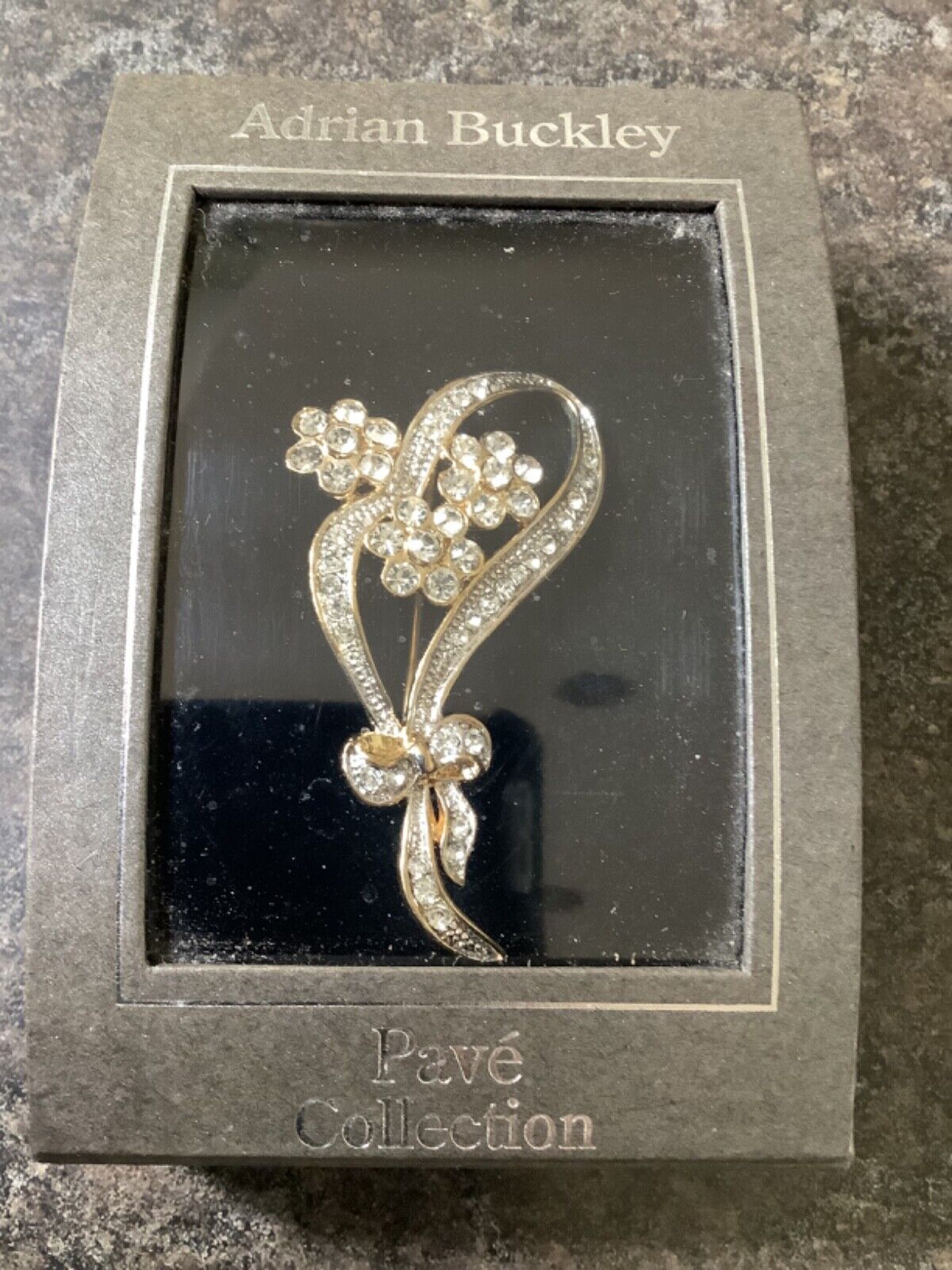 This is a very pretty brooch measuring 5.3cm by 2.8cm. It’s gold tone with pave set crystals, one isn’t completely flat but it’s firm in its setting. There are no stamps at all on this but it does come in its original Adrian Buckley box that is a little dusty. It’s in good preloved condition with only small signs of age/discolouring but that may polish up.