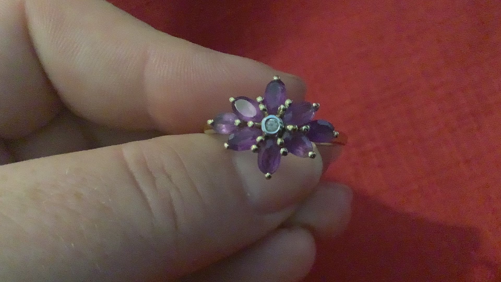 This gorgeous ring has such lovely plum purple colour amethyst stones. It is stamped 925 but has a gold overlay, I don't know what carat the gold is sorry. It has been worn so has small signs of wear but is in good condition. I don't know what the central clear stone is sorry but it isn't a diamond. The design measures about 1.8cm across and 1.3cm wide. It will come in a gift box.