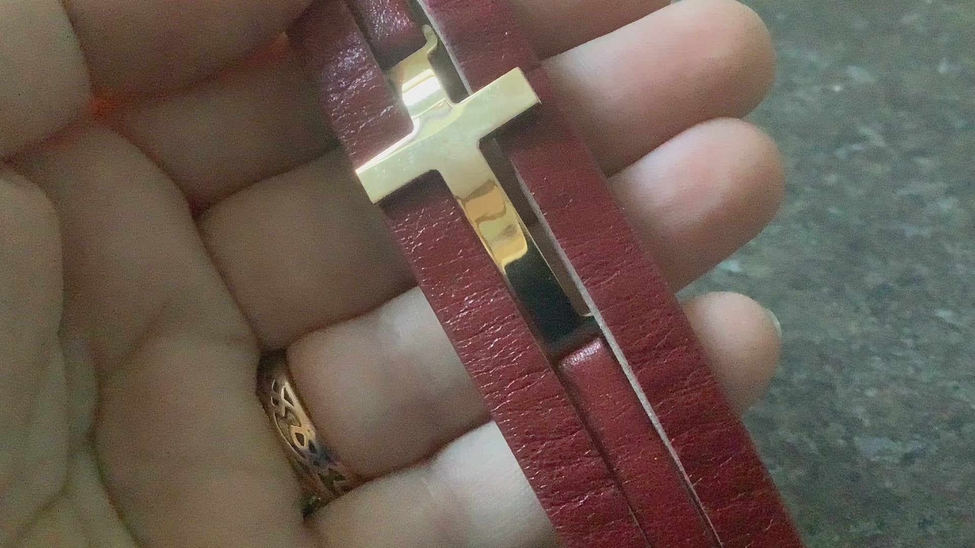 This is a really smart bracelet that has never been worn, just stored for a while in its purple BRONZO ITALIA pouch. The band feels like leather but there are no leather stamps, so I don’t know what material it is for sure. The surface is a lovely rich burgundy red and it measures 2.2cm across. The cross is curved and measures 4.2cm by 2cm and is stamped BRONZE MILOR ITALY at the centre on the back. The clasp is magnetic, so it’s very easy to put on and take off and there’s 2 little safety catches. The bracelet measures 18.5cm in length and your wrist needs to be smaller than this. I’d say may wrists are about this size, maybe a tiny bit bigger and it’s a bit snug which tests the attraction of the magnets holding it together, the clasps obviously help but I would say you need wrists less than 18.5cm in circumference. Looking at other sites, it seems that this jewellery is 18ct gold plated over bronze. The cross looks to be yellow gold plated whilst the catches look to be rose gold plated.