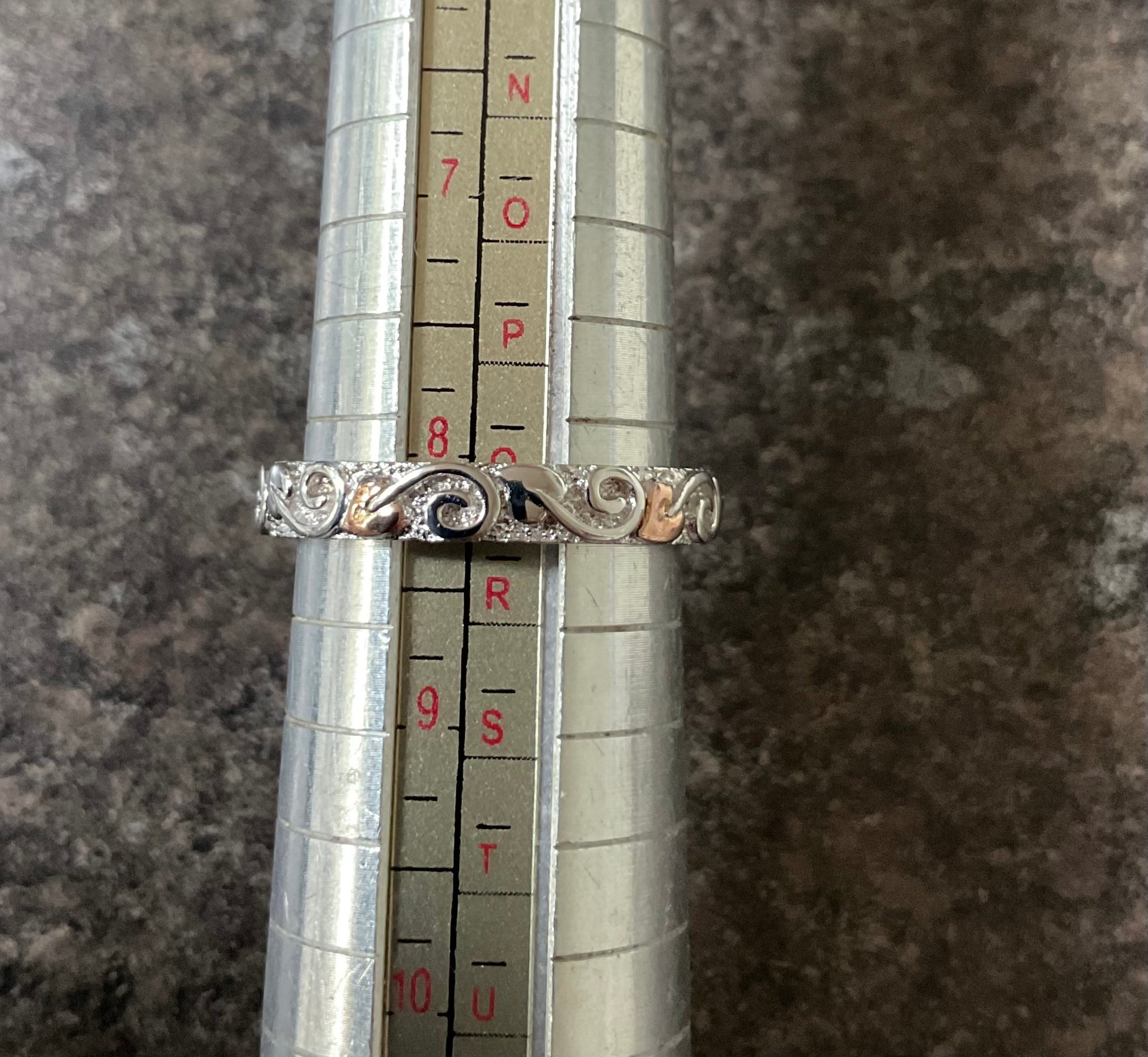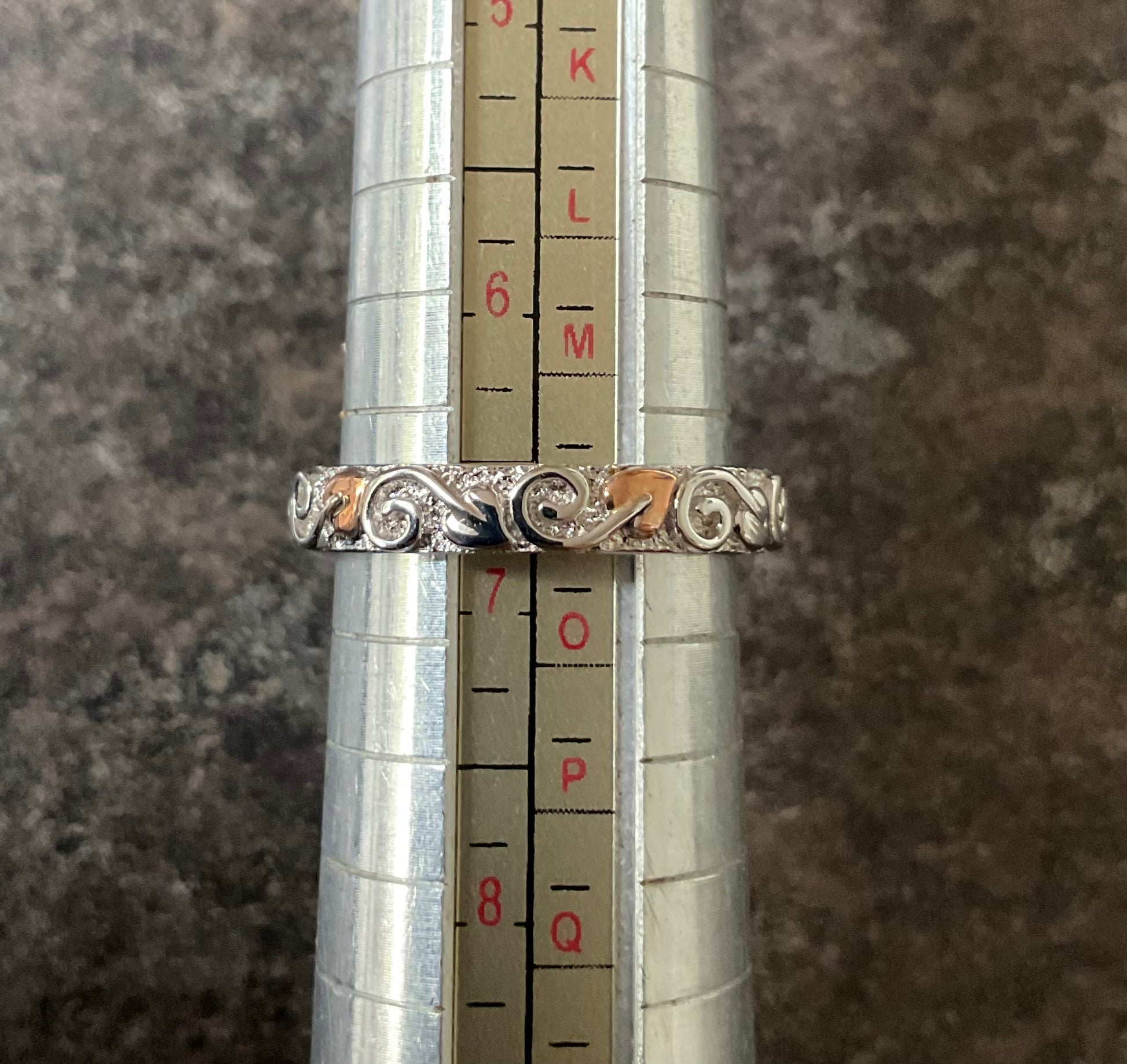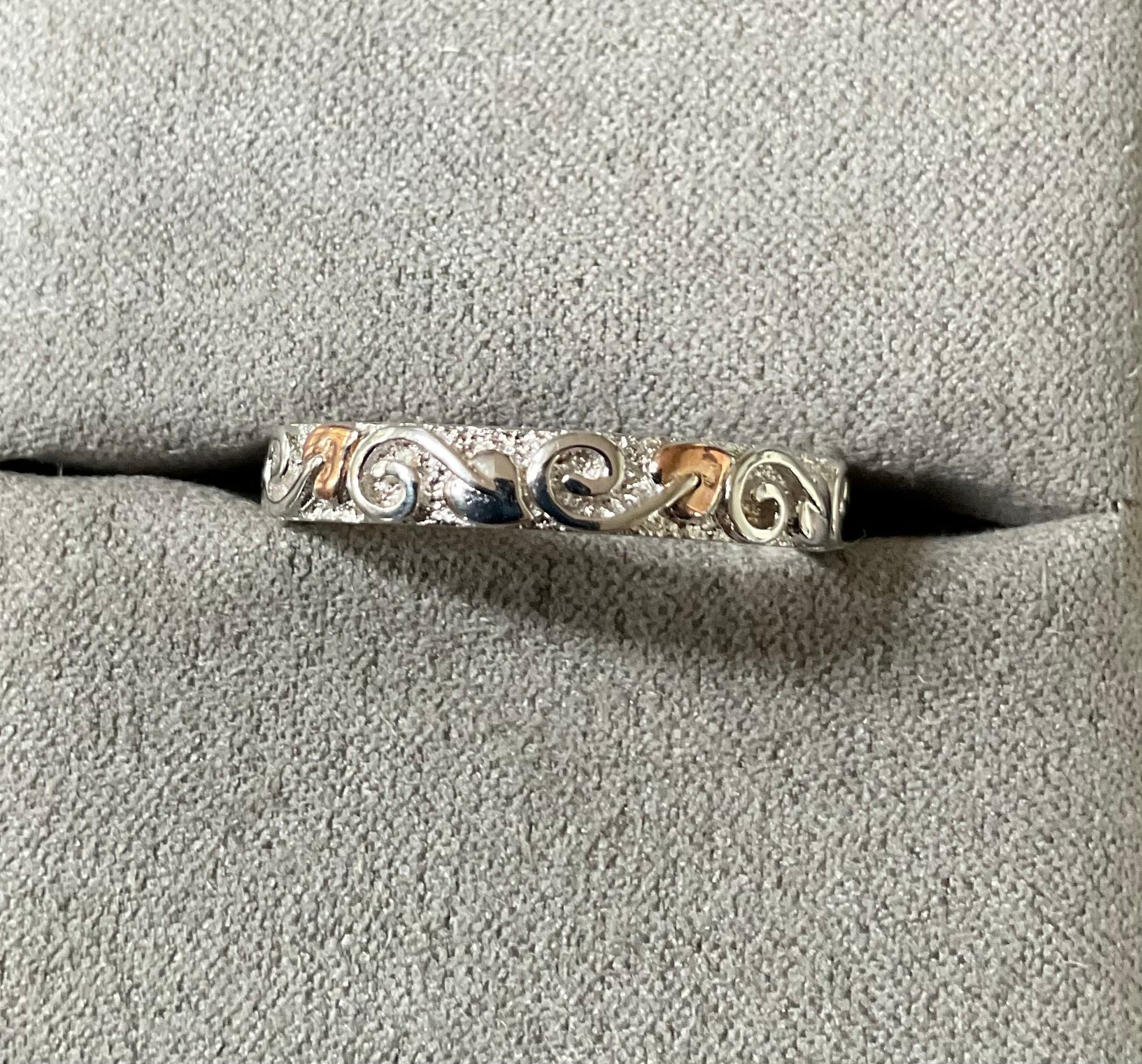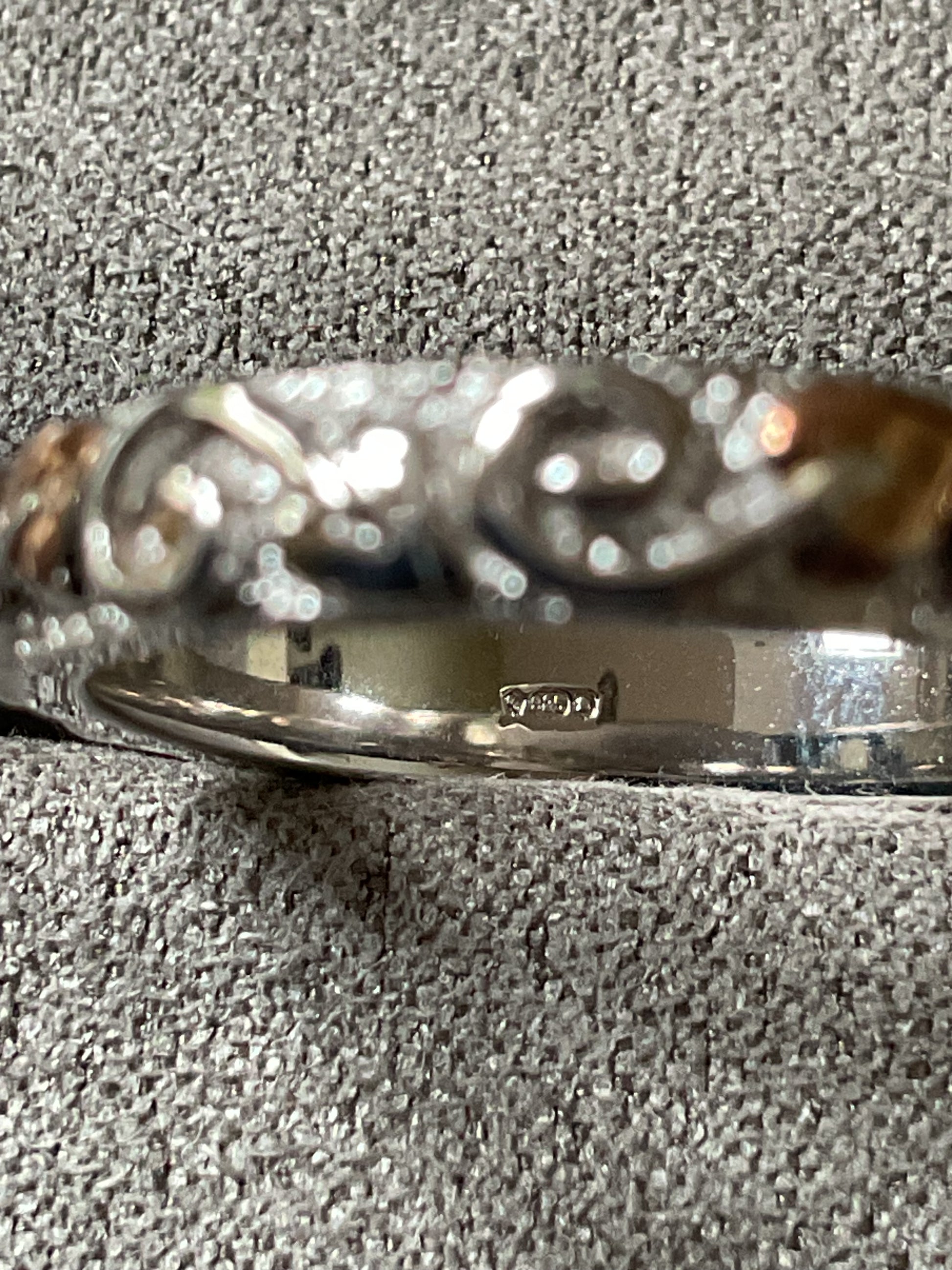 This is a very pretty, eye catching Clogau band ring, that looks great on its own or as a stacking ring. It would make a beautiful wedding band. It’s 4mm wide and has a textured silver background, which is almost sparkly and at the forefront is a continuous row of leaves with swirled stems in a full eternity style, so the ring can spin and you’ll always see the design. Every alternate leaf is rose gold, whilst the rest of the ring is 925 sterling silver. The inner band has the Clogau hallmark and stamps. This ring is unworn so in excellent condition and comes in a new Clogau box with Clogau cleaning cloth.