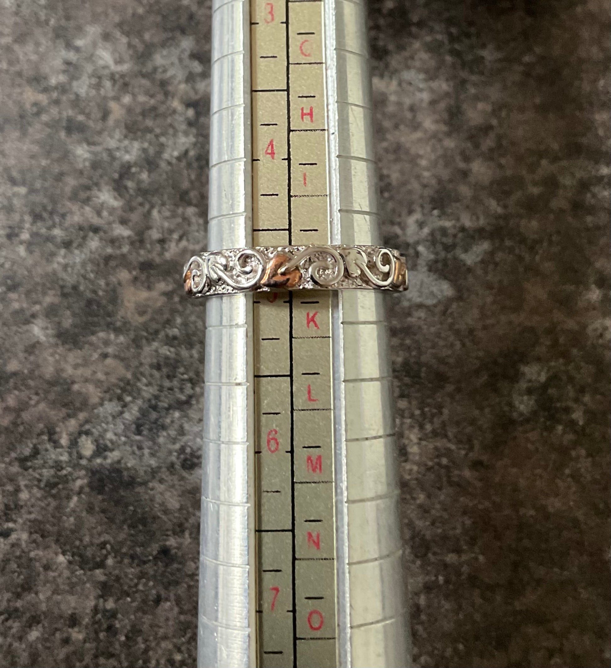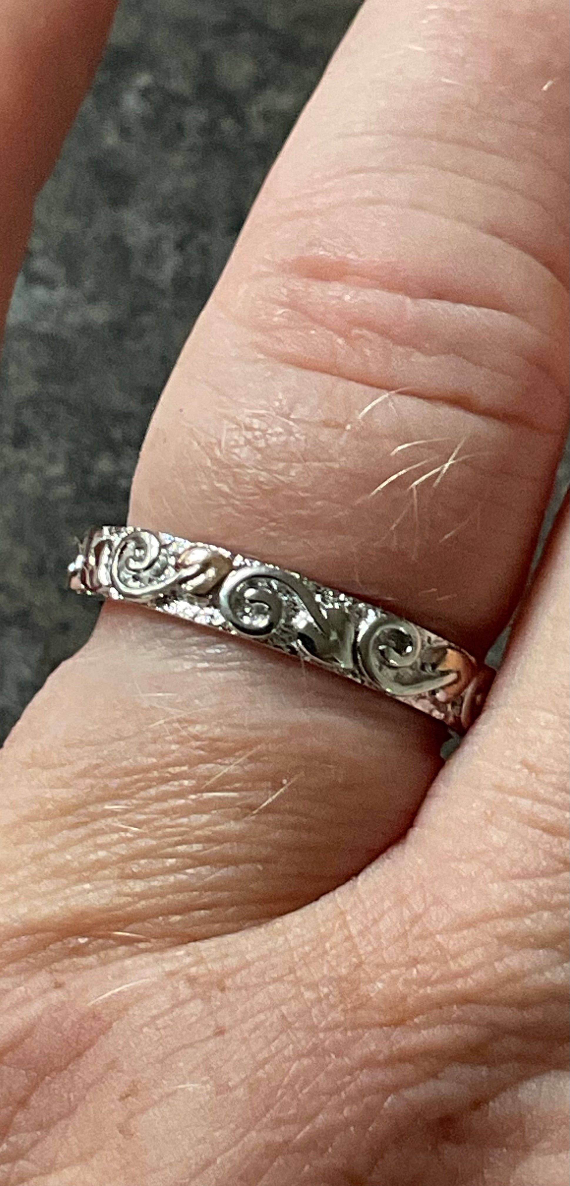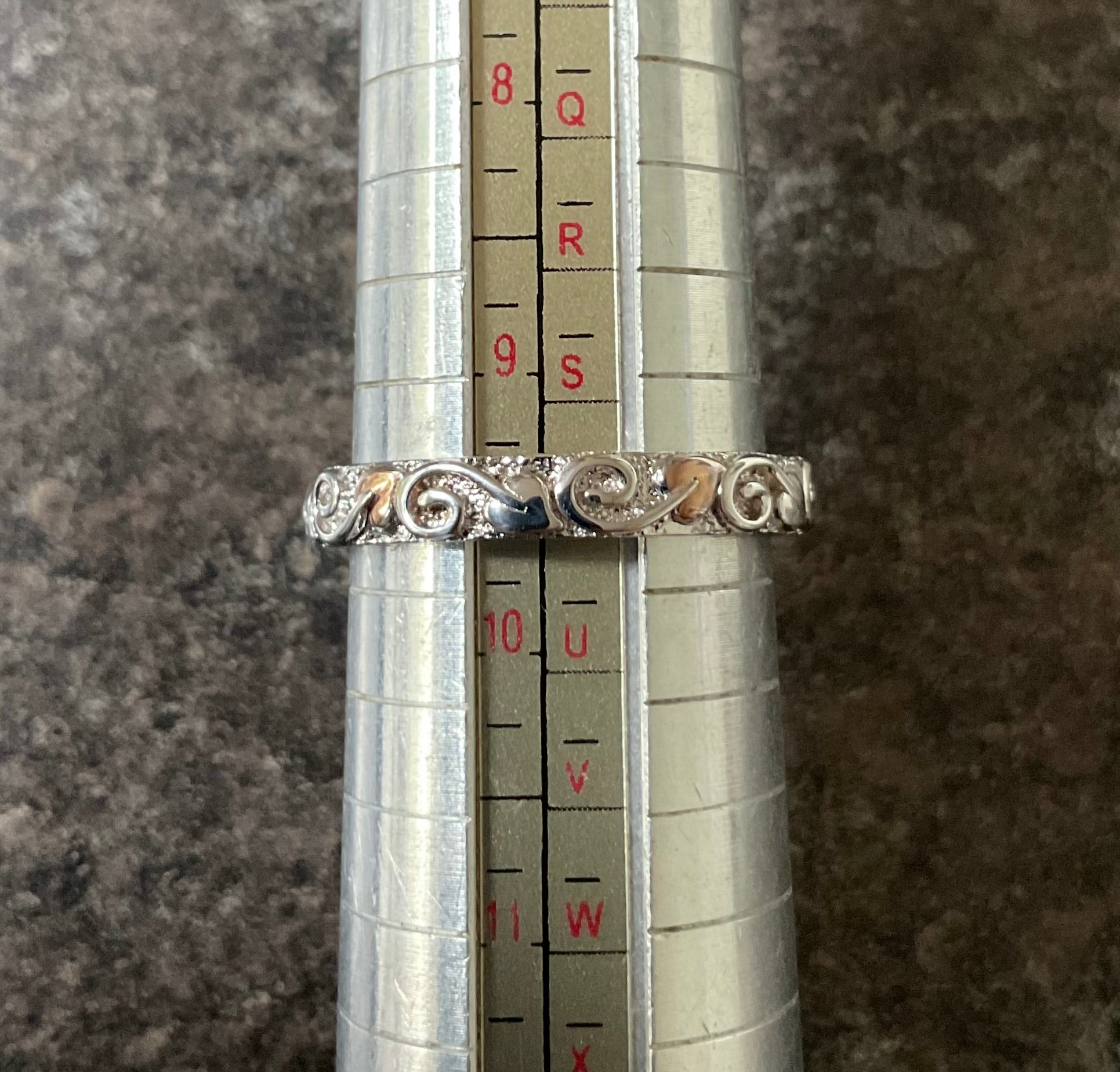 This is a very pretty, eye catching Clogau band ring, that looks great on its own or as a stacking ring. It would make a beautiful wedding band. It’s 4mm wide and has a textured silver background, which is almost sparkly and at the forefront is a continuous row of leaves with swirled stems in a full eternity style, so the ring can spin and you’ll always see the design. Every alternate leaf is rose gold, whilst the rest of the ring is 925 sterling silver. The inner band has the Clogau hallmark and stamps. This ring is unworn so in excellent condition and comes in a new Clogau box with Clogau cleaning cloth.