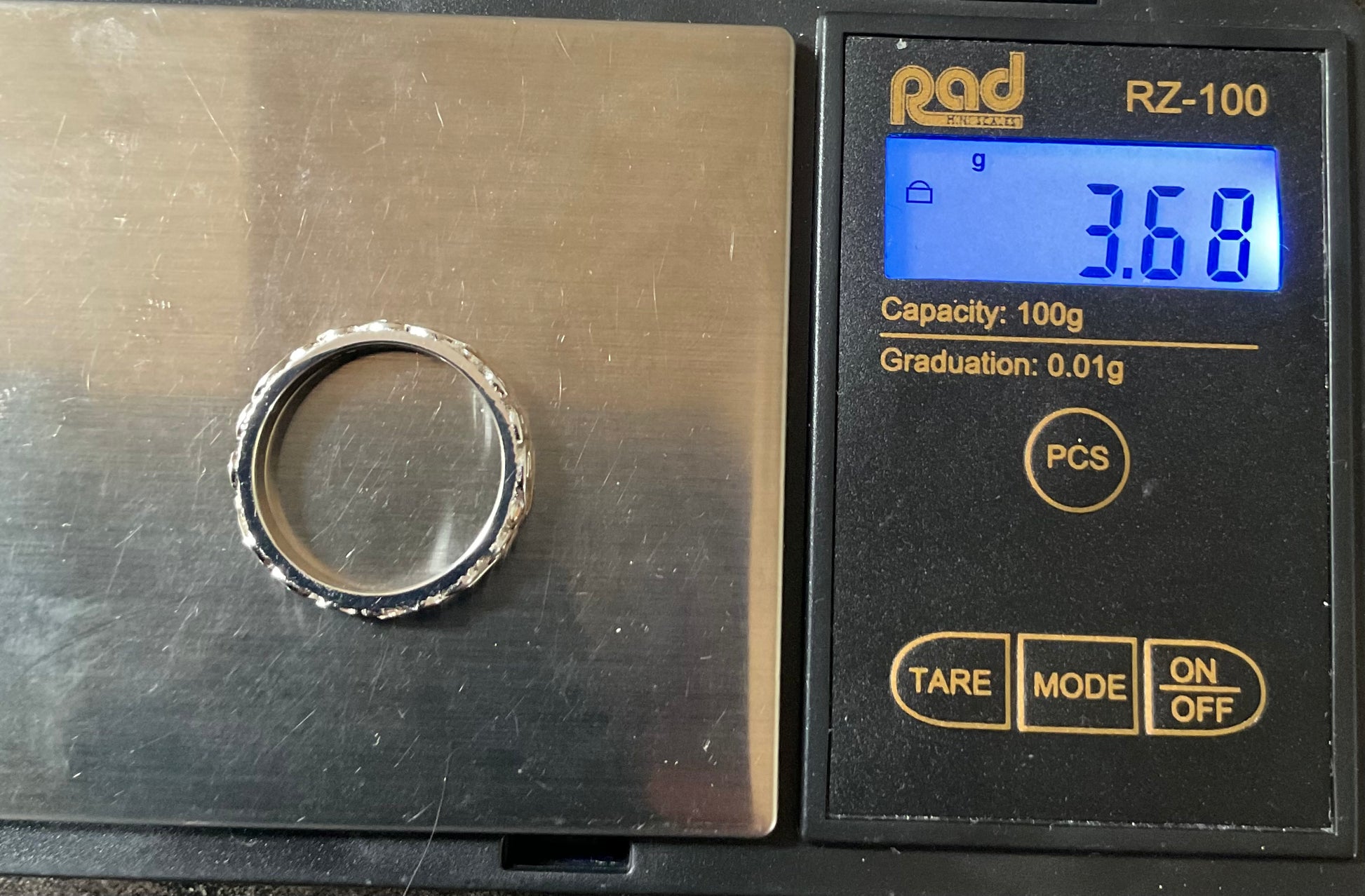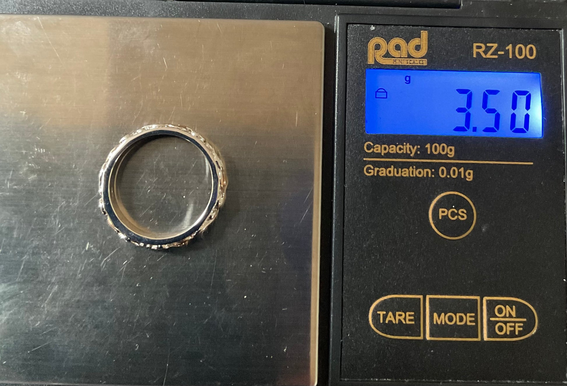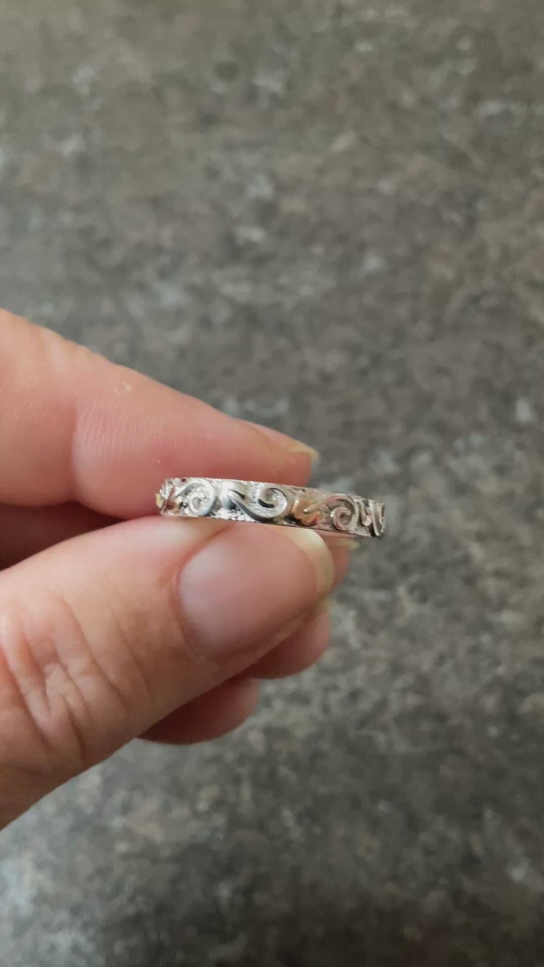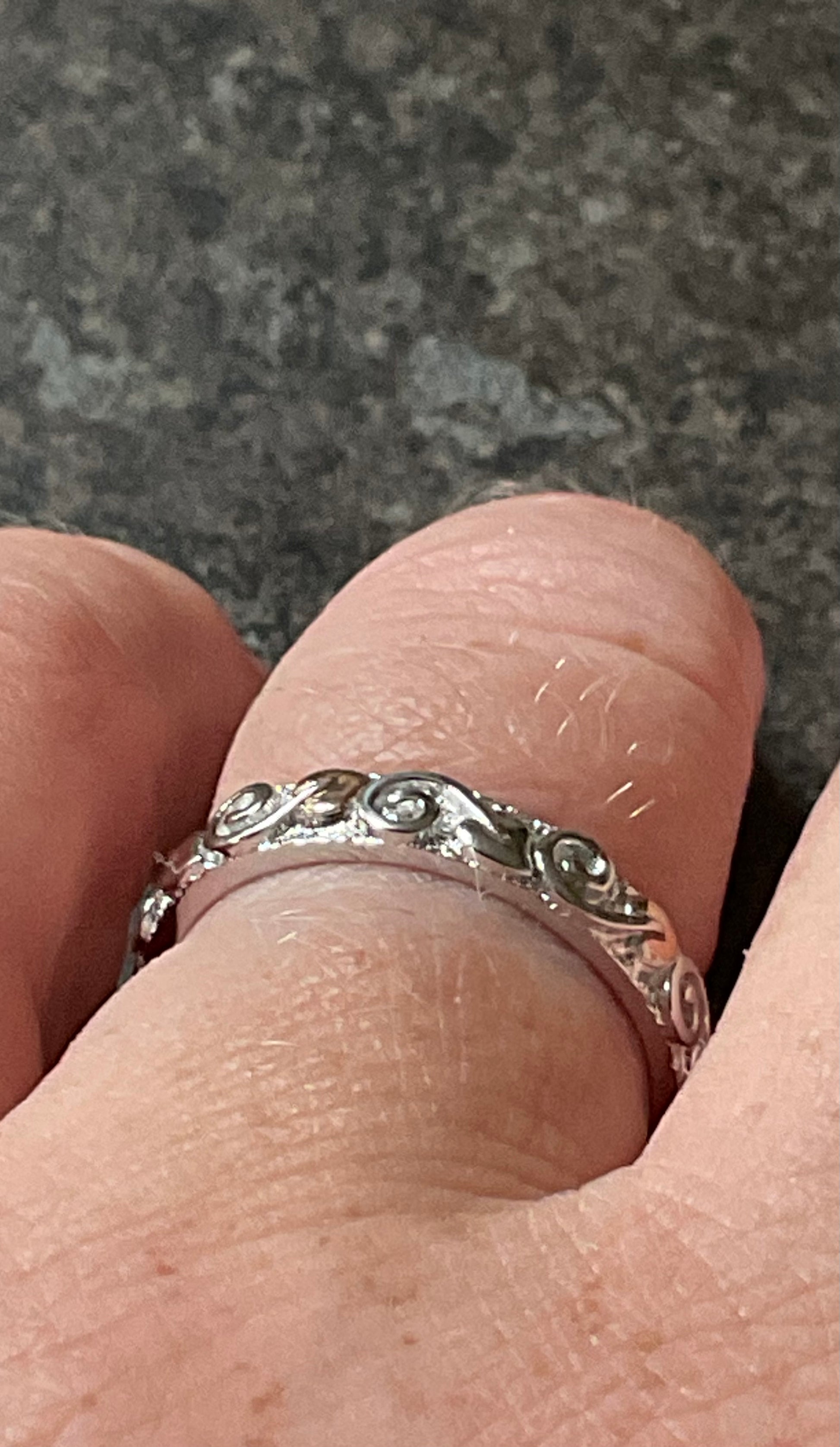 This is a very pretty, eye catching Clogau band ring, that looks great on its own or as a stacking ring. It would make a beautiful wedding band. It’s 4mm wide and has a textured silver background, which is almost sparkly and at the forefront is a continuous row of leaves with swirled stems in a full eternity style, so the ring can spin and you’ll always see the design. Every alternate leaf is rose gold, whilst the rest of the ring is 925 sterling silver. The inner band has the Clogau hallmark and stamps. This ring is unworn so in excellent condition and comes in a new Clogau box with Clogau cleaning cloth.