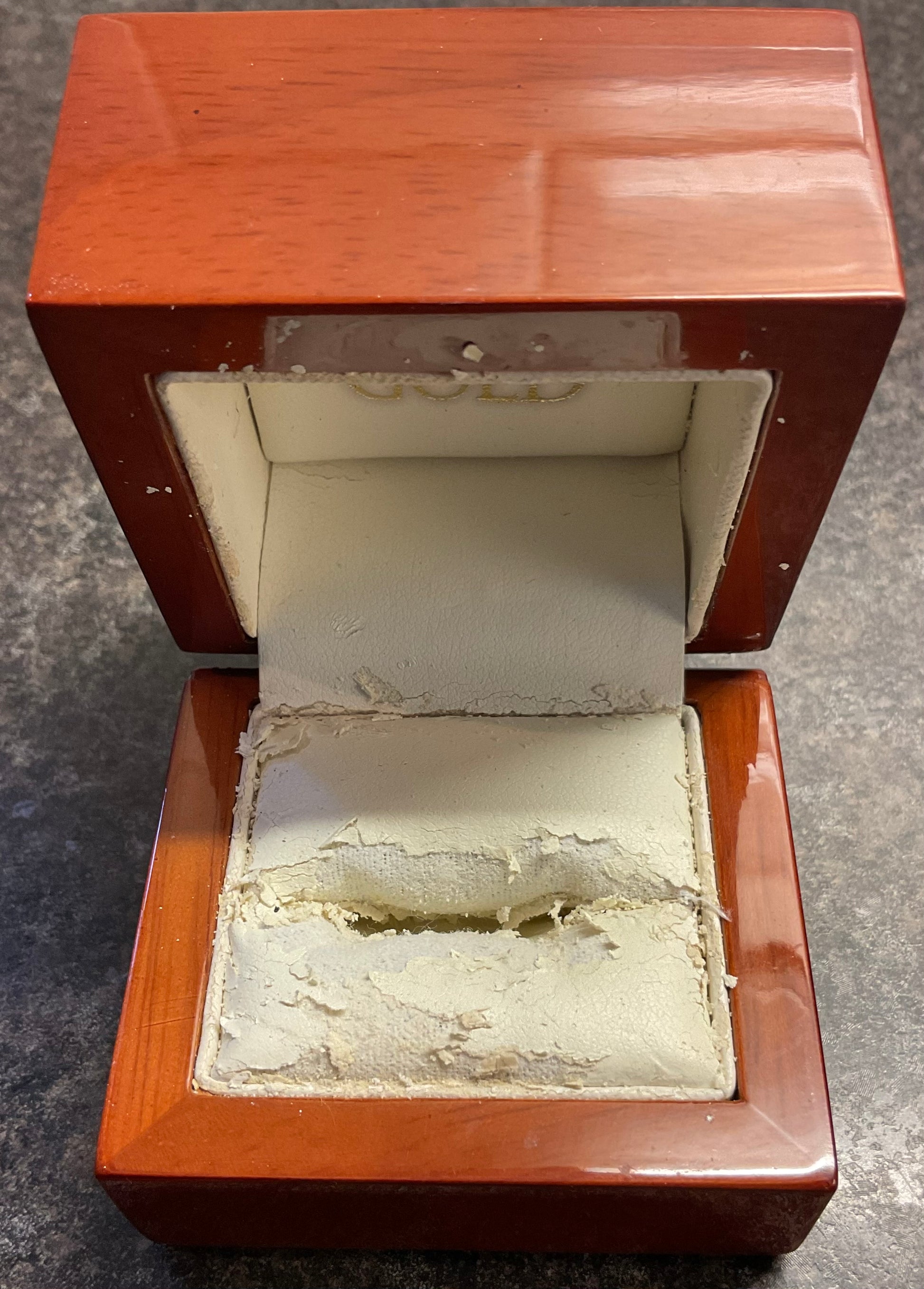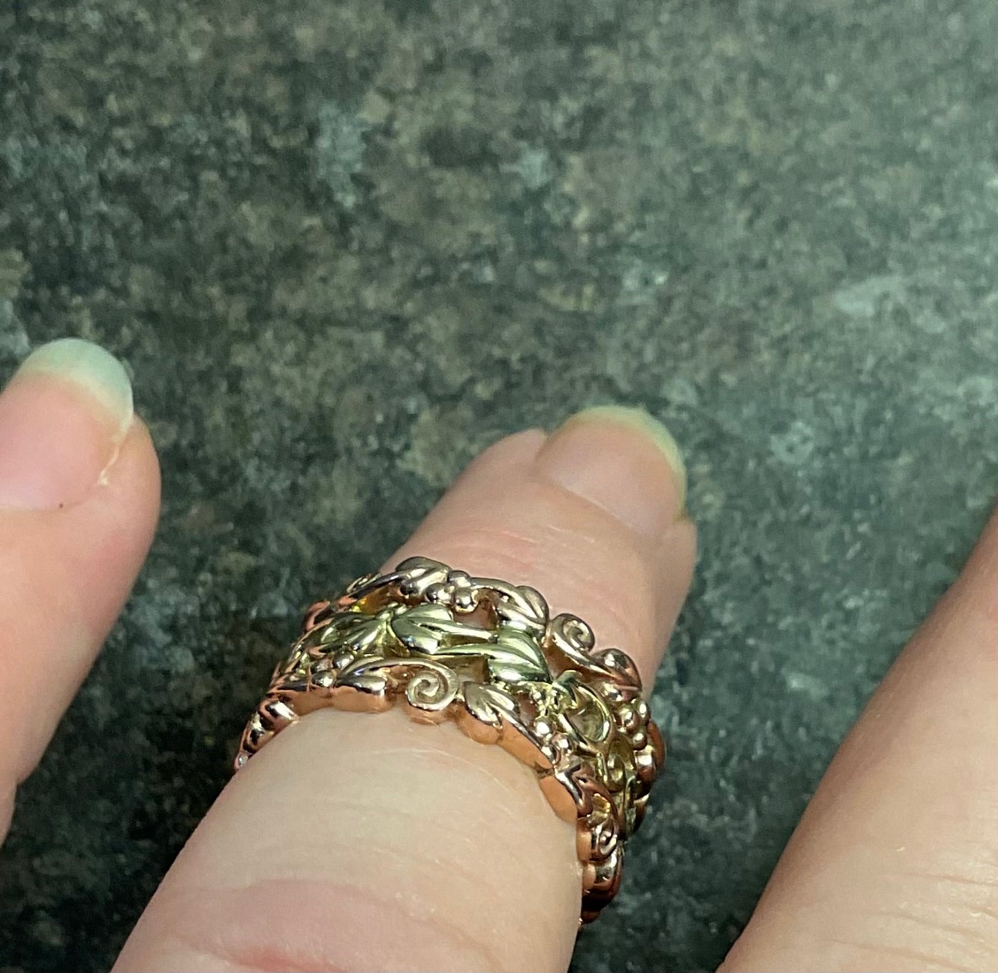 This is a gorgeous Clogau ring with the outer Tree of Life bands made from 9ct rose gold, whilst the inner band is 9ct yellow gold. I think this would make a lovely, unusual wedding ring. It is in excellent preowned condition with small signs of wear on really close inspection. As you can see from the ring sizer, the central band falls just after the L mark and the band is 9mm across at its widest. The ring weighs a substantial 7g and is stamped Clogau inside with the 9ct hallmark and Welsh Dragon stamp. It comes in its original wooden Clogau box that is in good condition on the outside but very poor condition on the inside. If you would prefer it to come in a white Clogau ring box instead, please let me know as soon as you have made your purchase.