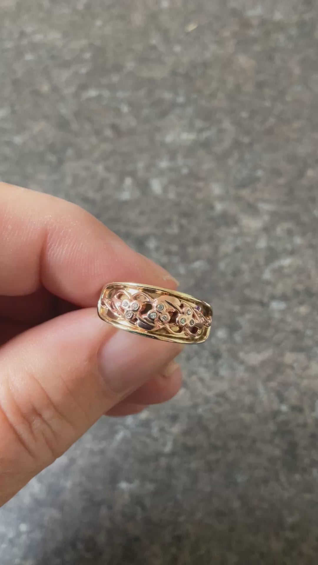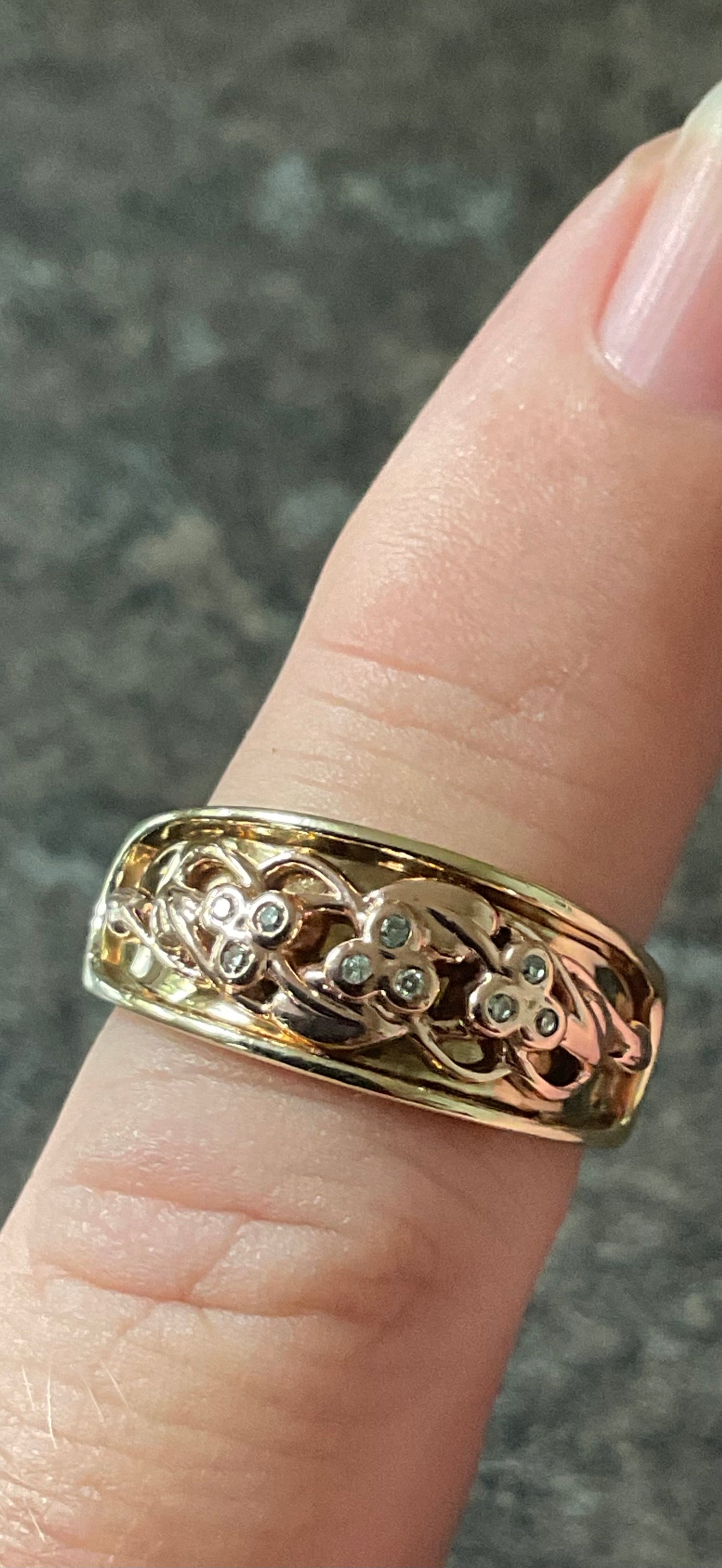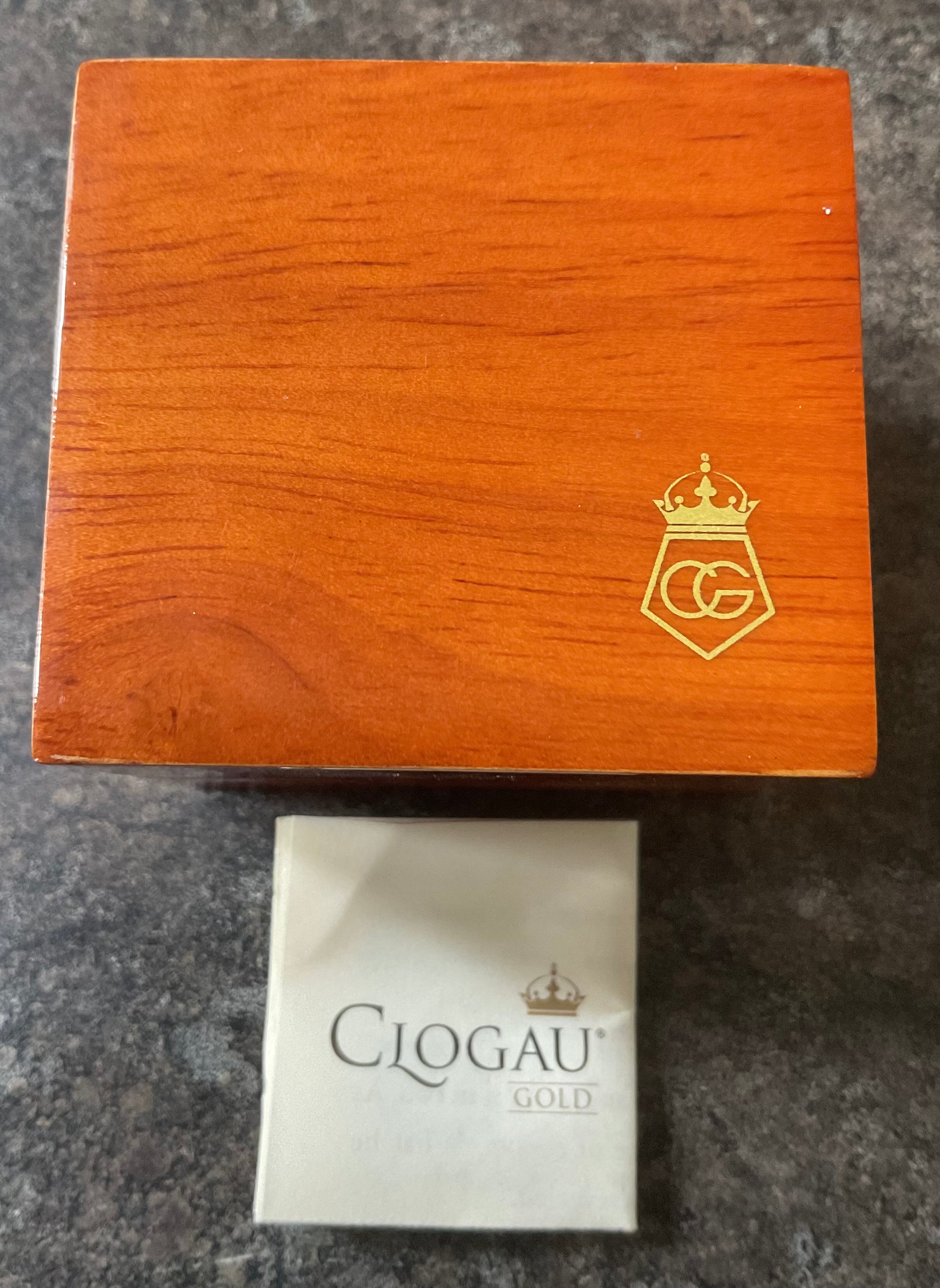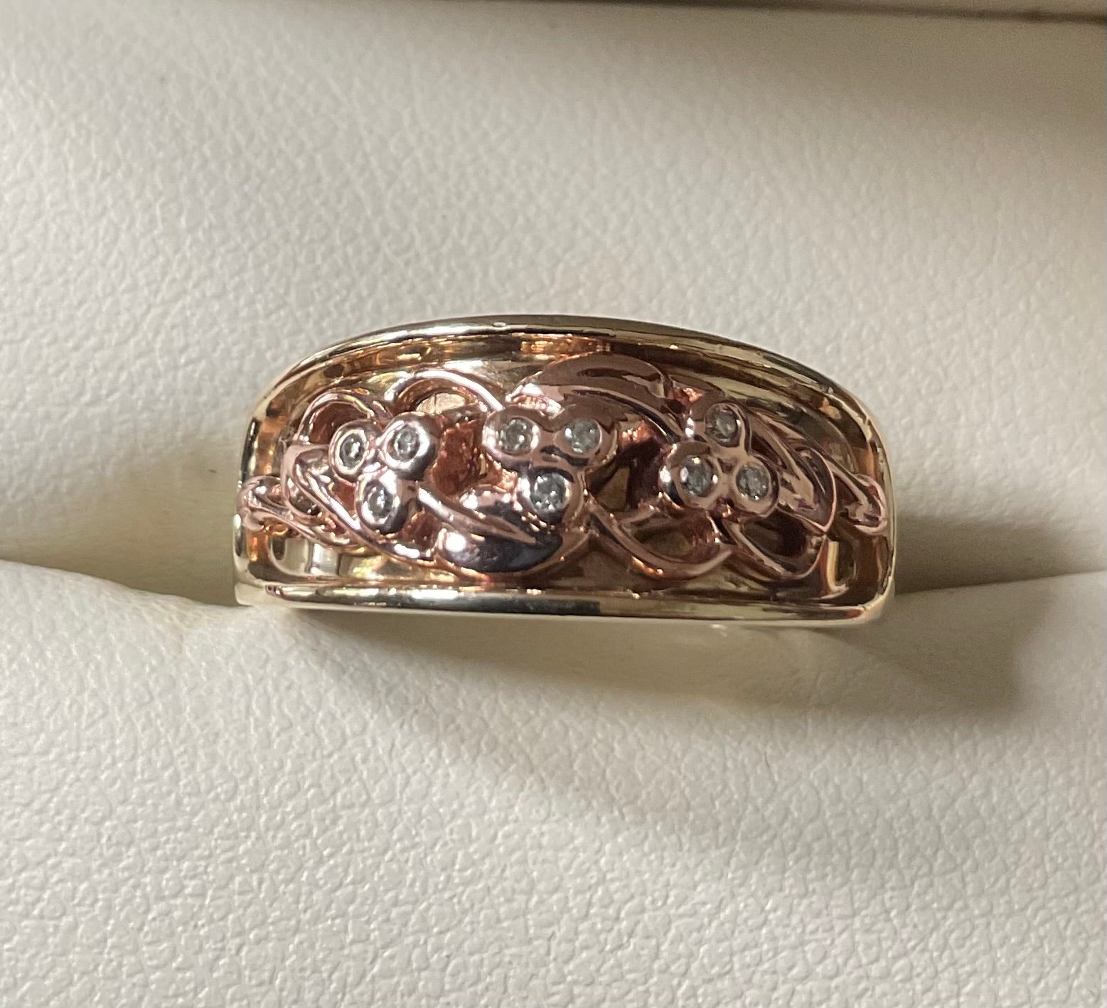 This beautiful ring was released to commemorate the Wedding of Prince William to Kate Middleton, as inside is engraved with the date ‘29th April 2011’. It is also engraved with the Welsh words ‘Cariad Am Byth’ which means ‘beloved forever’. Along the centre of the ring are 9 brilliant-cut, bright diamonds. These entwine with rose gold vines to symbolise the most touching moments of your life - past, present and future. The band is yellow gold and measures 8mm across at its widest. This band also has the Clogau gold hallmark inside. The ring is a size K and weighs a substantial 4.60g. It comes in the wooden Clogau box shown (that has small wear but is in good condition), the little certificate booklet and the certificate that was released with this specific ring. The ring has been worn and whilst it is in good overall condition, there are signs of wear/dinks in the surface of the band that are visible by eye when you look for them.