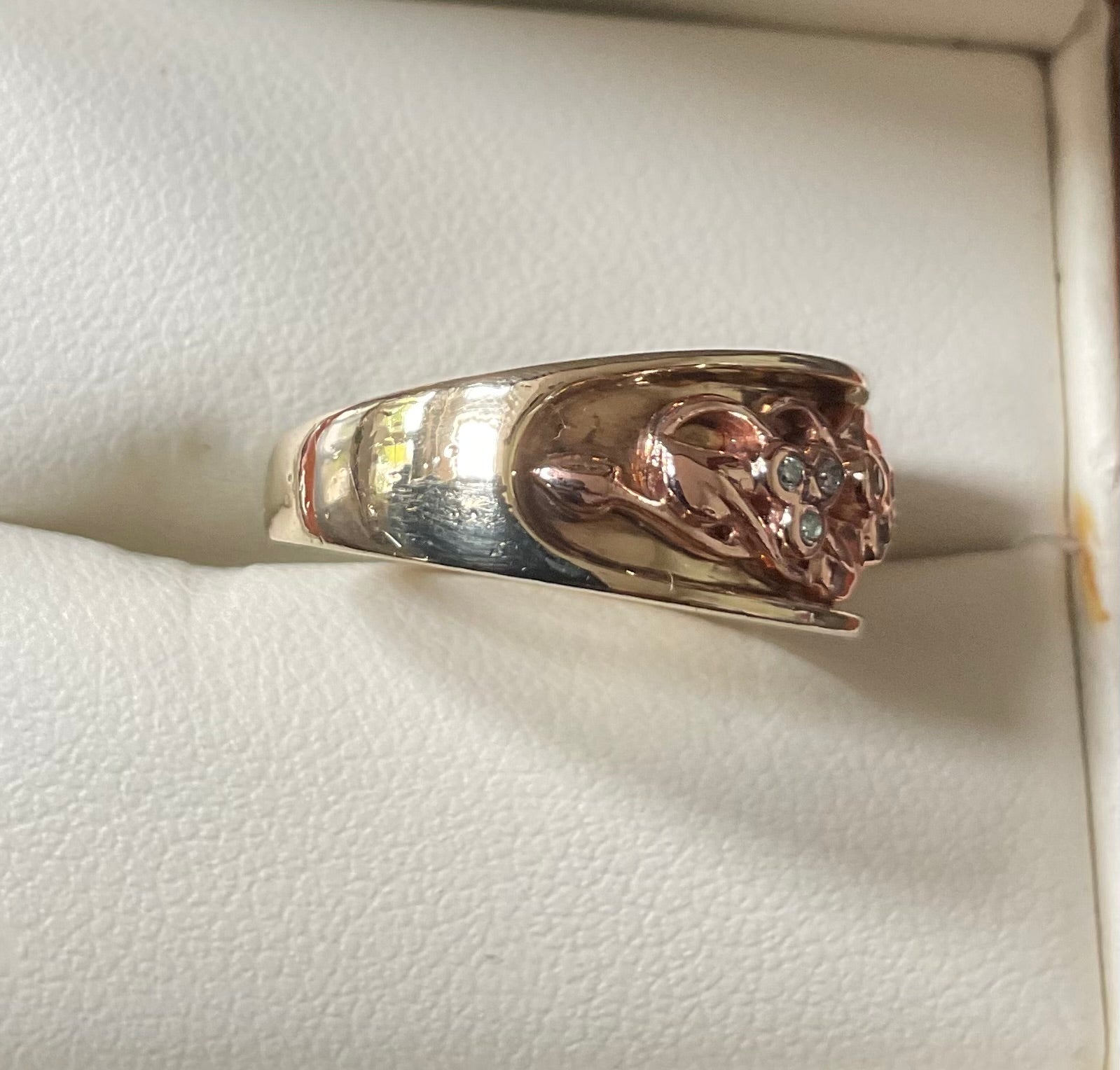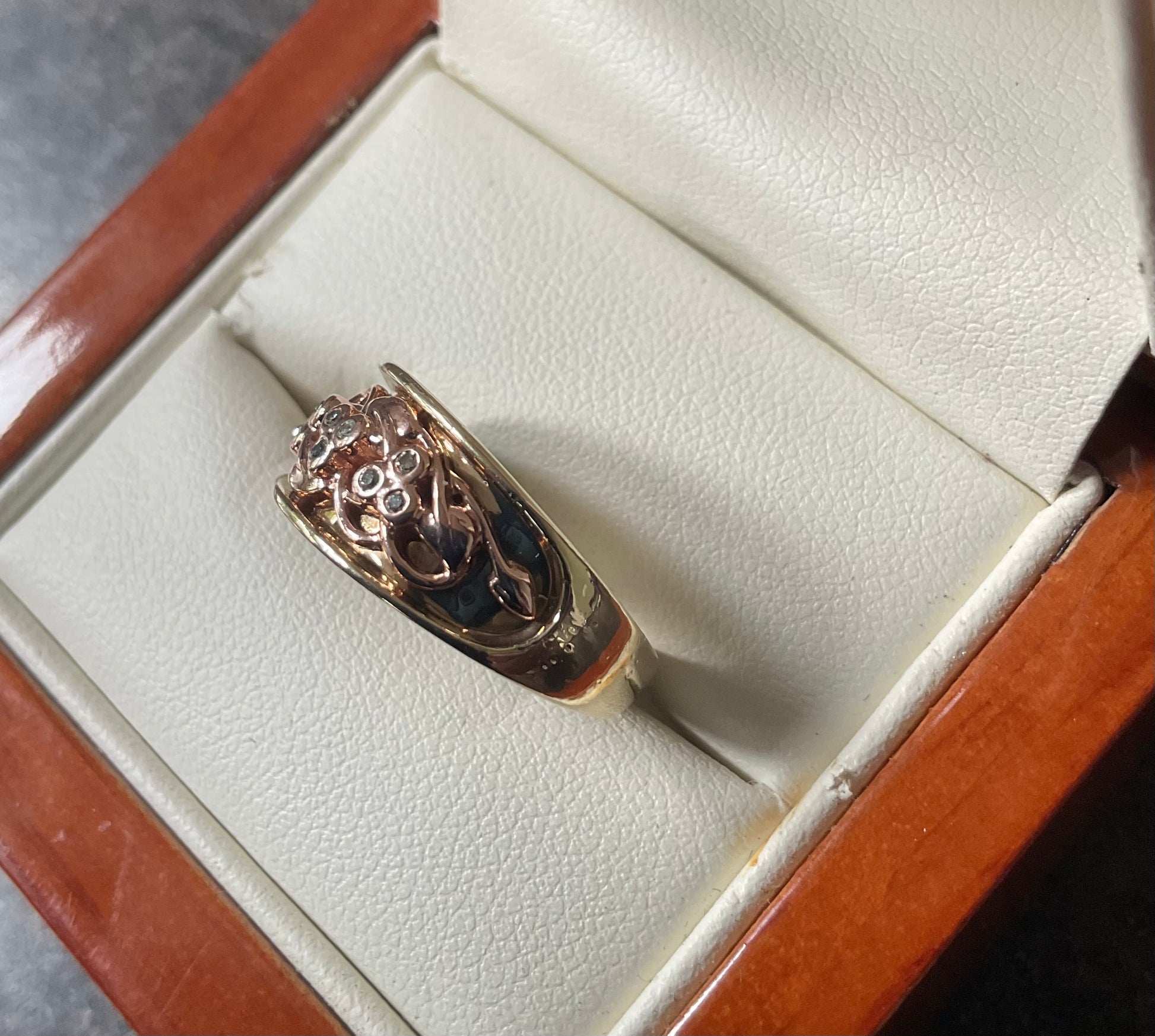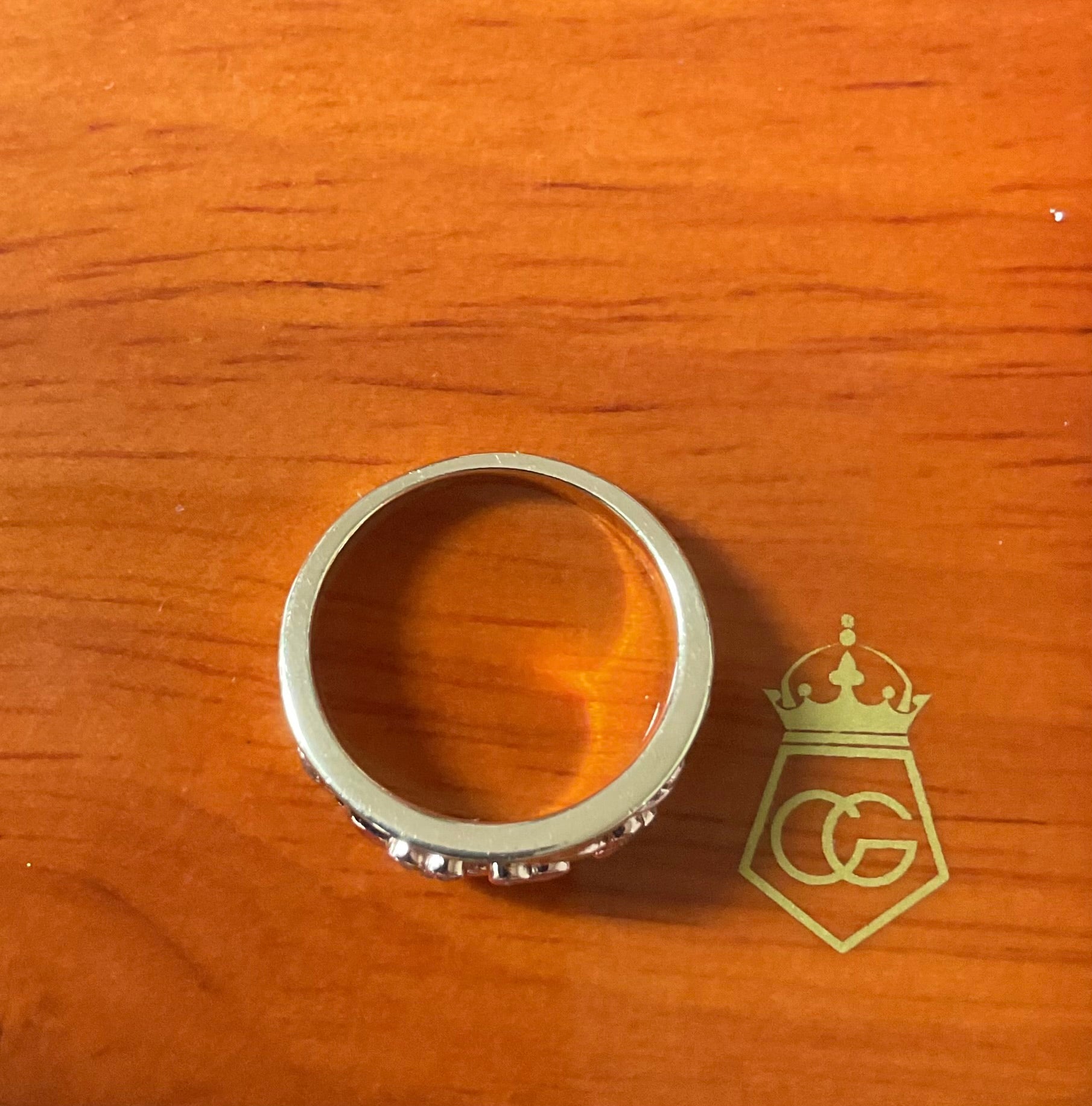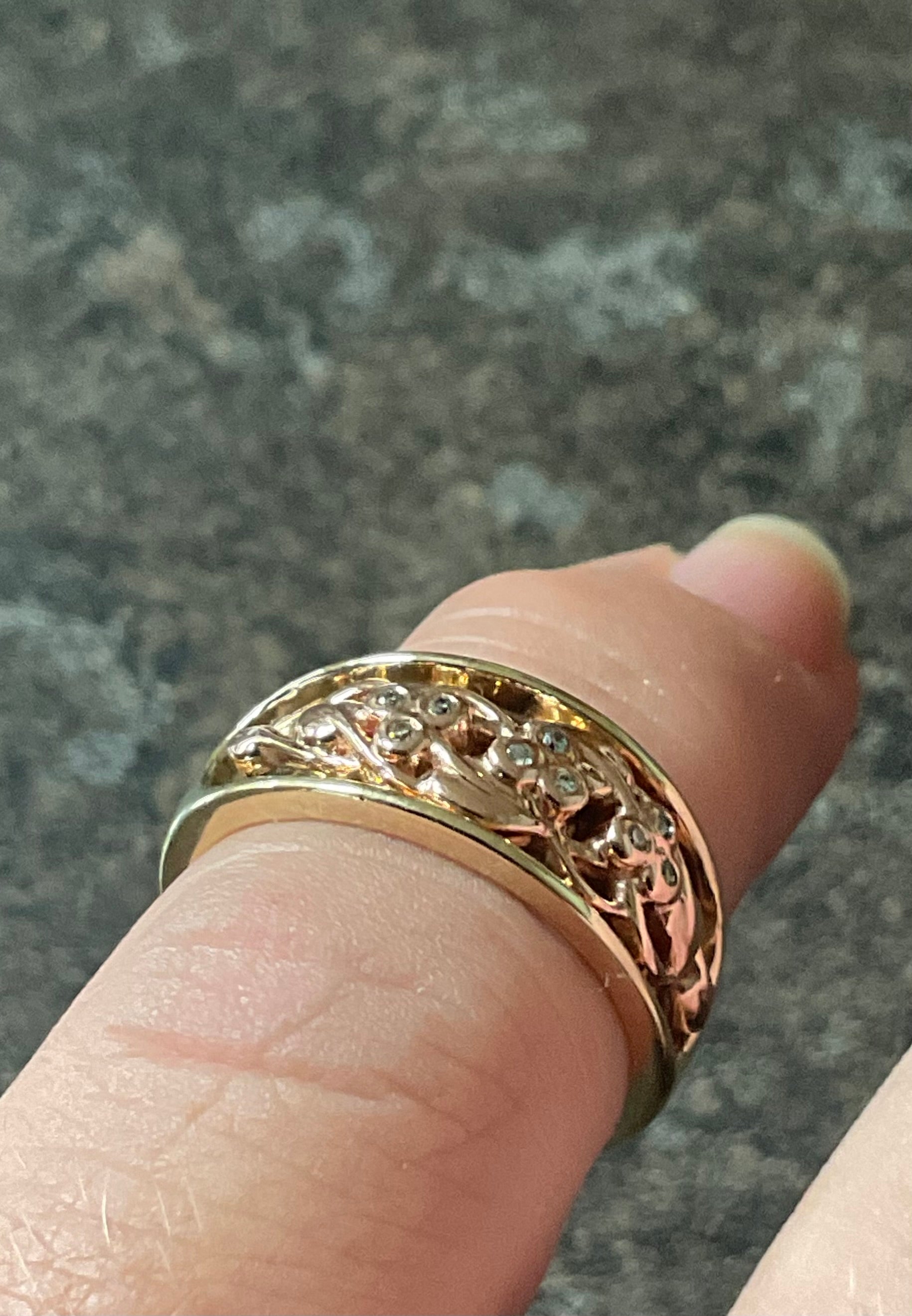 This beautiful ring was released to commemorate the Wedding of Prince William to Kate Middleton, as inside is engraved with the date ‘29th April 2011’. It is also engraved with the Welsh words ‘Cariad Am Byth’ which means ‘beloved forever’. Along the centre of the ring are 9 brilliant-cut, bright diamonds. These entwine with rose gold vines to symbolise the most touching moments of your life - past, present and future. The band is yellow gold and measures 8mm across at its widest. This band also has the Clogau gold hallmark inside. The ring is a size K and weighs a substantial 4.60g. It comes in the wooden Clogau box shown (that has small wear but is in good condition), the little certificate booklet and the certificate that was released with this specific ring. The ring has been worn and whilst it is in good overall condition, there are signs of wear/dinks in the surface of the band that are visible by eye when you look for them.