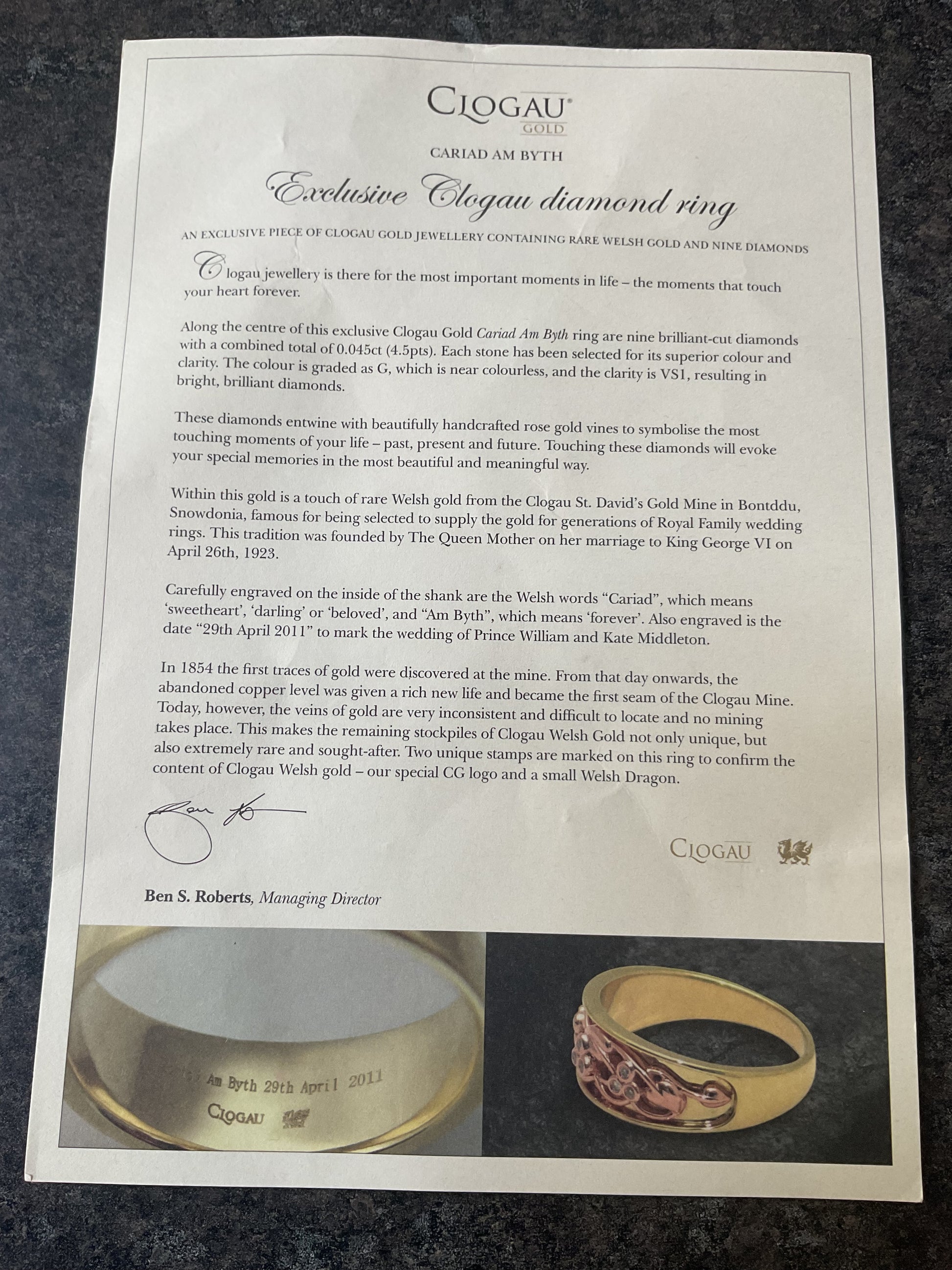 Clogau 9ct Cariad Am Byth Diamond ring to mark wedding of Prince William & Kate Middleton size K with certificate