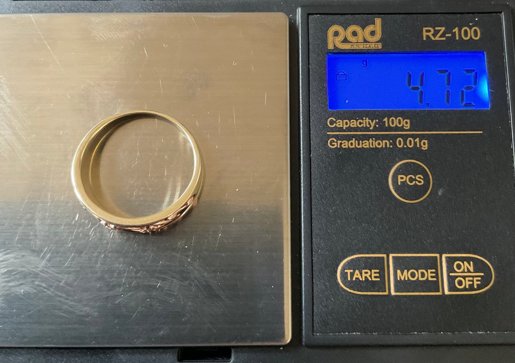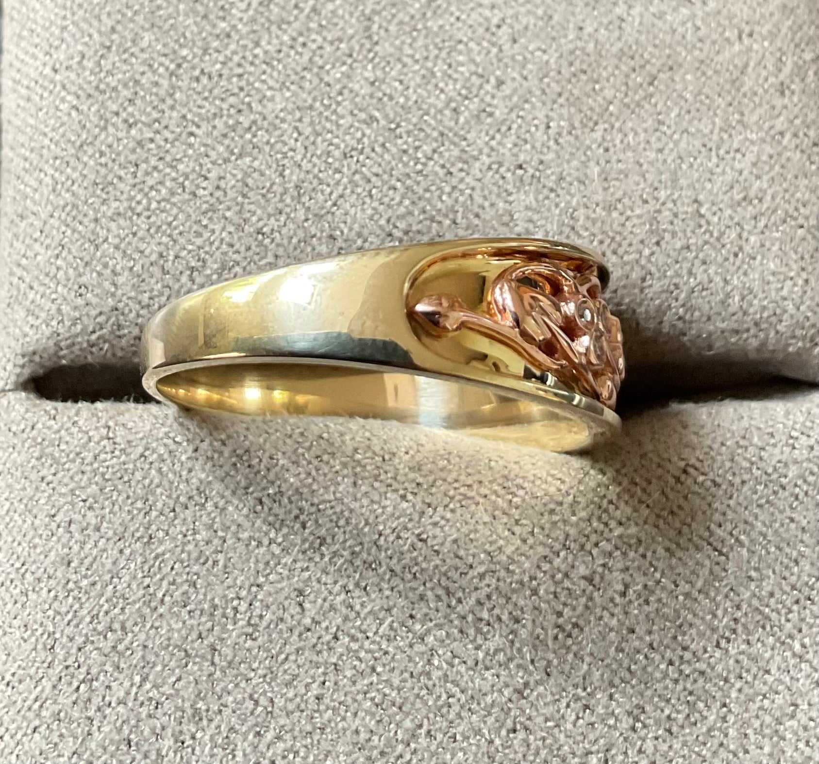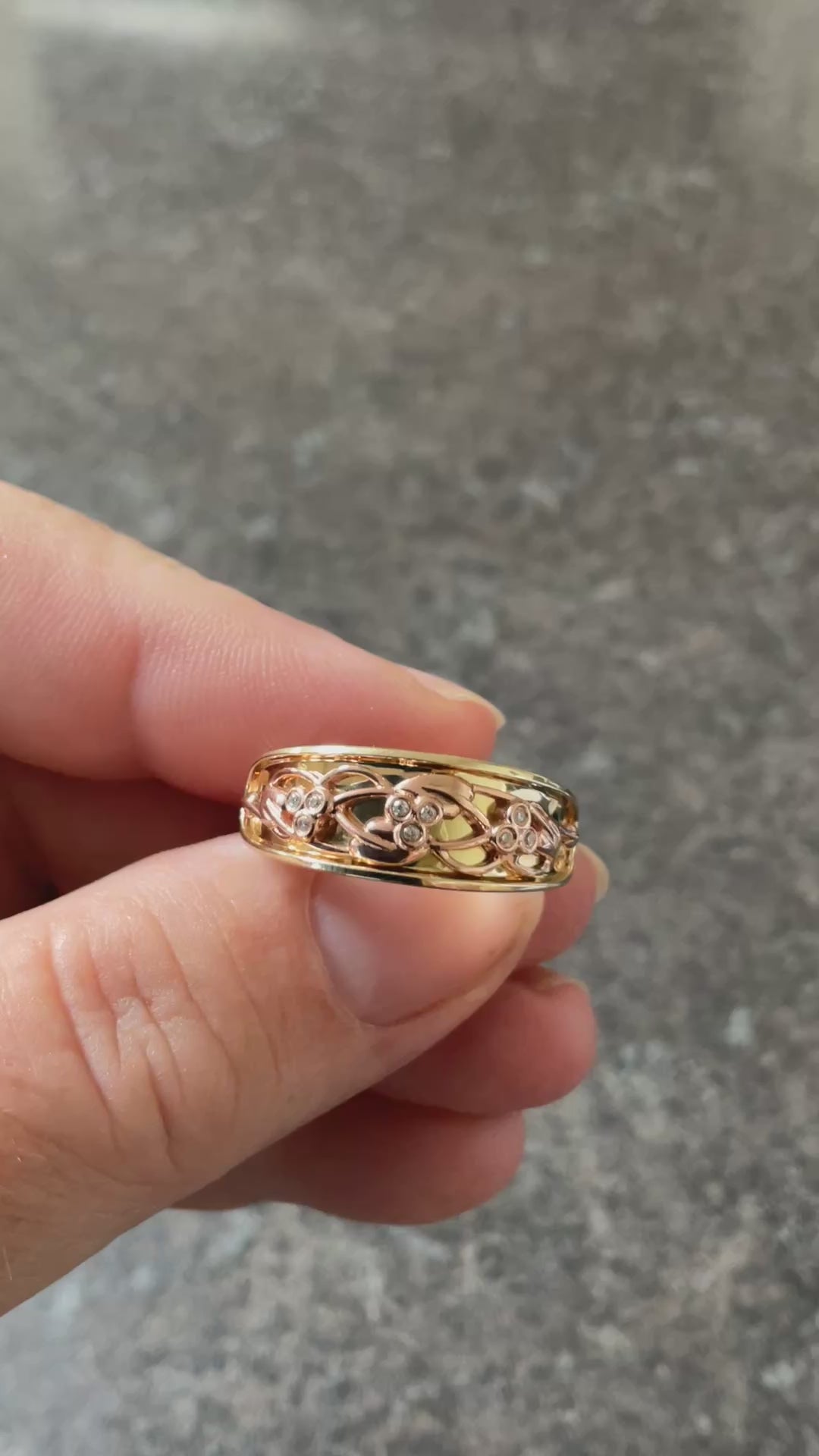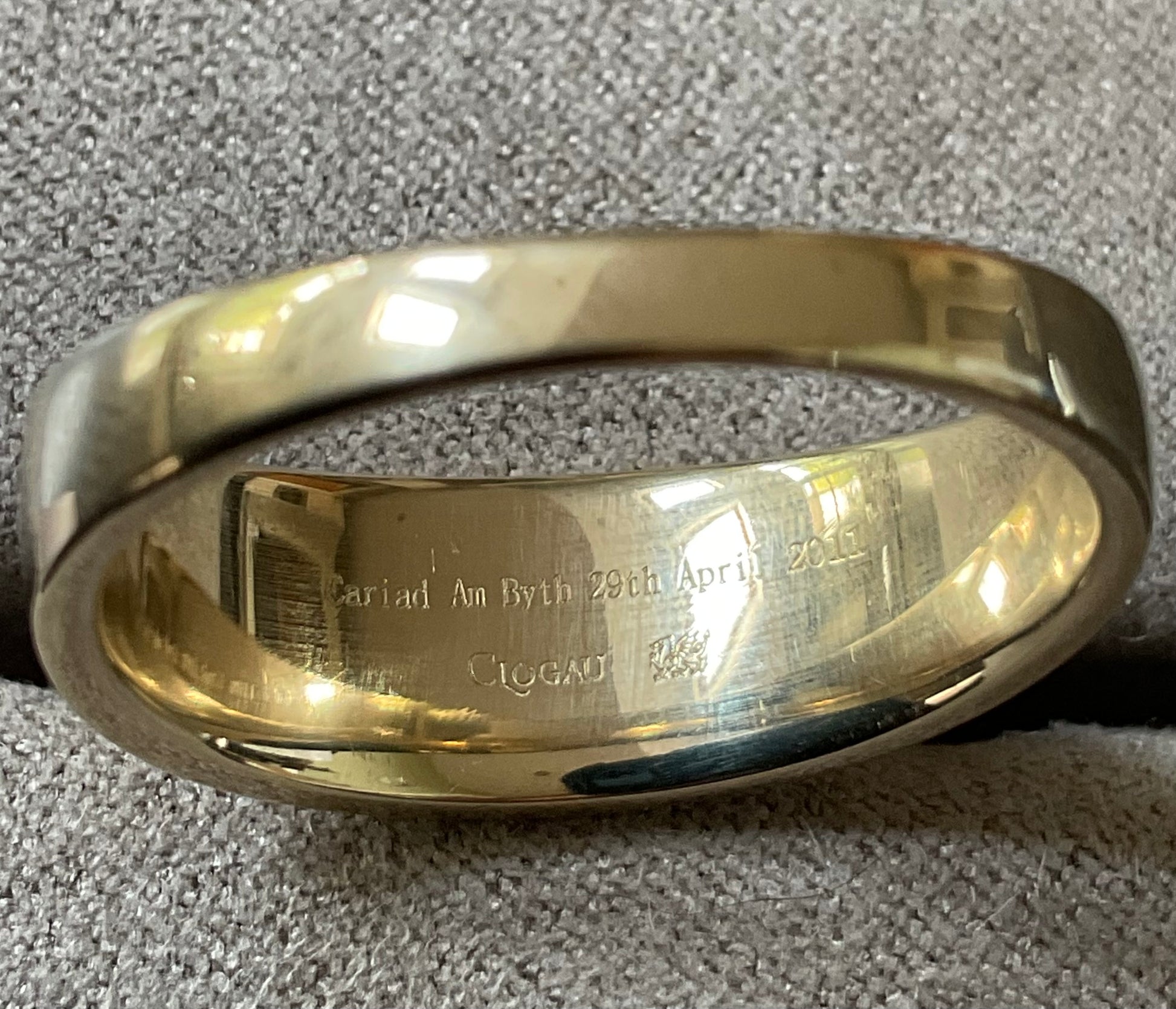 This beautiful ring was released to commemorate the Wedding of Prince William to Kate Middleton, as inside is engraved with the date ‘29th April 2011’. It is also engraved with the Welsh words ‘Cariad Am Byth’ which means ‘beloved forever’. Along the centre of the ring are 9 brilliant-cut, bright diamonds. These entwine with rose gold vines to symbolise the most touching moments of your life - past, present and future. The band is yellow gold and measures 8mm across at its widest. This band also has the Clogau gold hallmark inside. The ring is a size U and weighs a substantial 4.72g. It will come in a Clogau box. This ring is in excellent condition, you need to look very closely for any signs of wear.